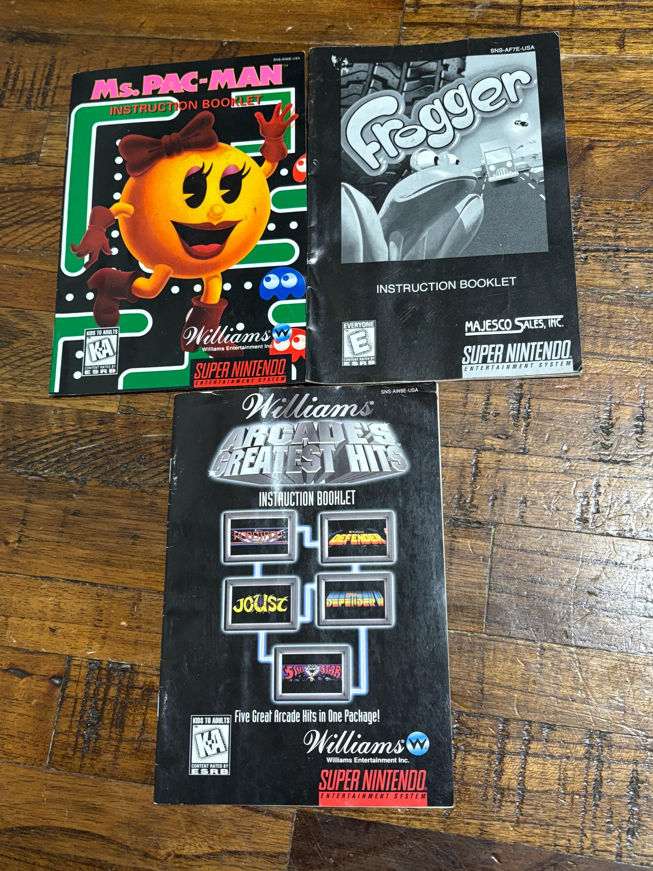 VISIT jaxinabox.com FOR ALL OUR LISTINGS!Lot of 3 SNES Super Nintendo Manuals Frogger Mrs Pacman aracdes greatest hits