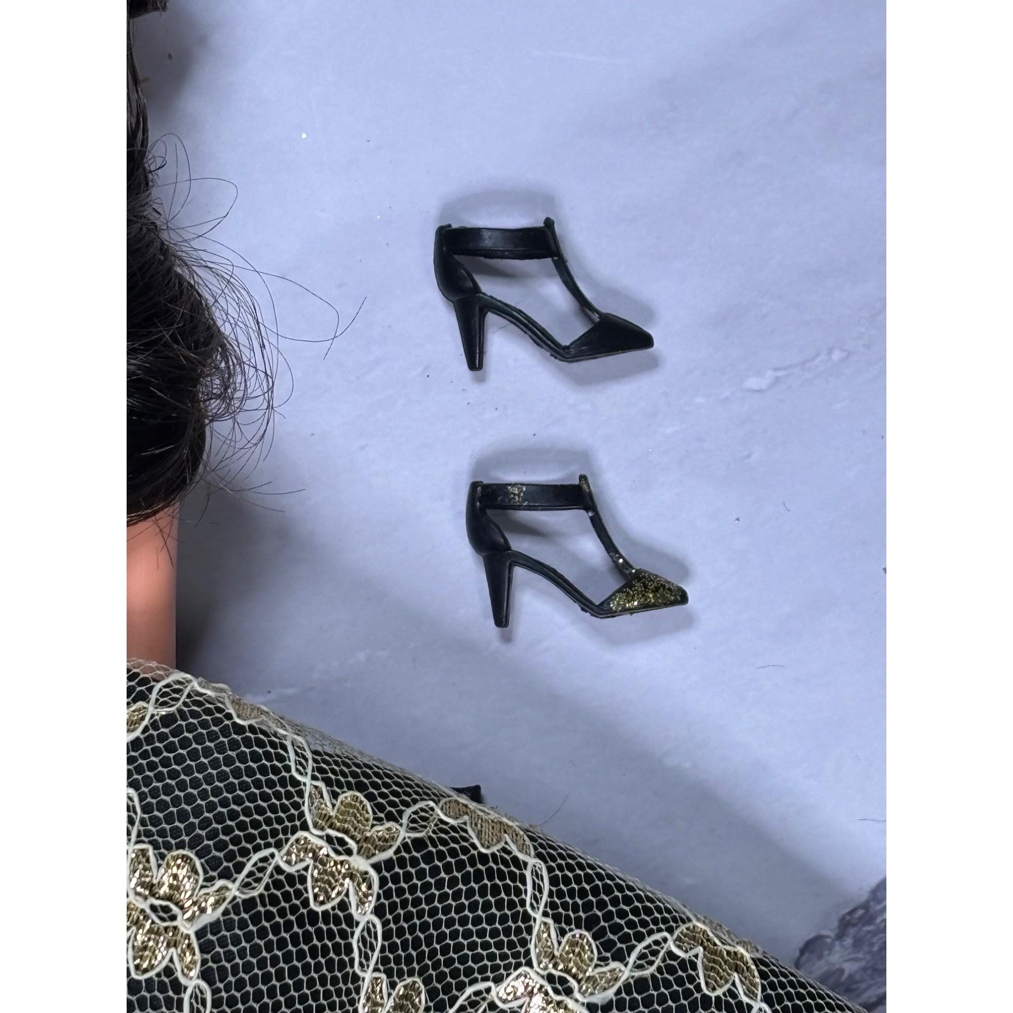 VISIT jaxinabox.com FOR ALL OUR LISTINGS!Black Gold Dress Black Hair Barbie Doll glitter Shoes Scarf Wrap Shawl