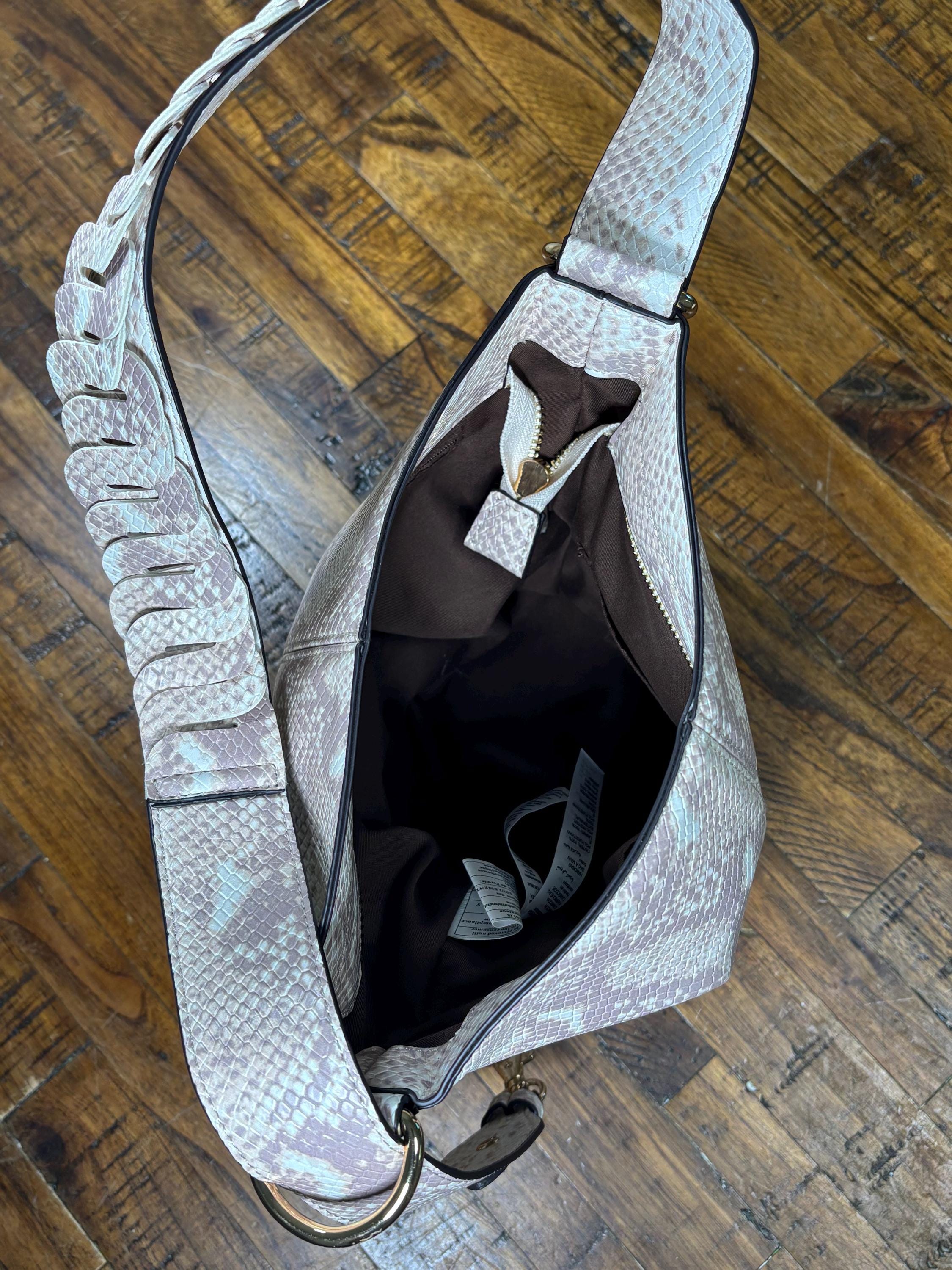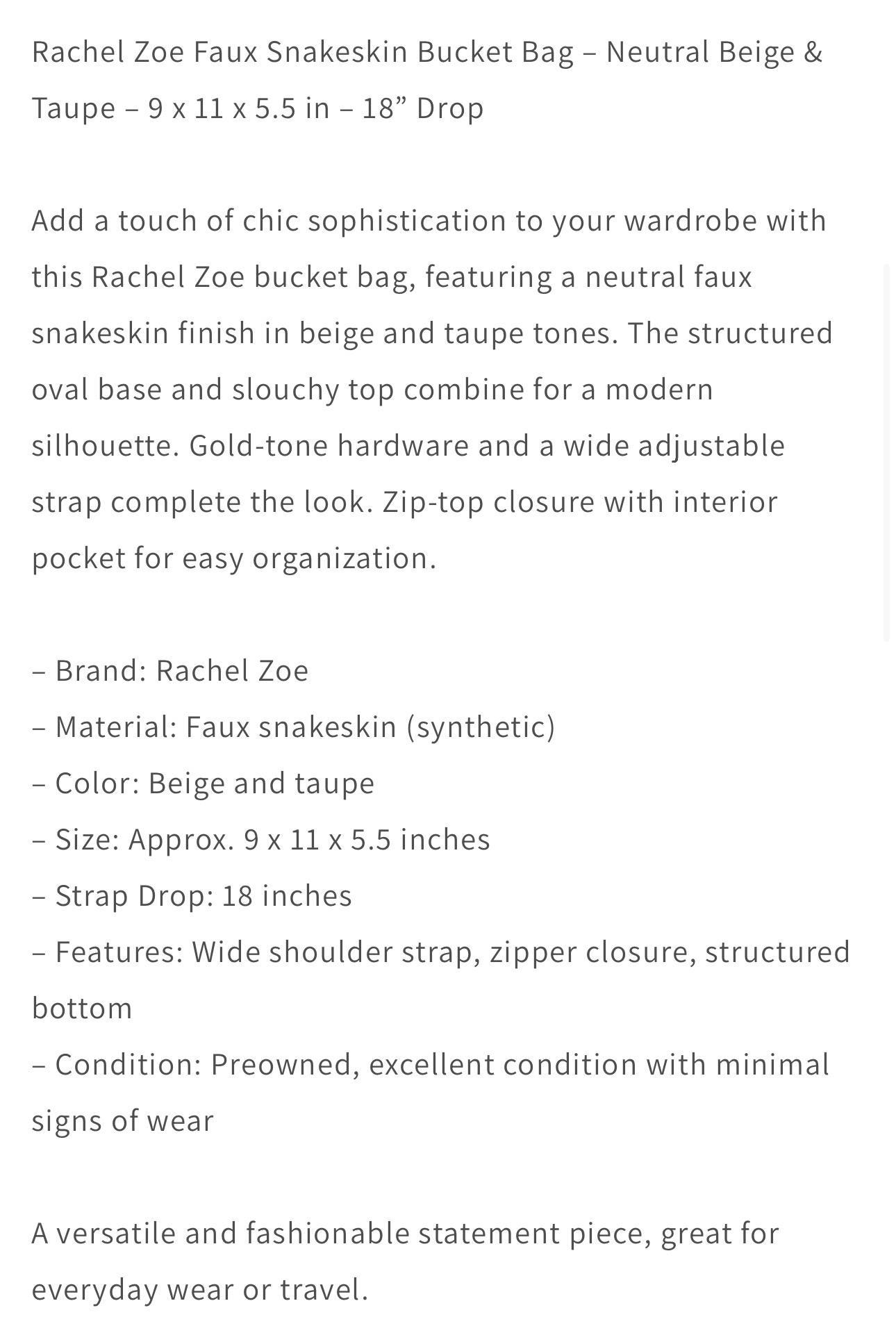 VISIT jaxinabox.com FOR ALL OUR LISTINGS!Rachel Zoe NWT Livia Snakeskin Bucket Bag Open Natural