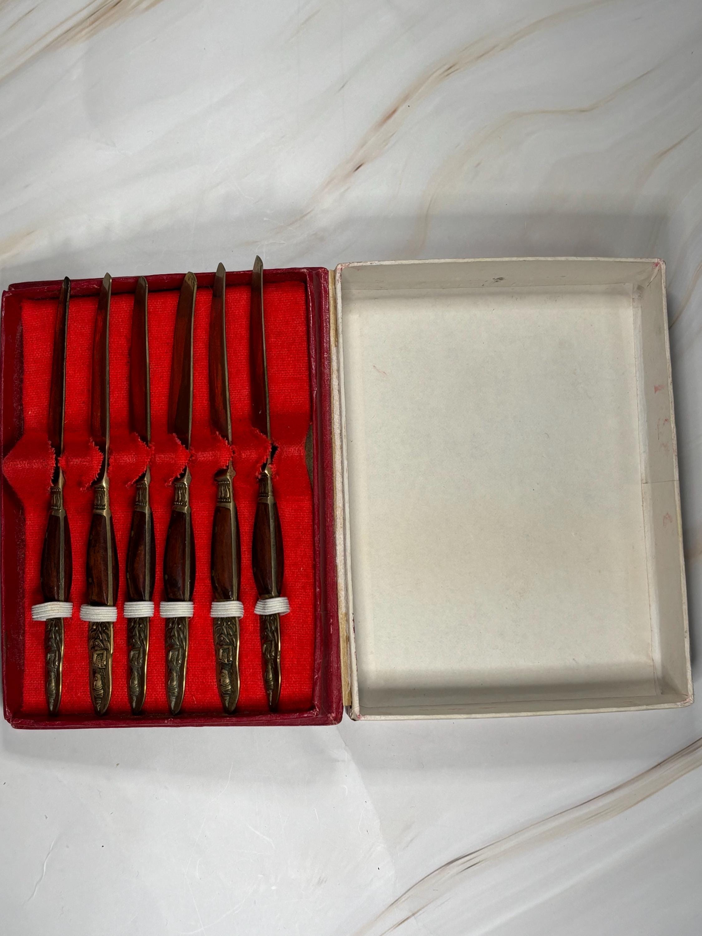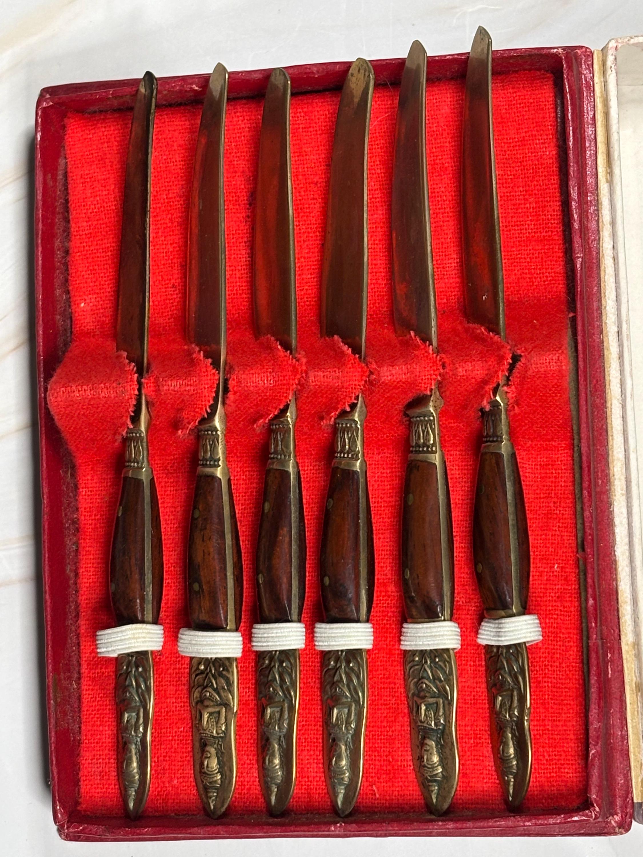 VISIT jaxinabox.com FOR ALL OUR LISTINGS!Set of 6 Vintage Thailand Siam Knife Set Rosewood Nickel Bronze 1950s