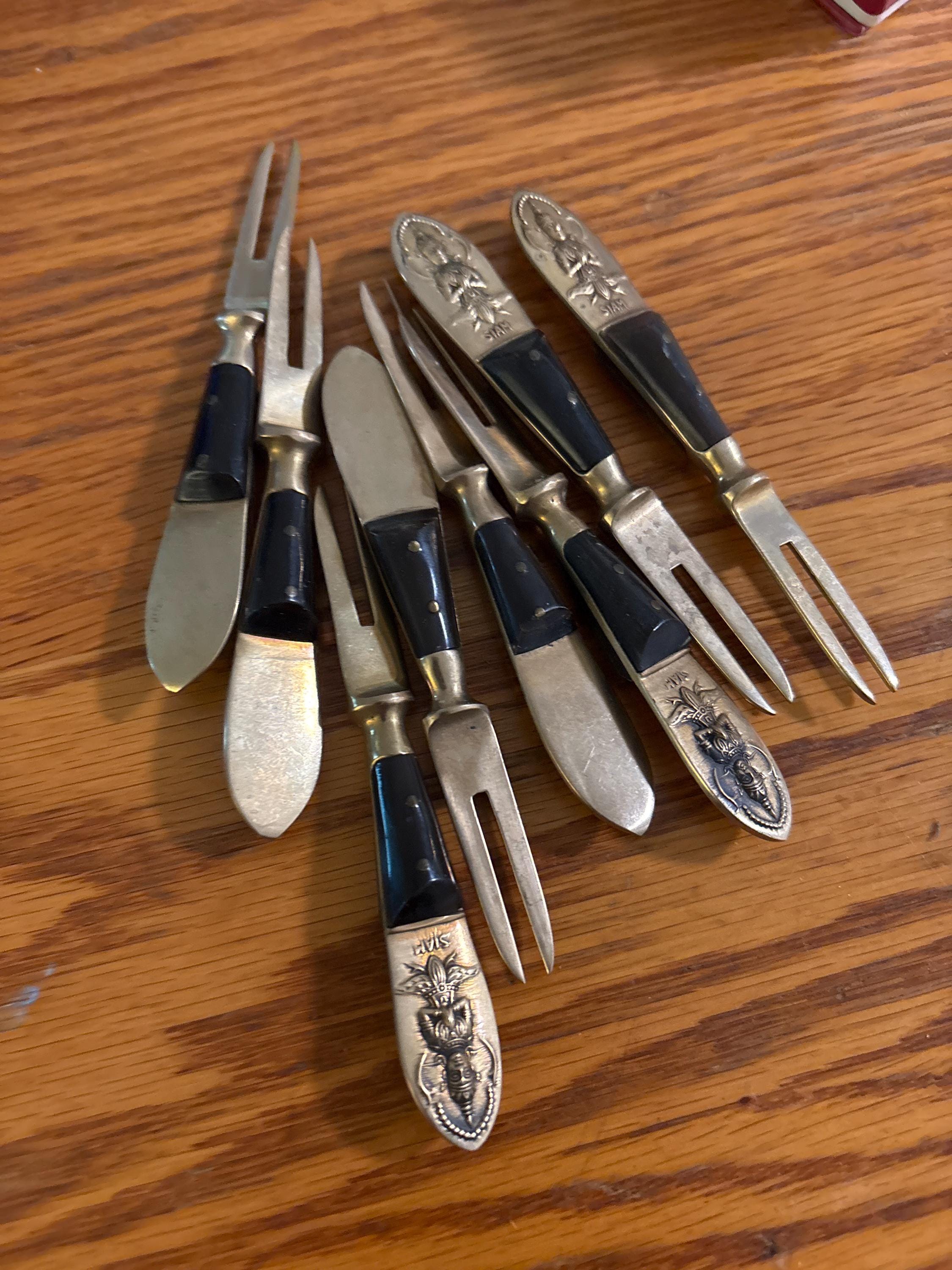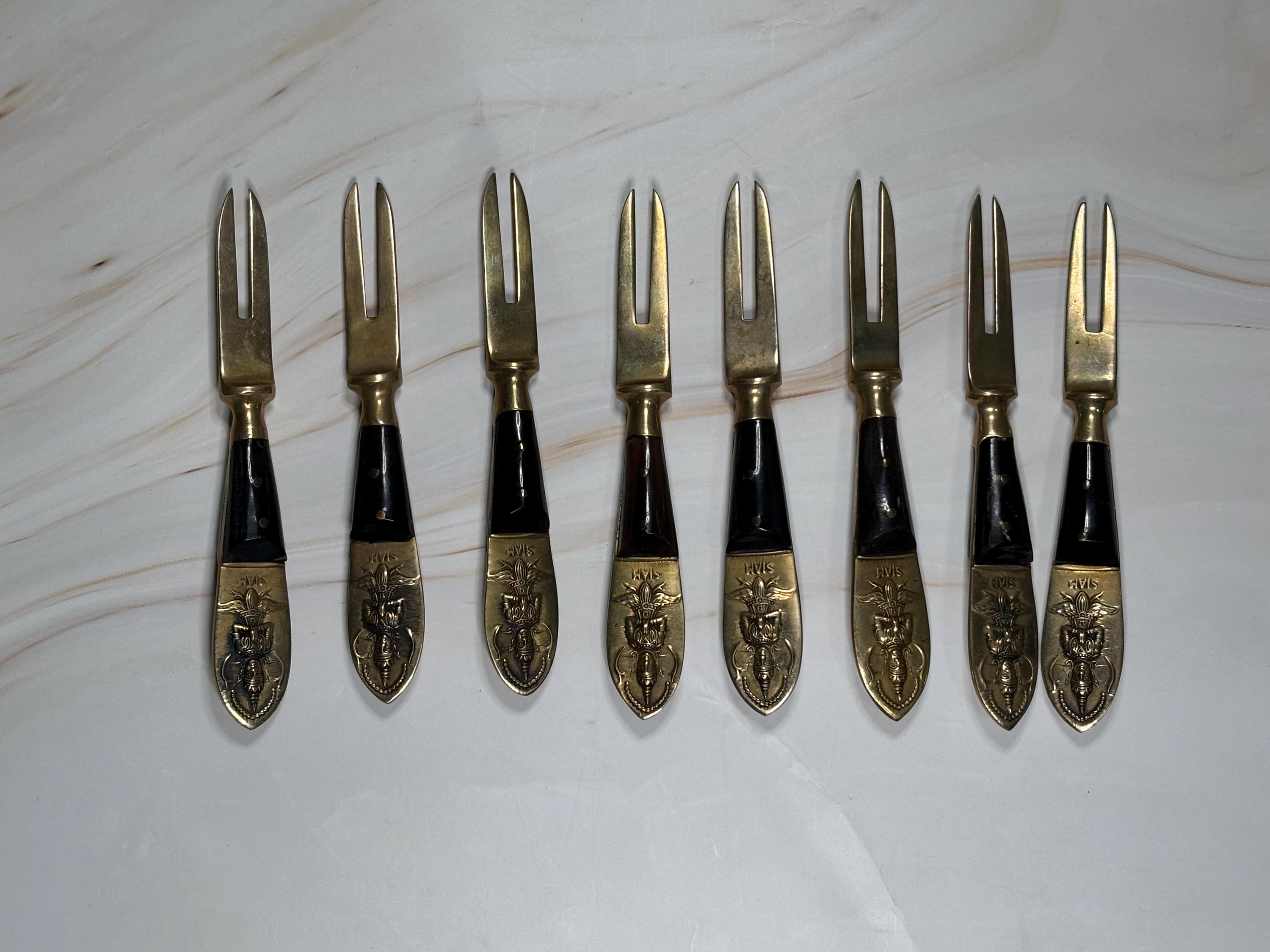 VISIT jaxinabox.com FOR ALL OUR LISTINGS!Set of 8 Vintage Thailand Siam Appetizer Fork Rosewood Nickel Bronze 1950s 1960s
