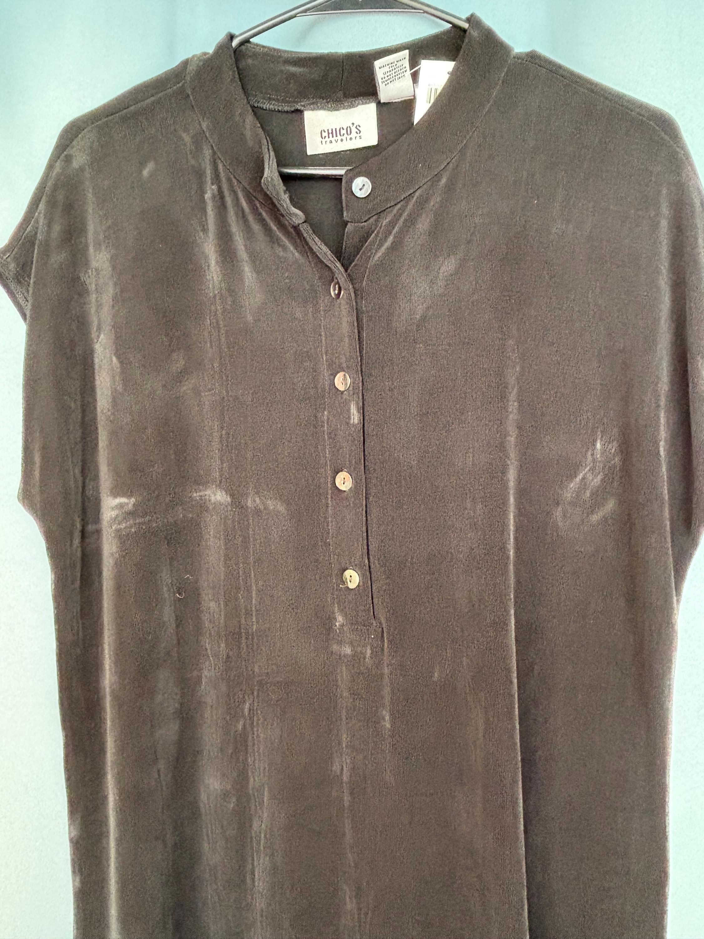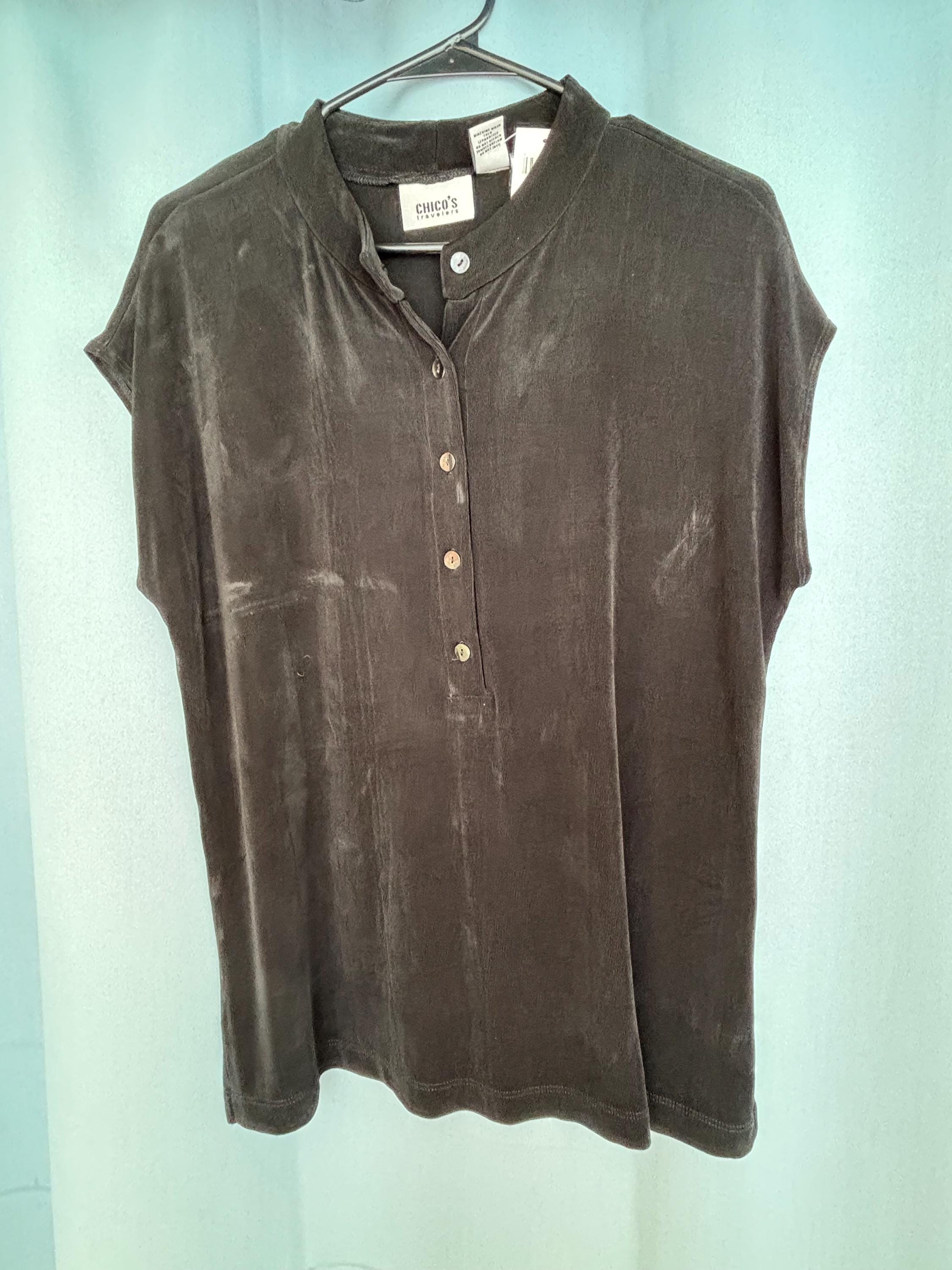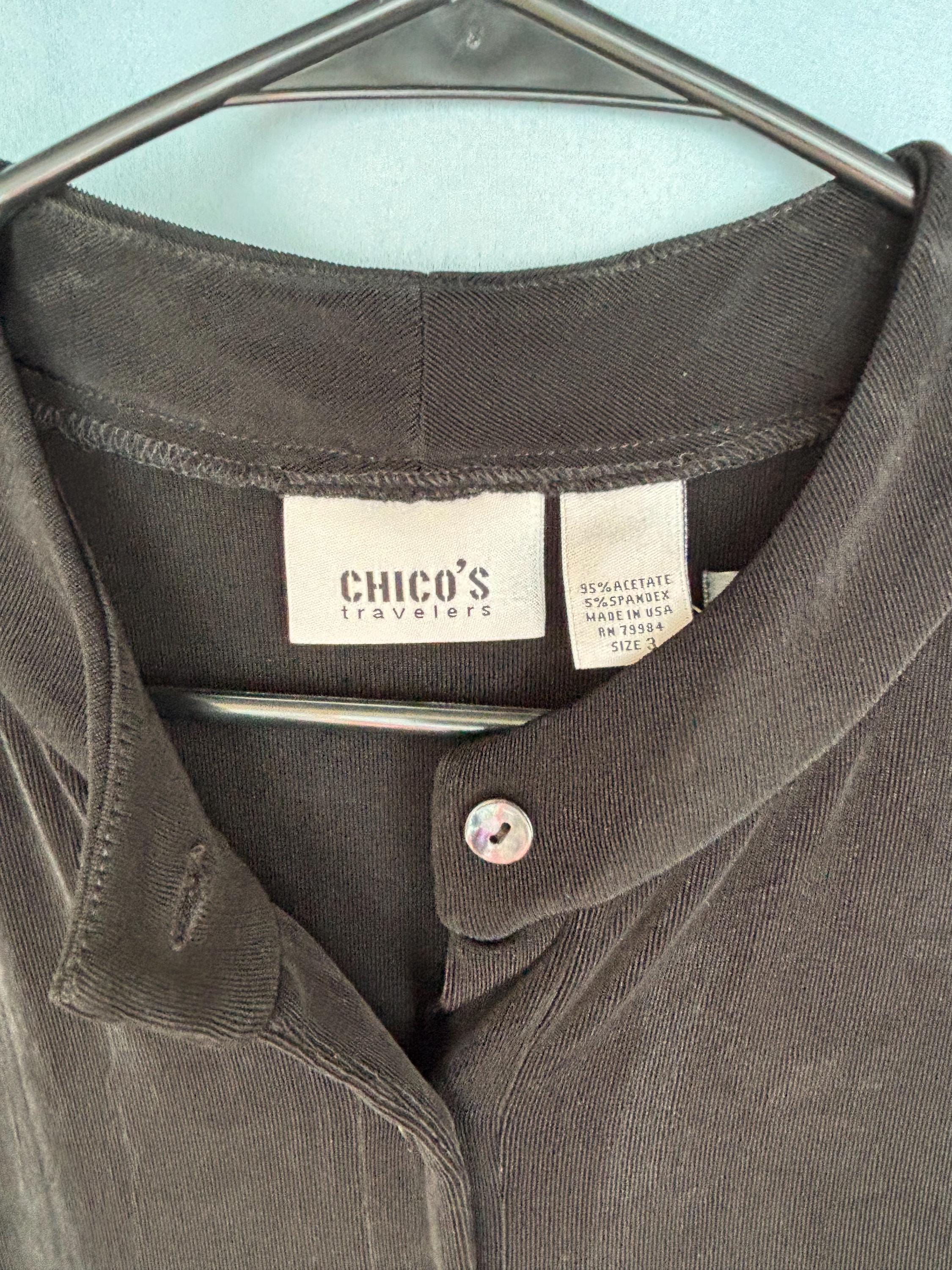 VISIT jaxinabox.com FOR ALL OUR LISTINGS!Vintage Chico's Black Travelers Size 3 Cap Sleeve Button Front SS Top Mandy NWT