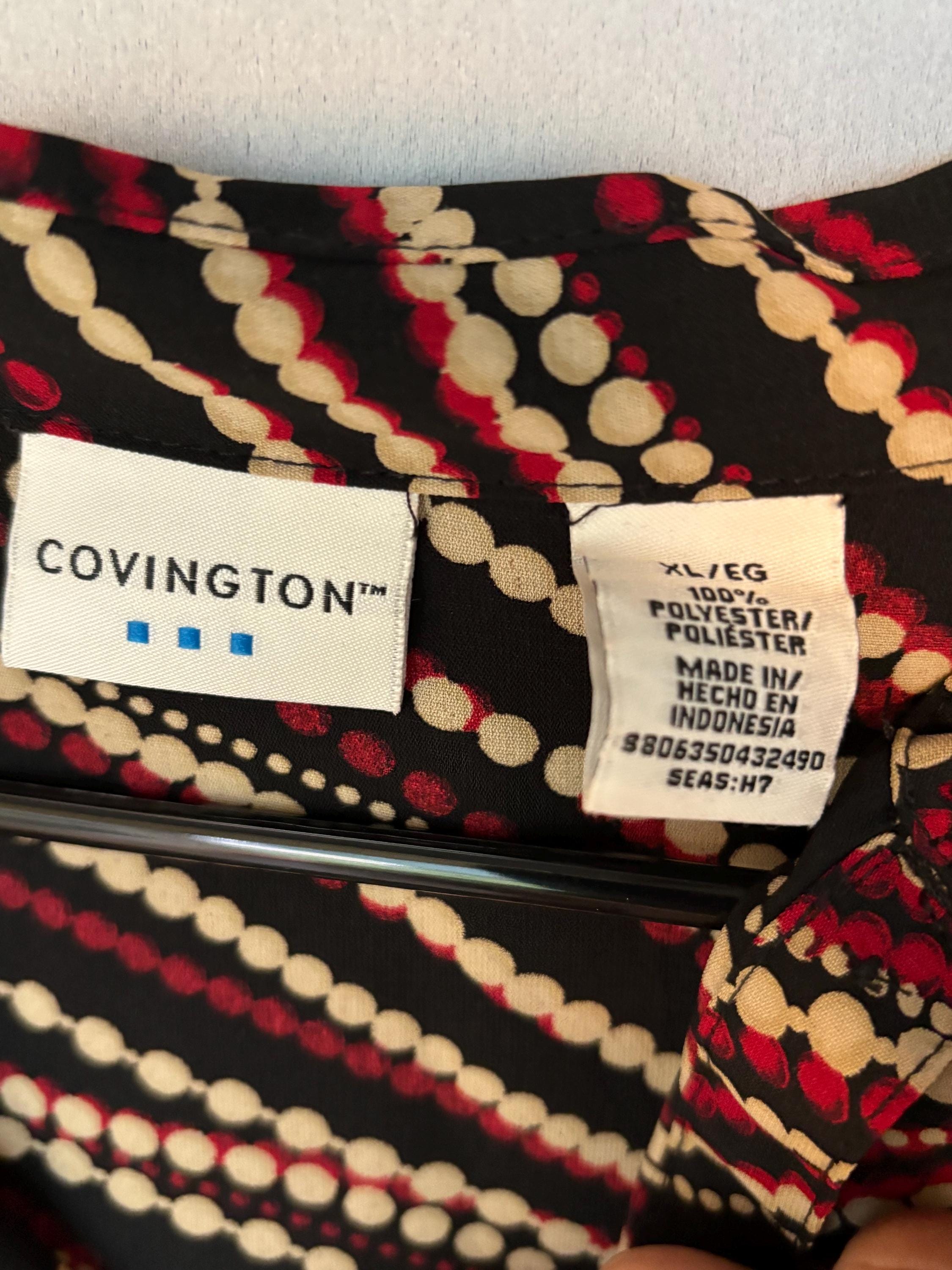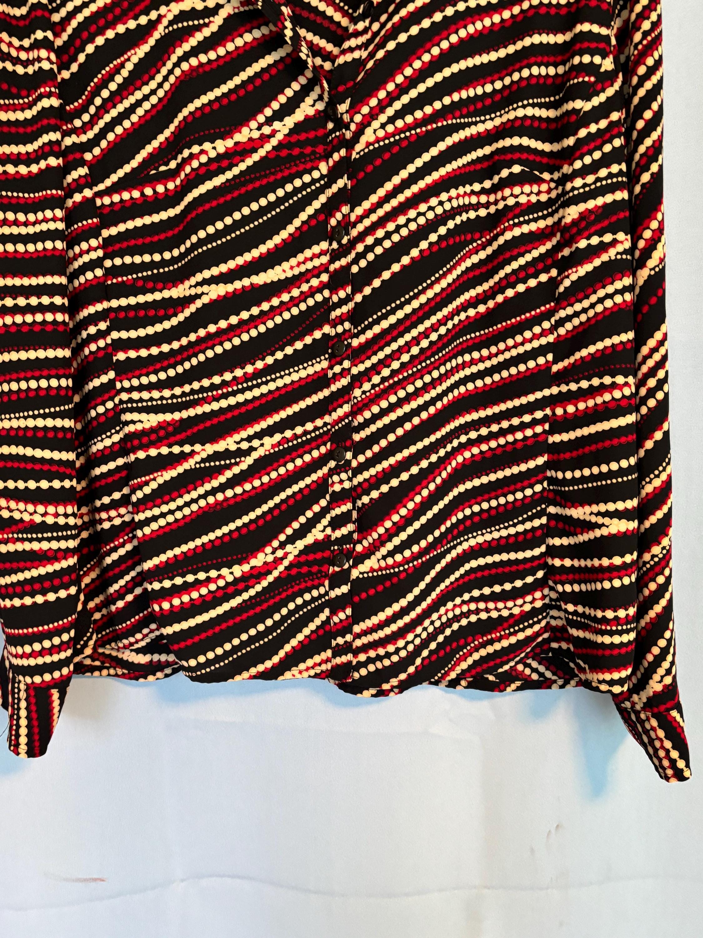 VISIT jaxinabox.com FOR ALL OUR LISTINGS!Vintage Covington Women’s Red Black Gold Striped Long Sleeve Button-Up Blouse XL