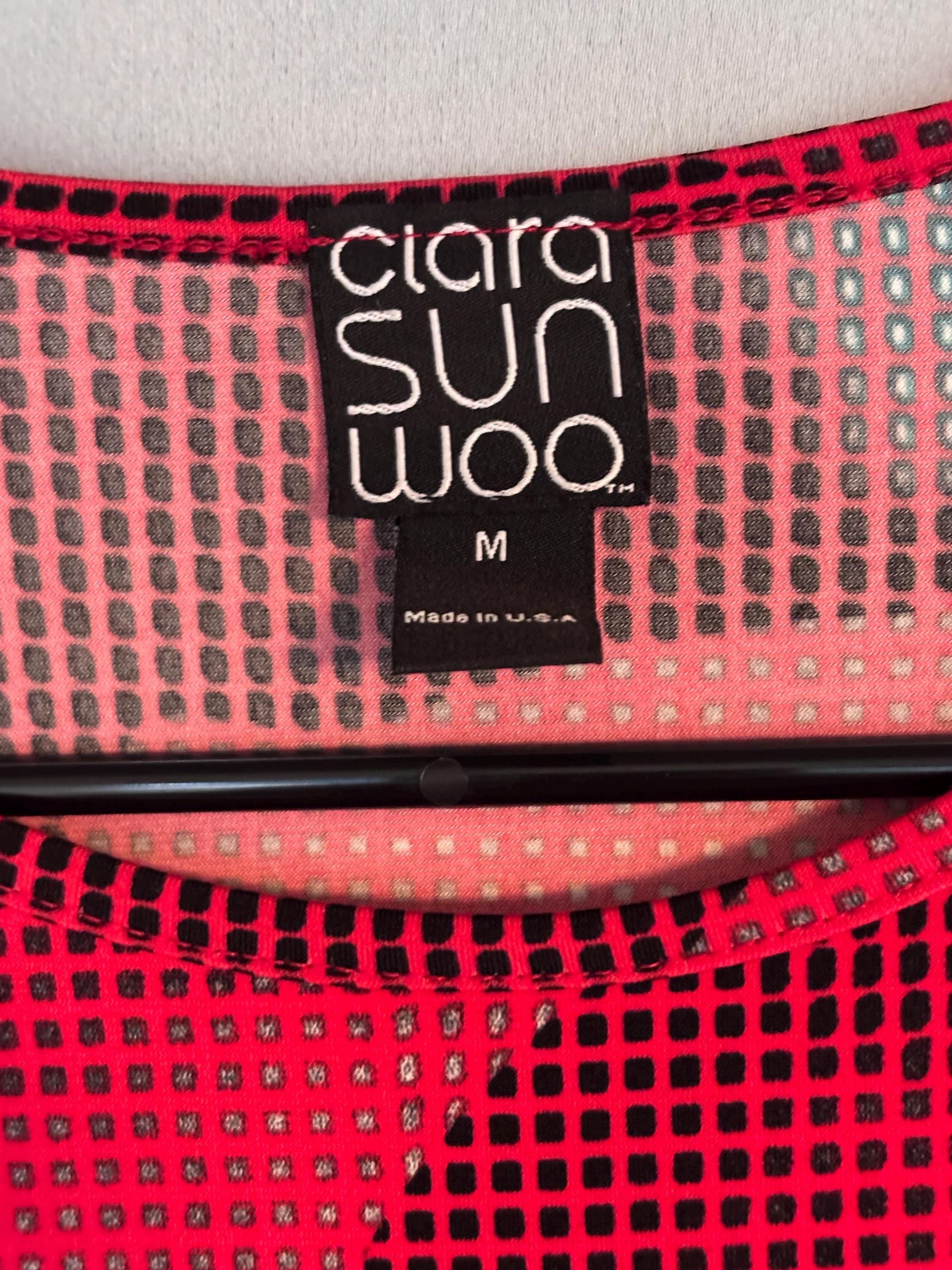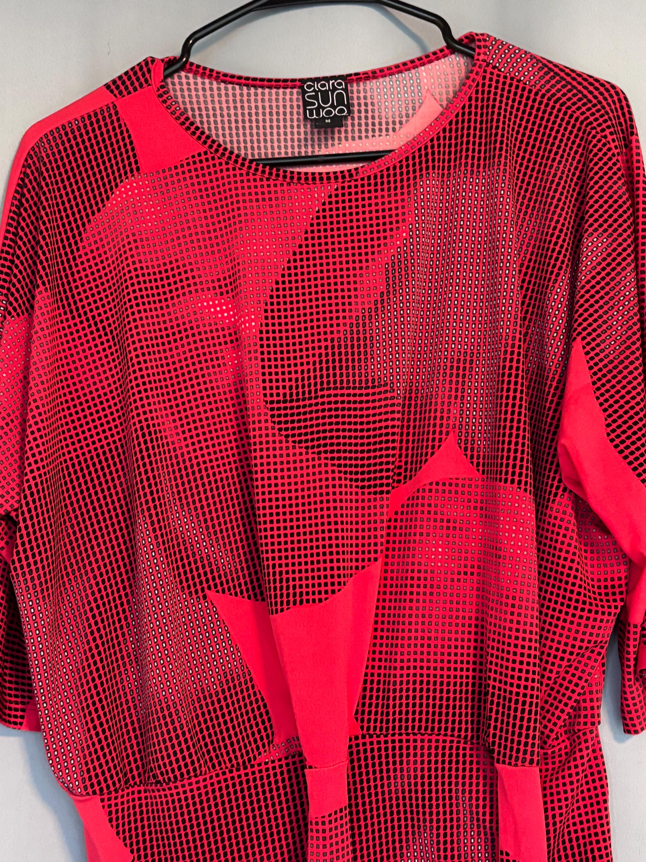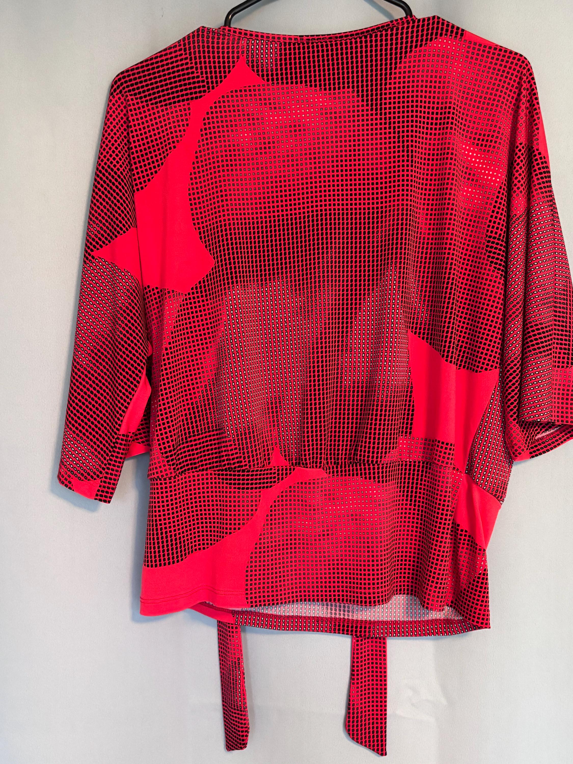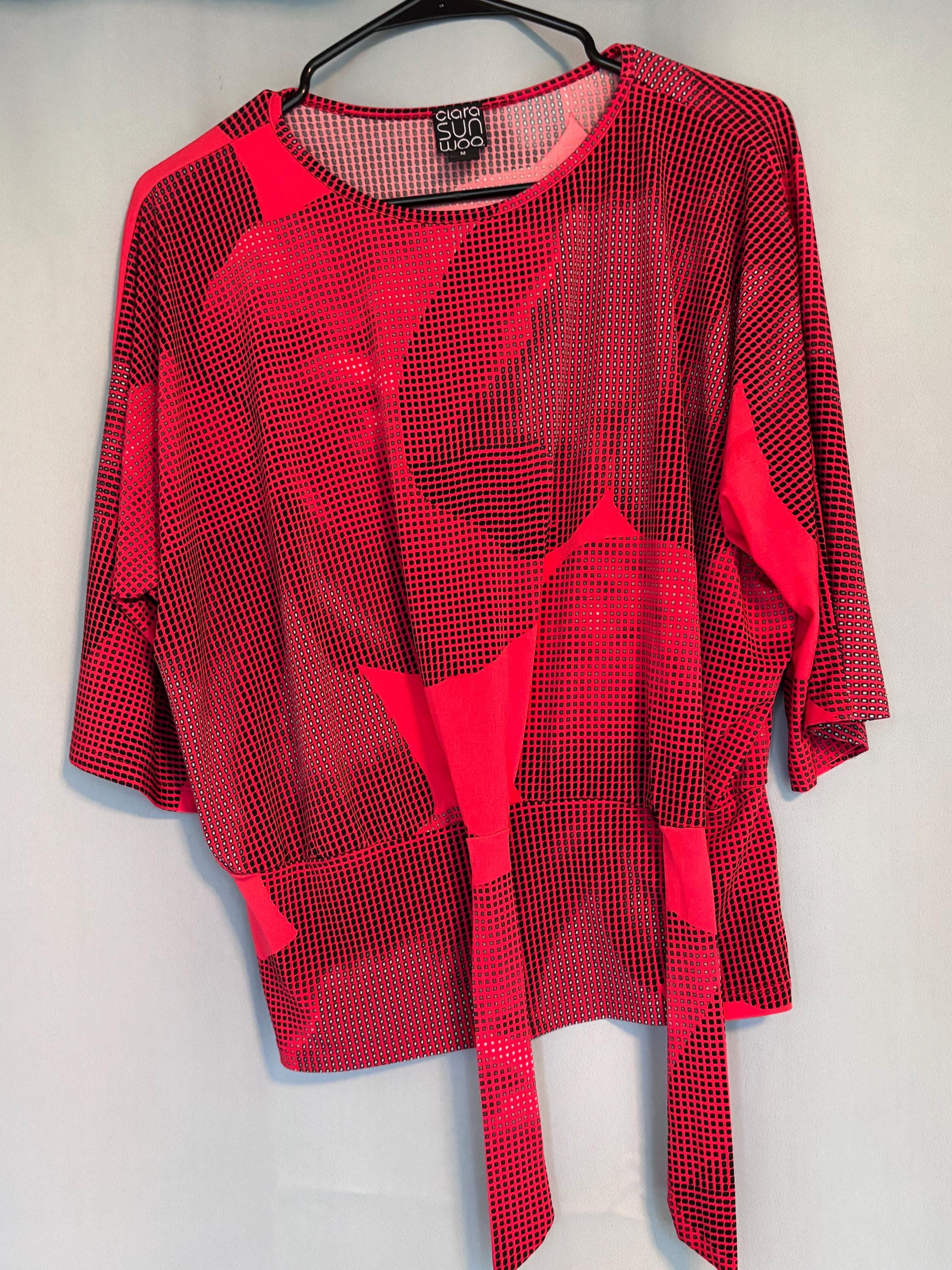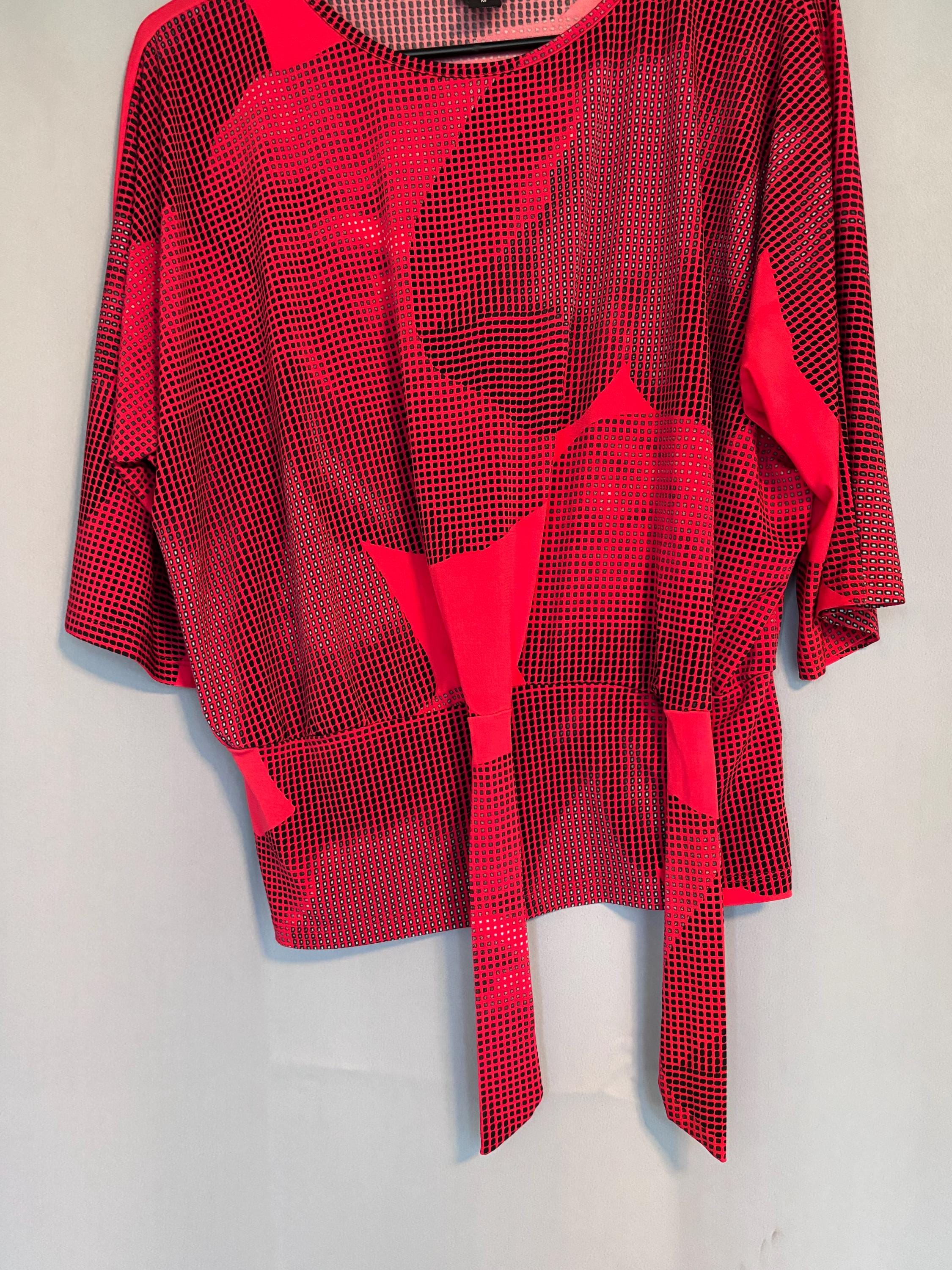 VISIT jaxinabox.com FOR ALL OUR LISTINGS!Clara Sun Woo Top Red Print Tie Waist Knot Stretch Dolman USA Medium M