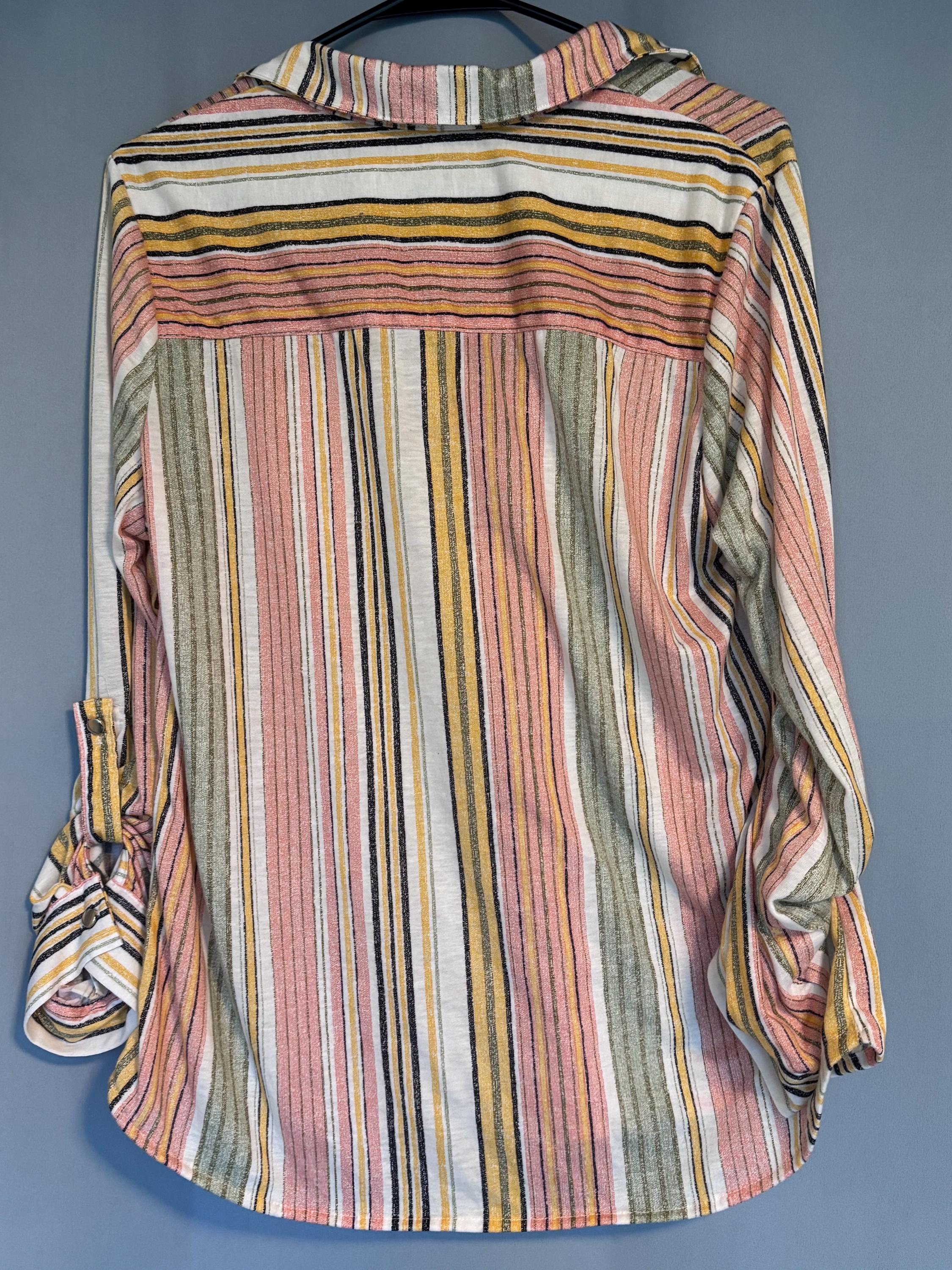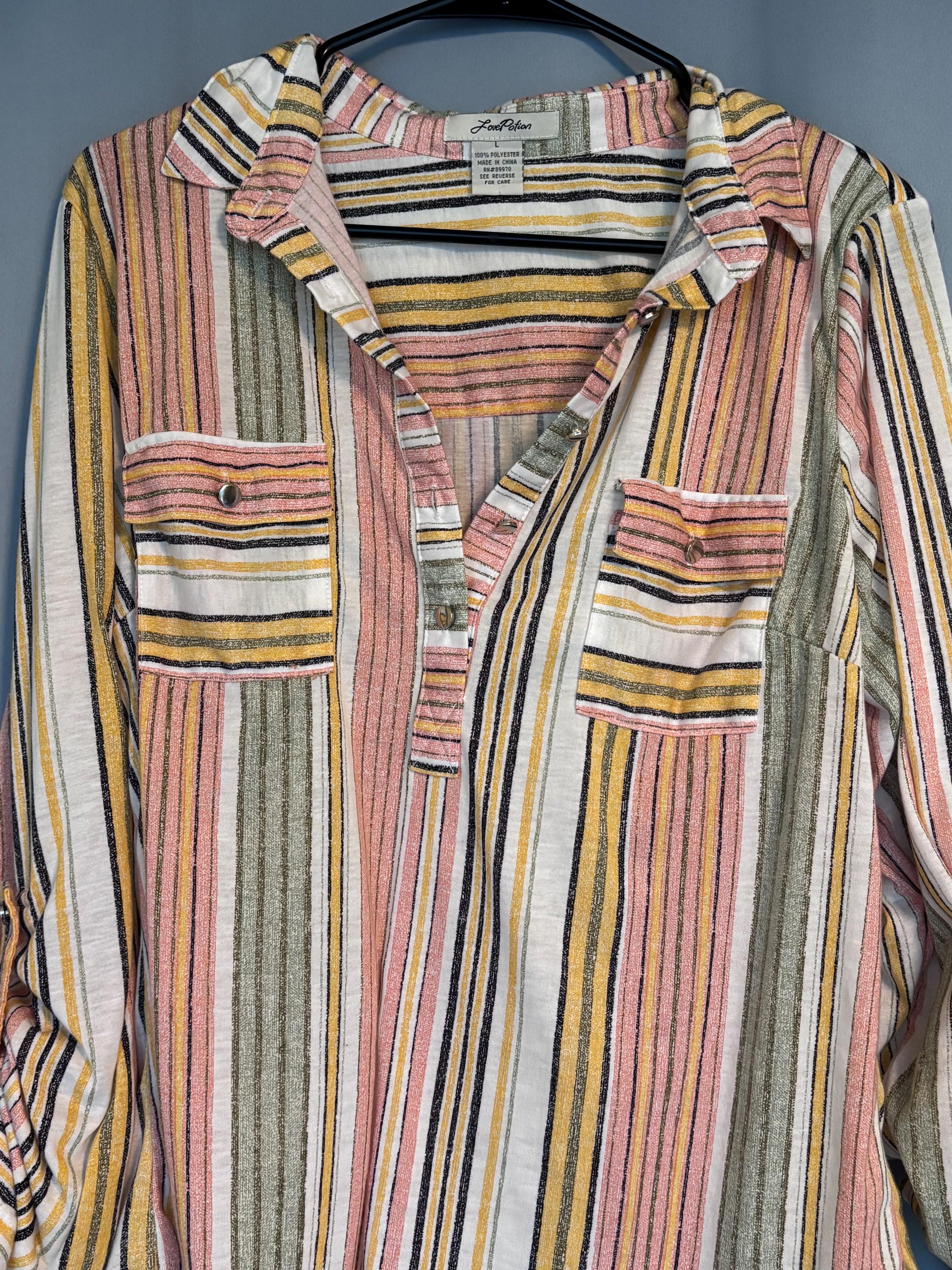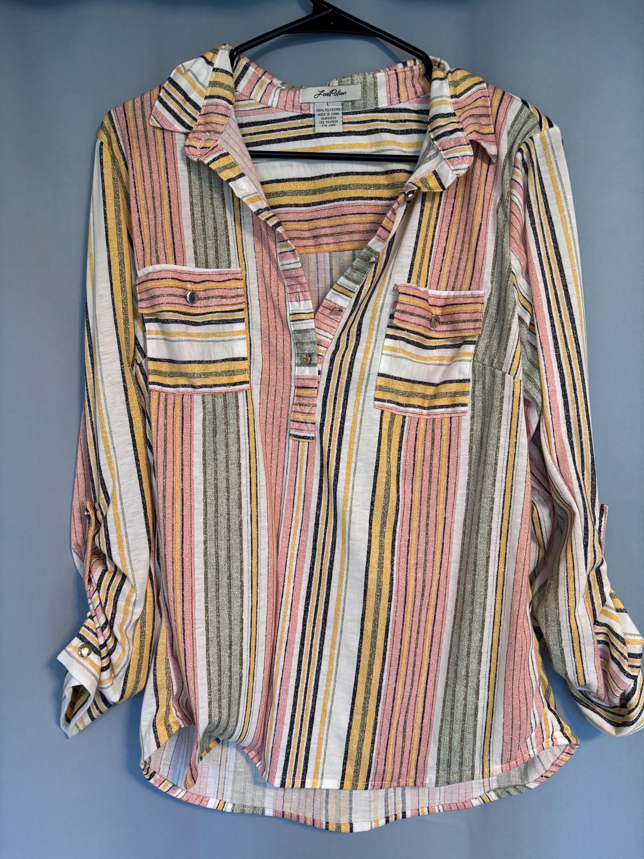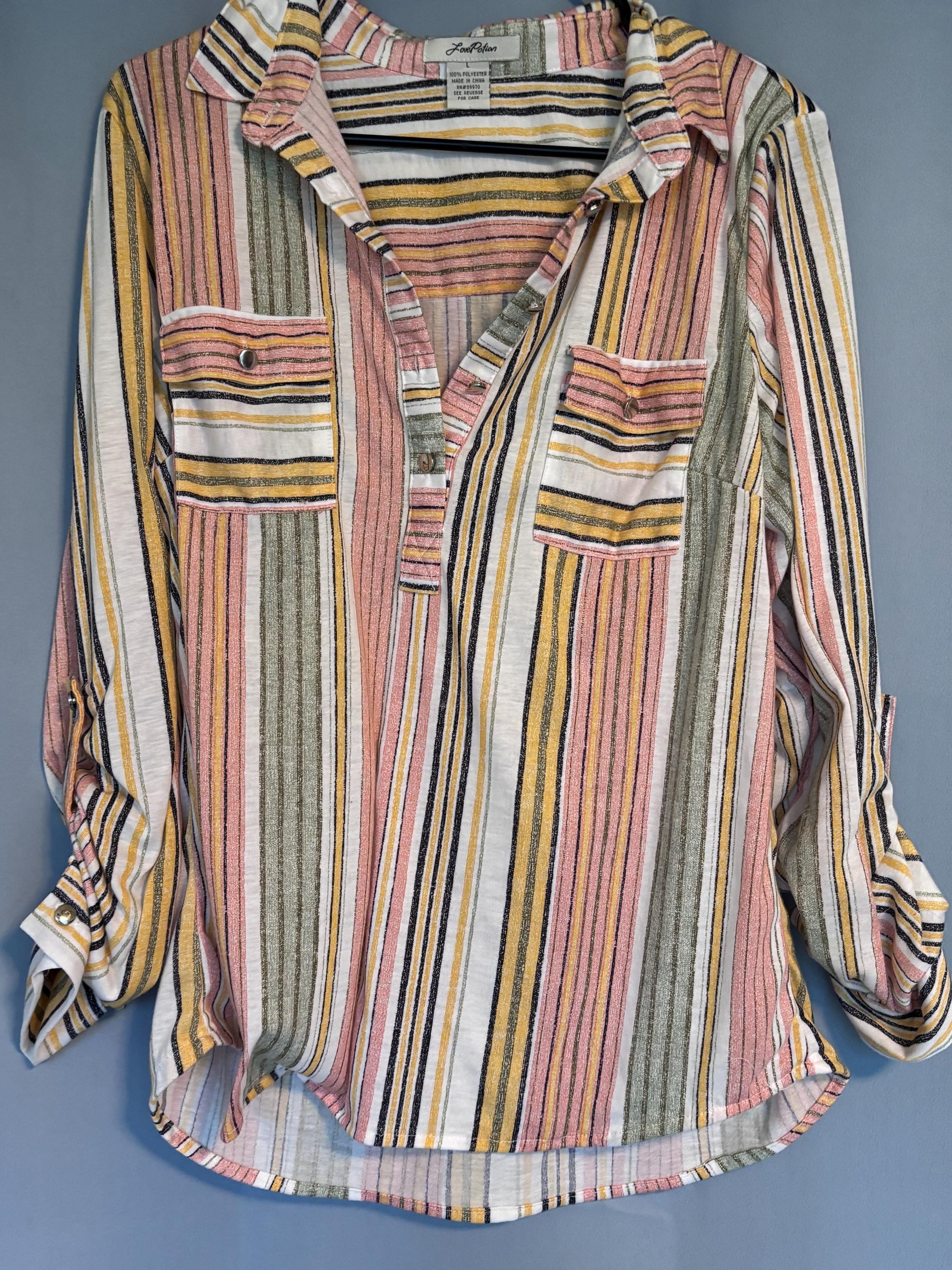 VISIT jaxinabox.com FOR ALL OUR LISTINGS!Love Potion Shirt Coral Stripe V Neck Lightweight Button down Tab Sleeves L
