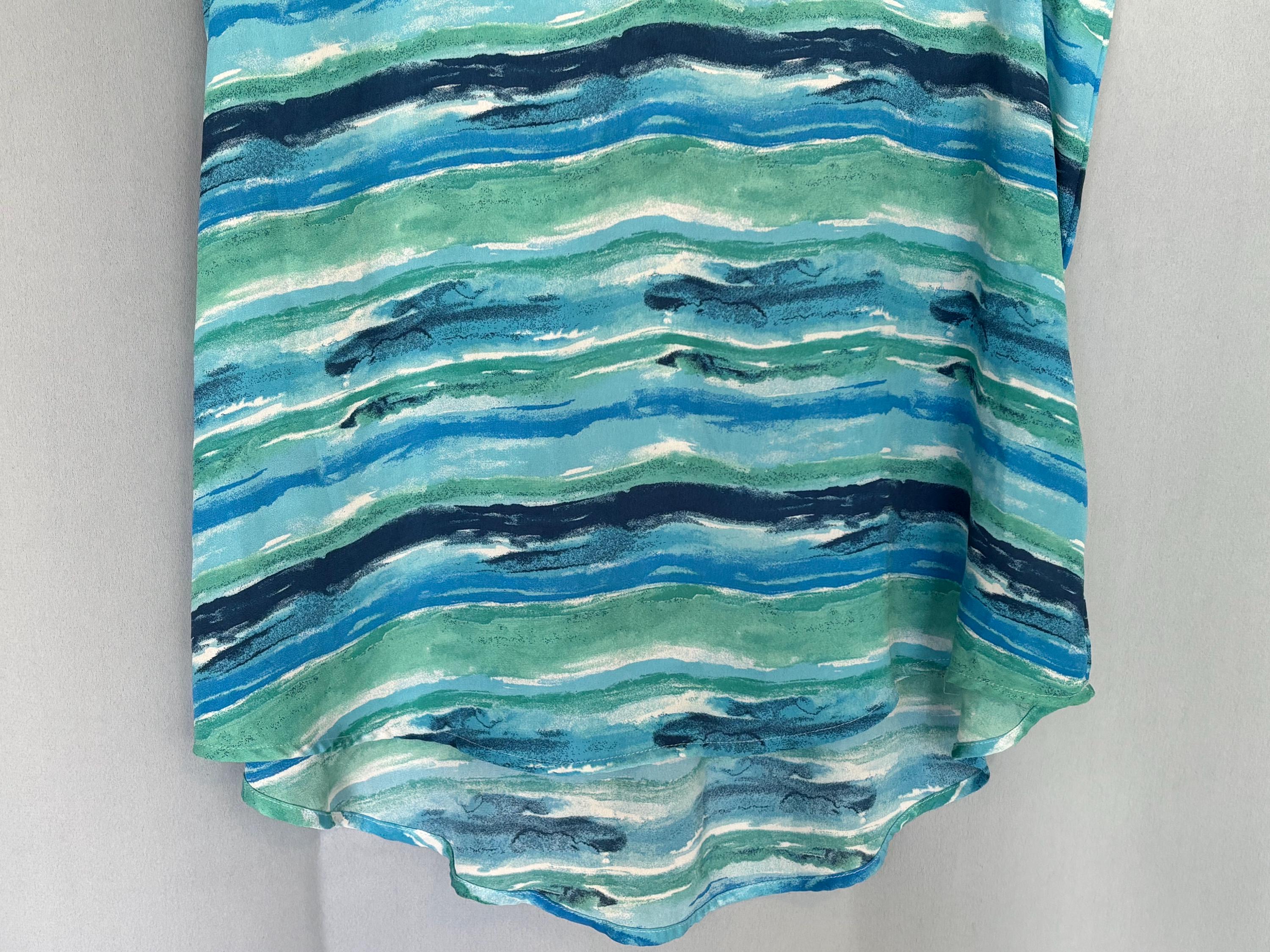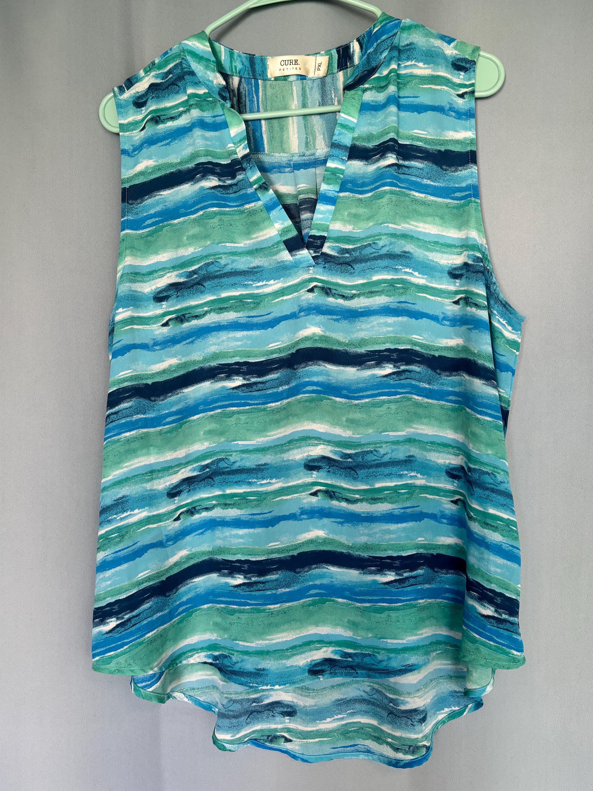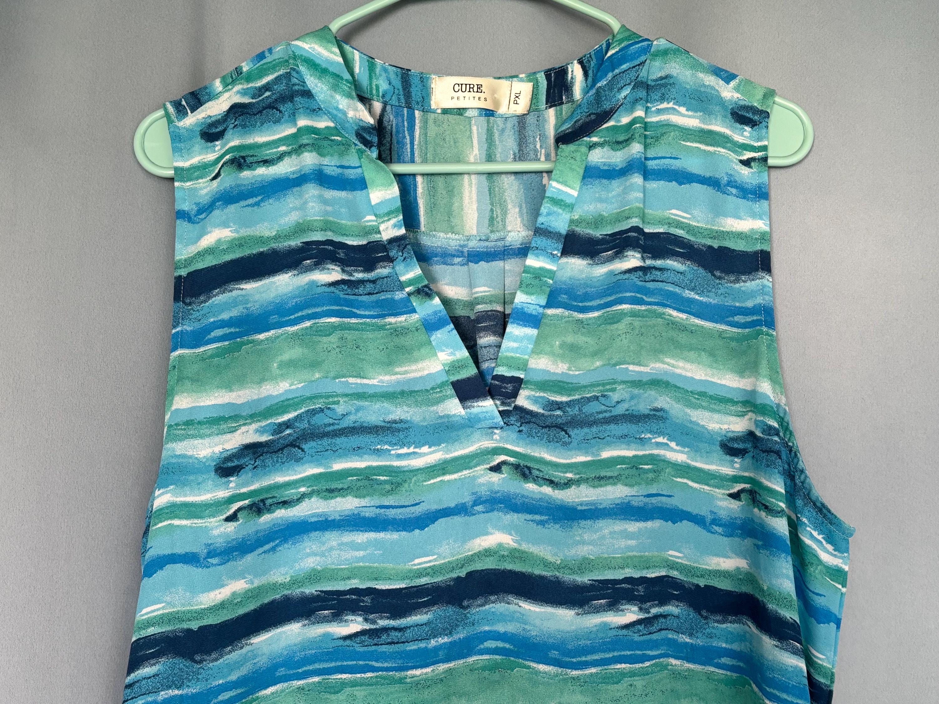 VISIT jaxinabox.com FOR ALL OUR LISTINGS!Cure Pullover Blouse Blue Green Ocean Sleeveless V Neck Asymmetrical Petite PXL
