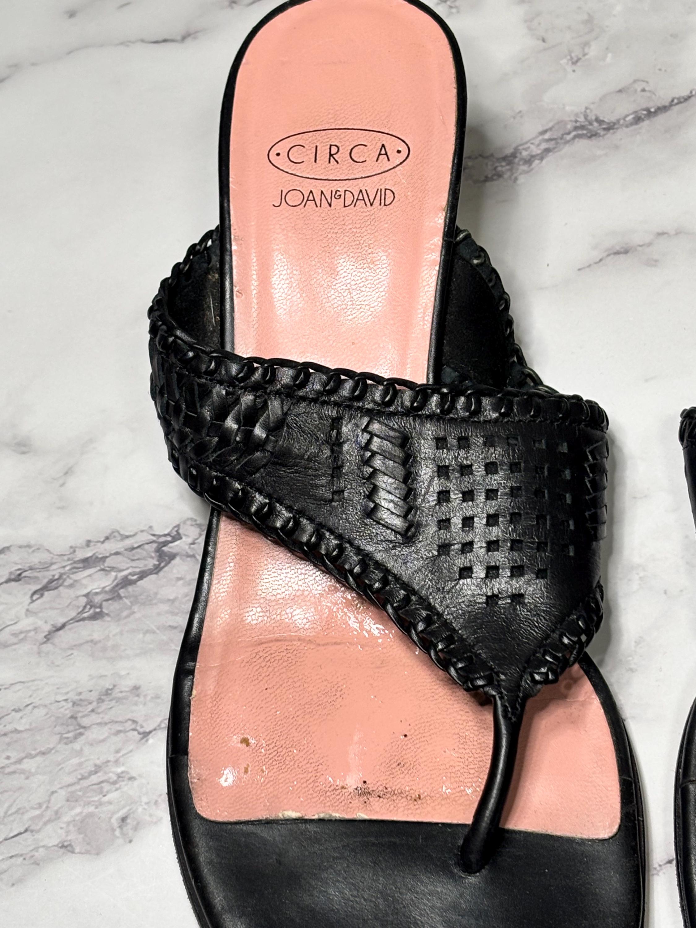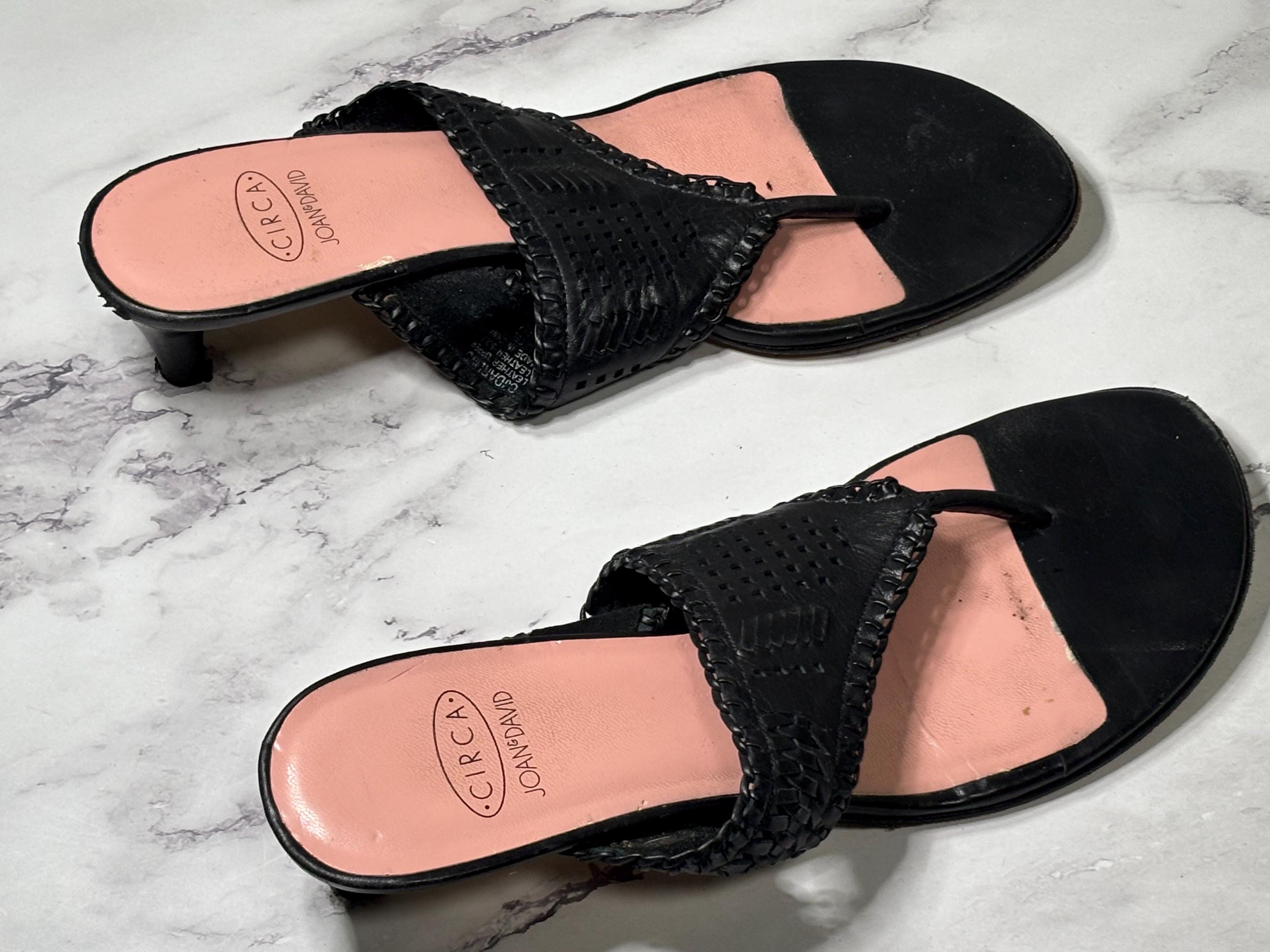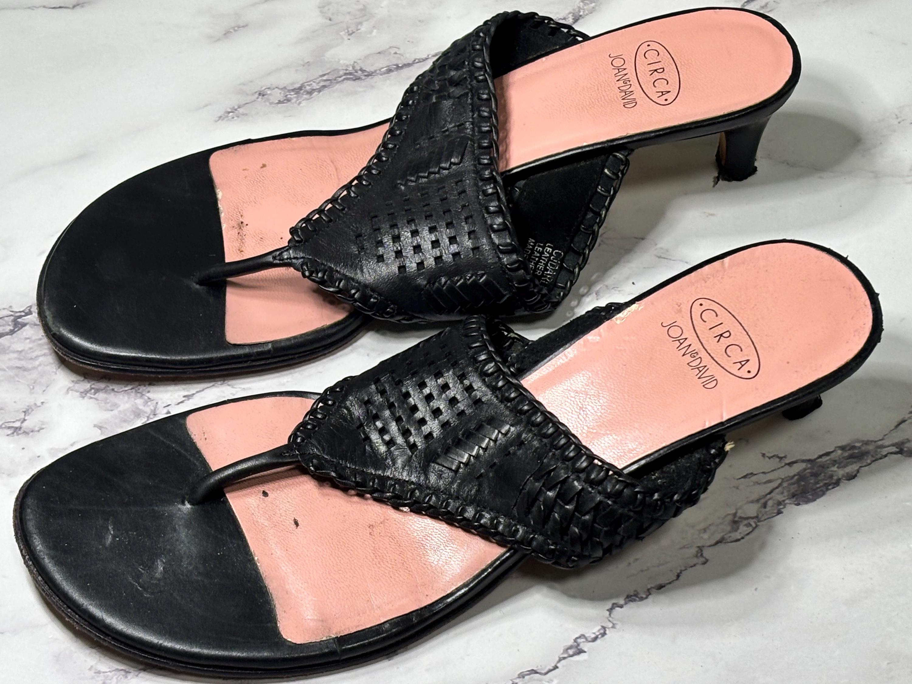 VISIT jaxinabox.com FOR ALL OUR LISTINGS!Circa Joan & David Black Pink Block Heel Flip Flops Patent Leather Sole 6M