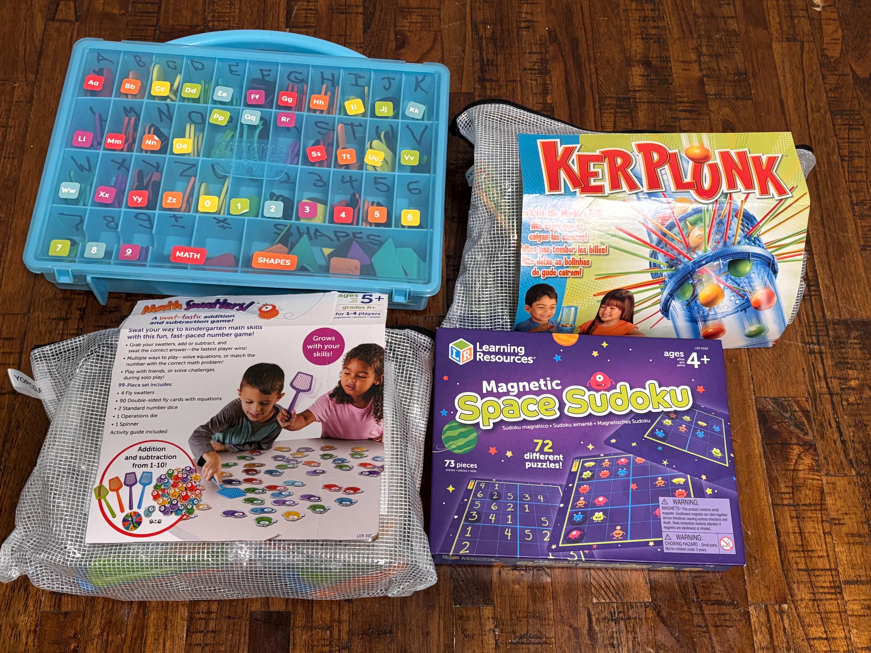 VISIT jaxinabox.com FOR ALL OUR LISTINGS!Lot of 5 Board Games Stomp, Ker Plunk, Math Swatters, Space Sudoku, Magnetic Tiles Number Letters Tangram