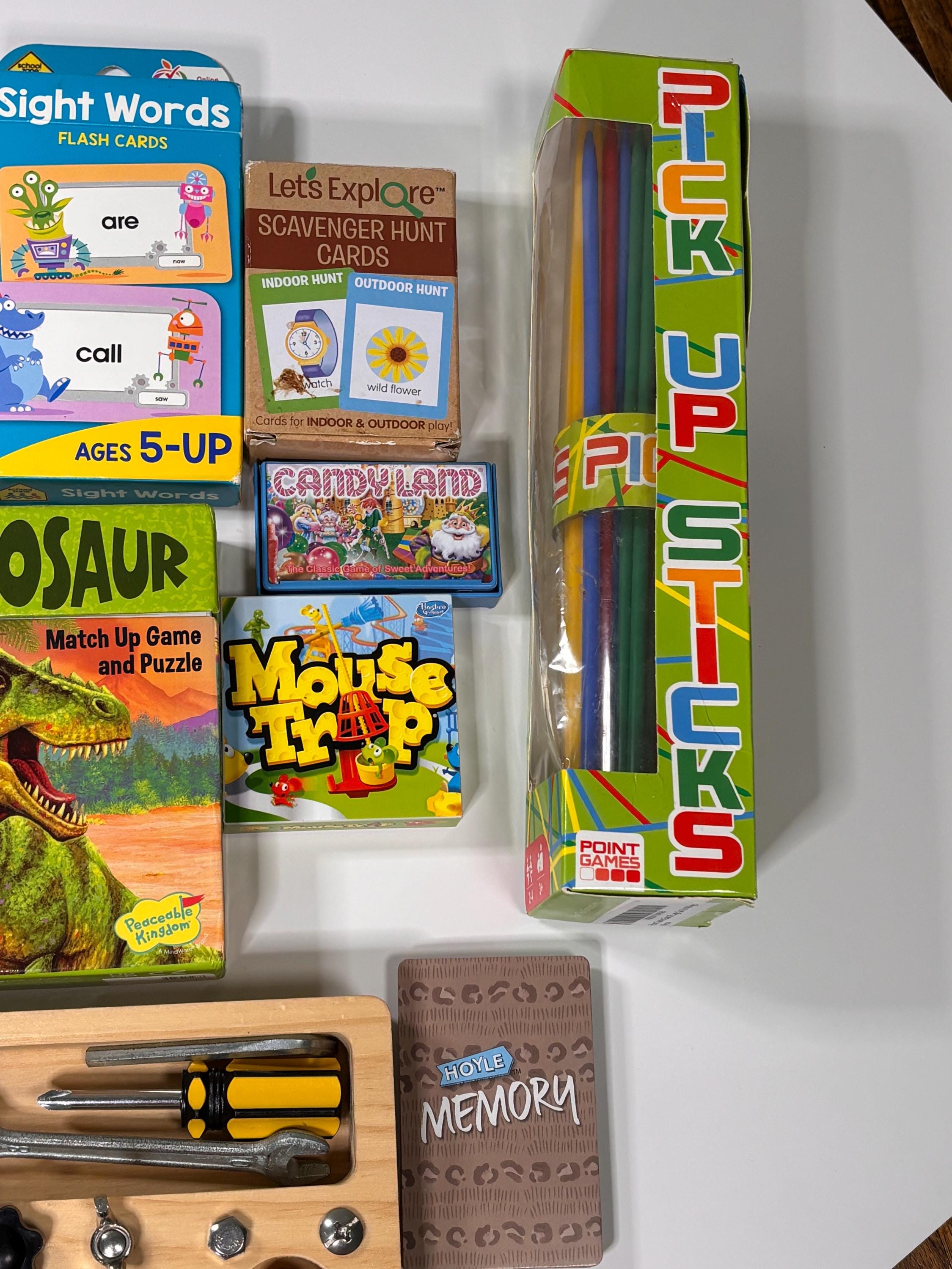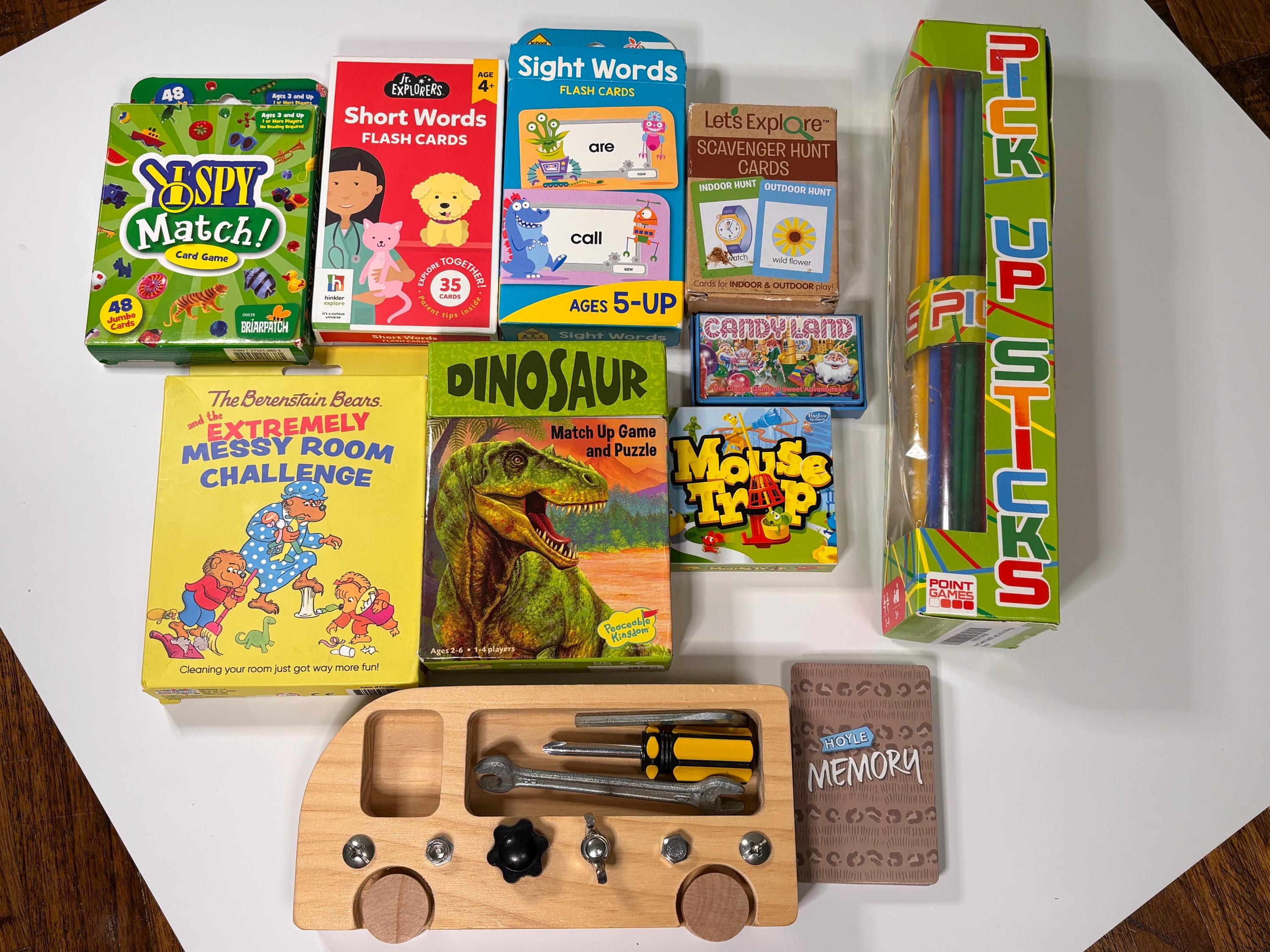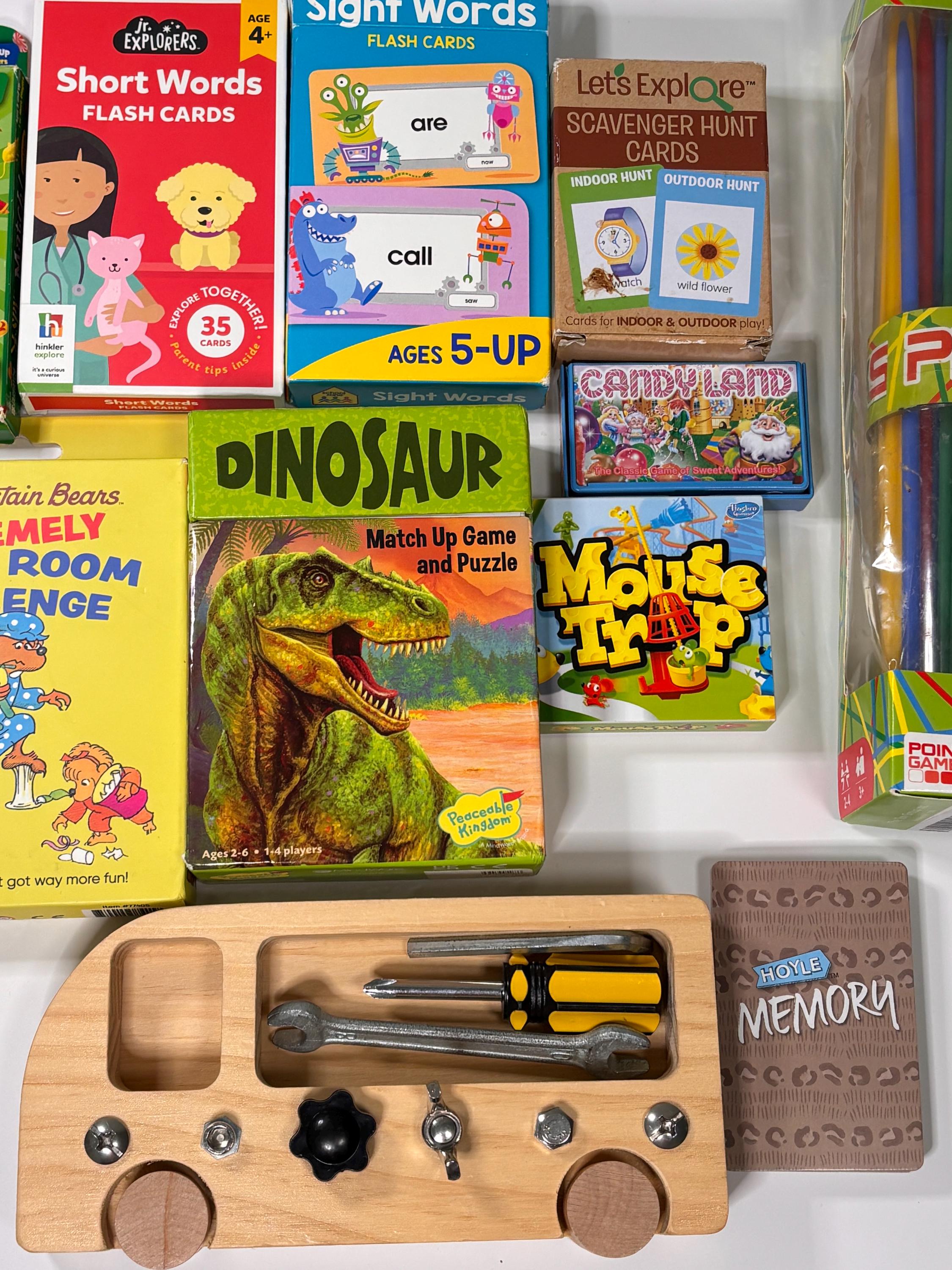 jr explorers short words sight word Berenstain bears messy room dinosaur match game I spy match Melissa Doug scavenger hunt pick up sticks memory mouse trap candy land
