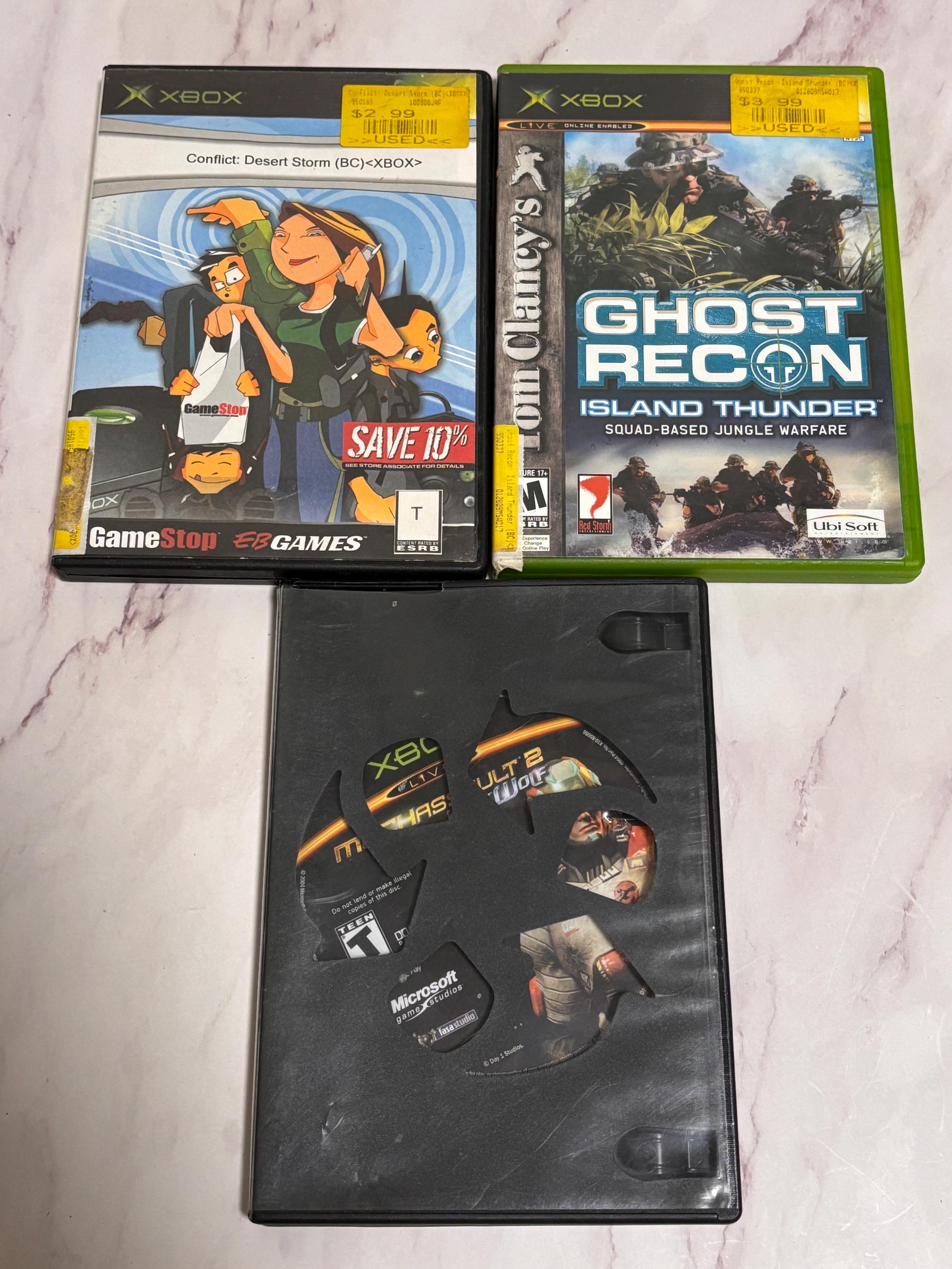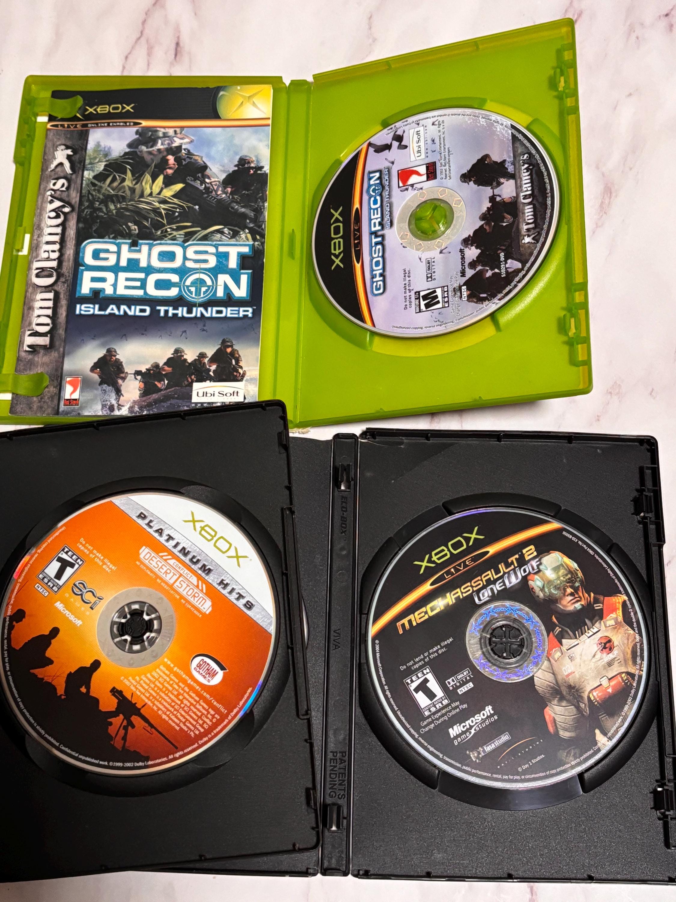 VISIT jaxinabox.com FOR ALL OUR LISTINGS!lot of 3 Xbox Games Ghost Recon Island Thunder squad based jungle warfare Conflict Desert Storm MechAssault 2 Lone Wolf