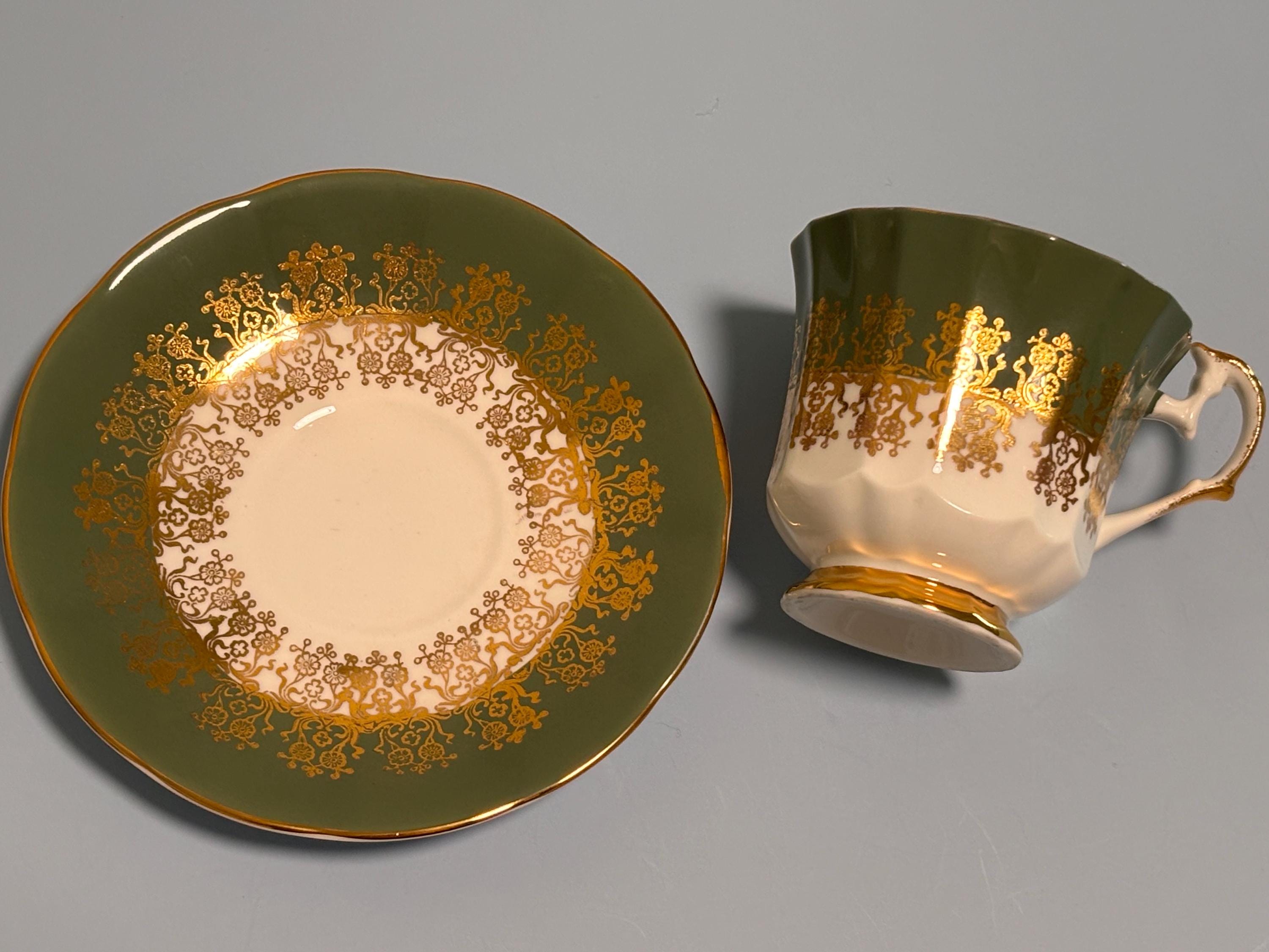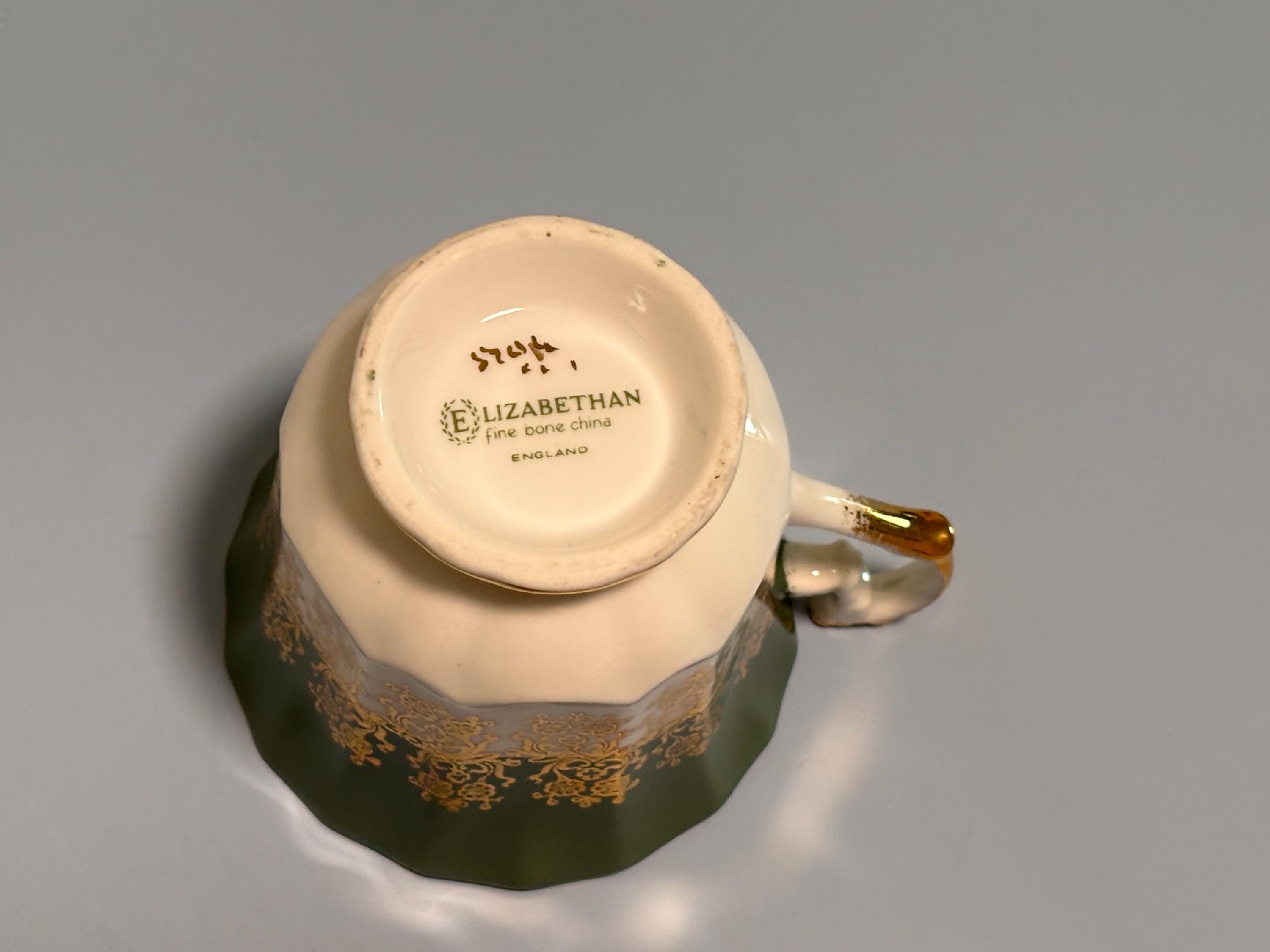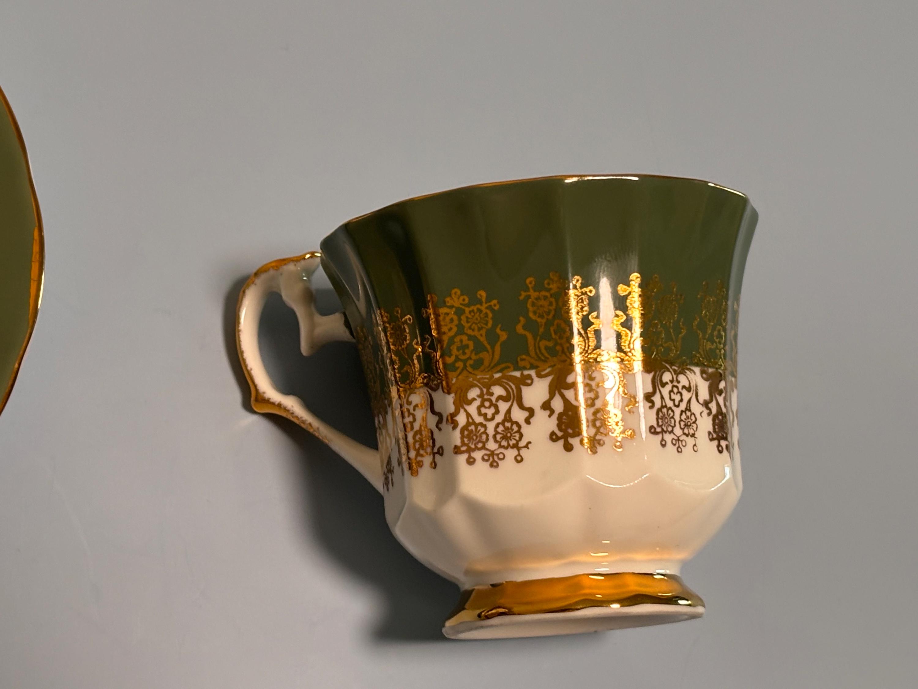 VISIT jaxinabox.com FOR ALL OUR LISTINGS!Vintage Elizabethan bone china footed cup saucer England gold moss green