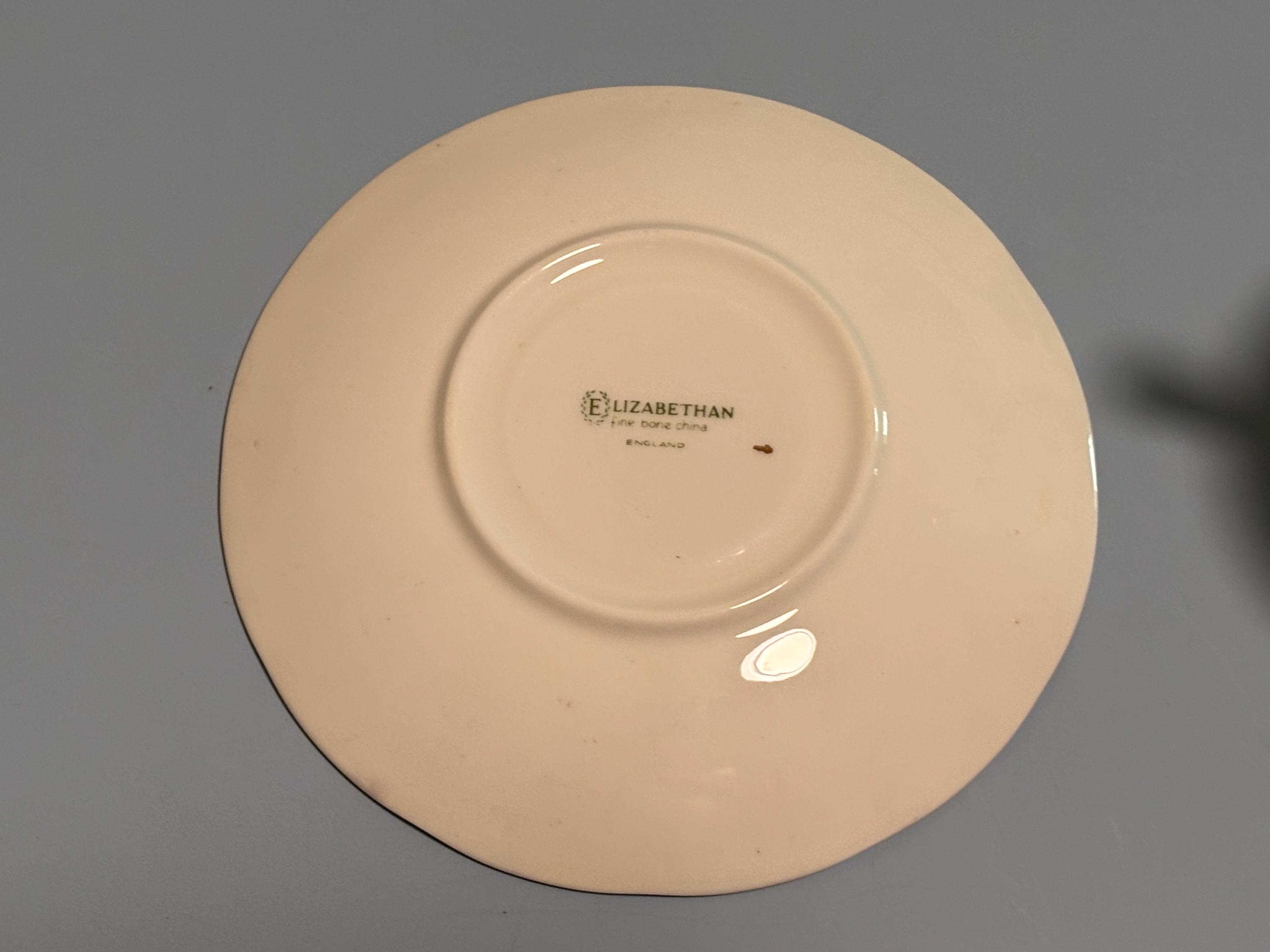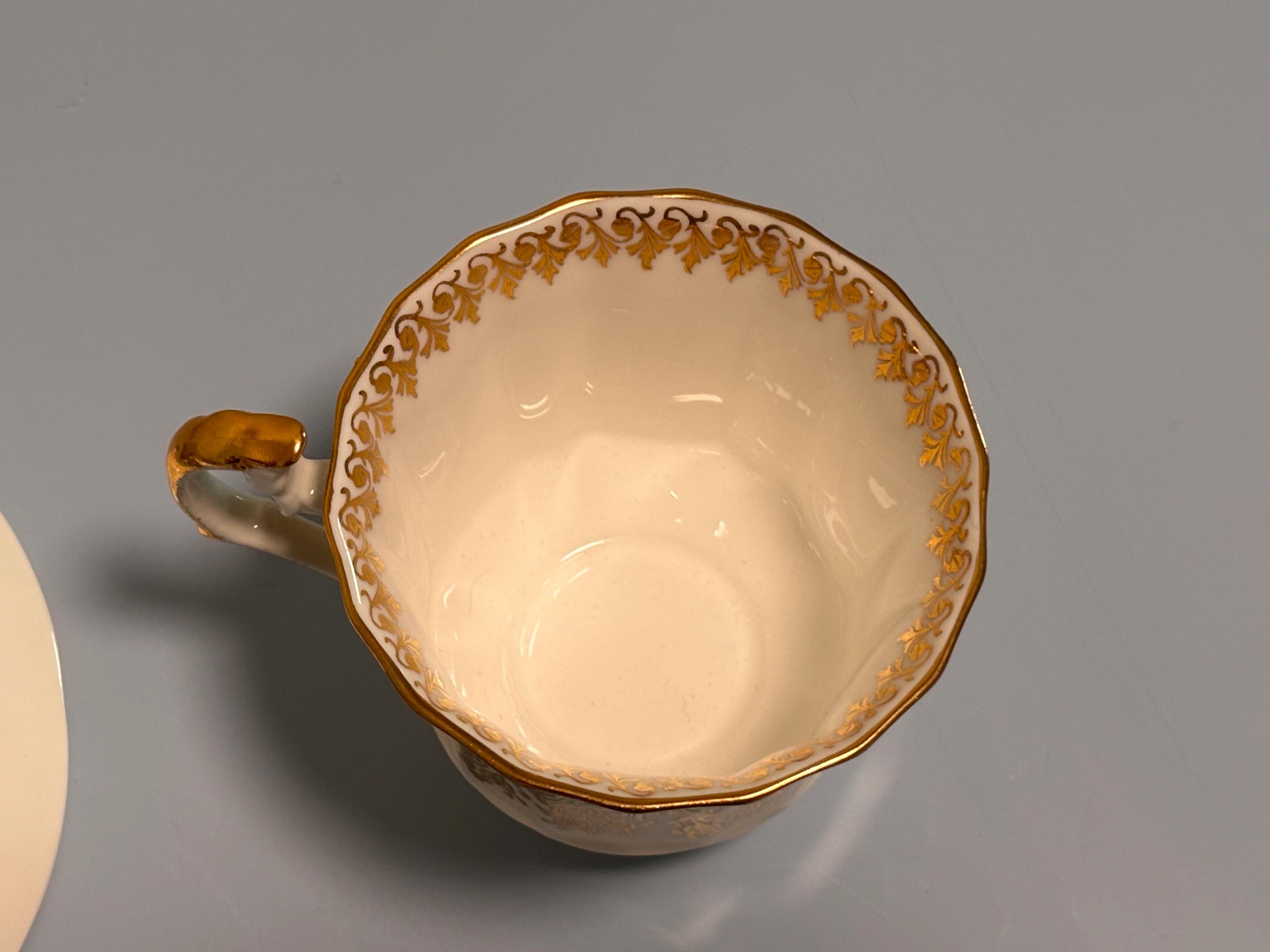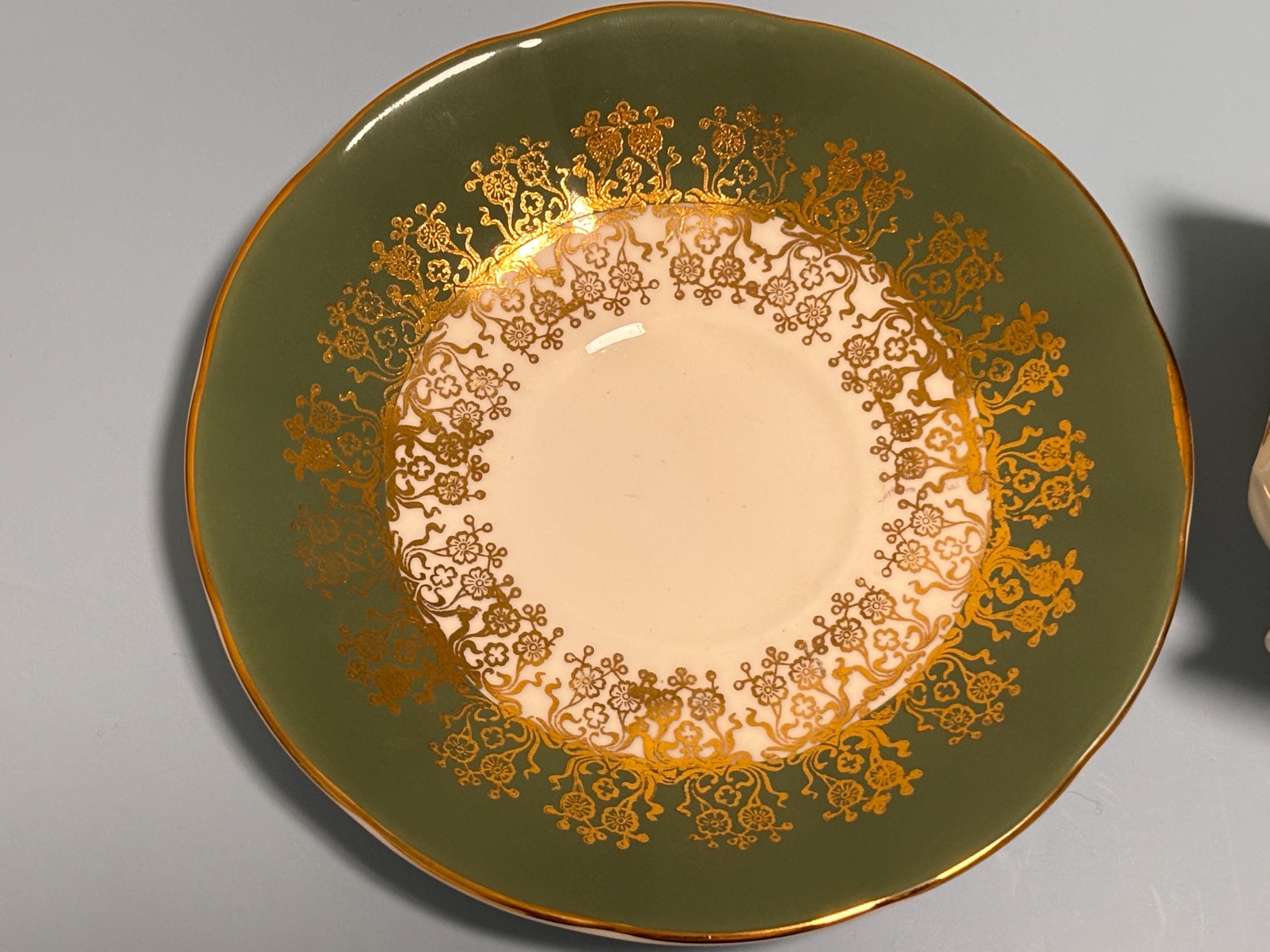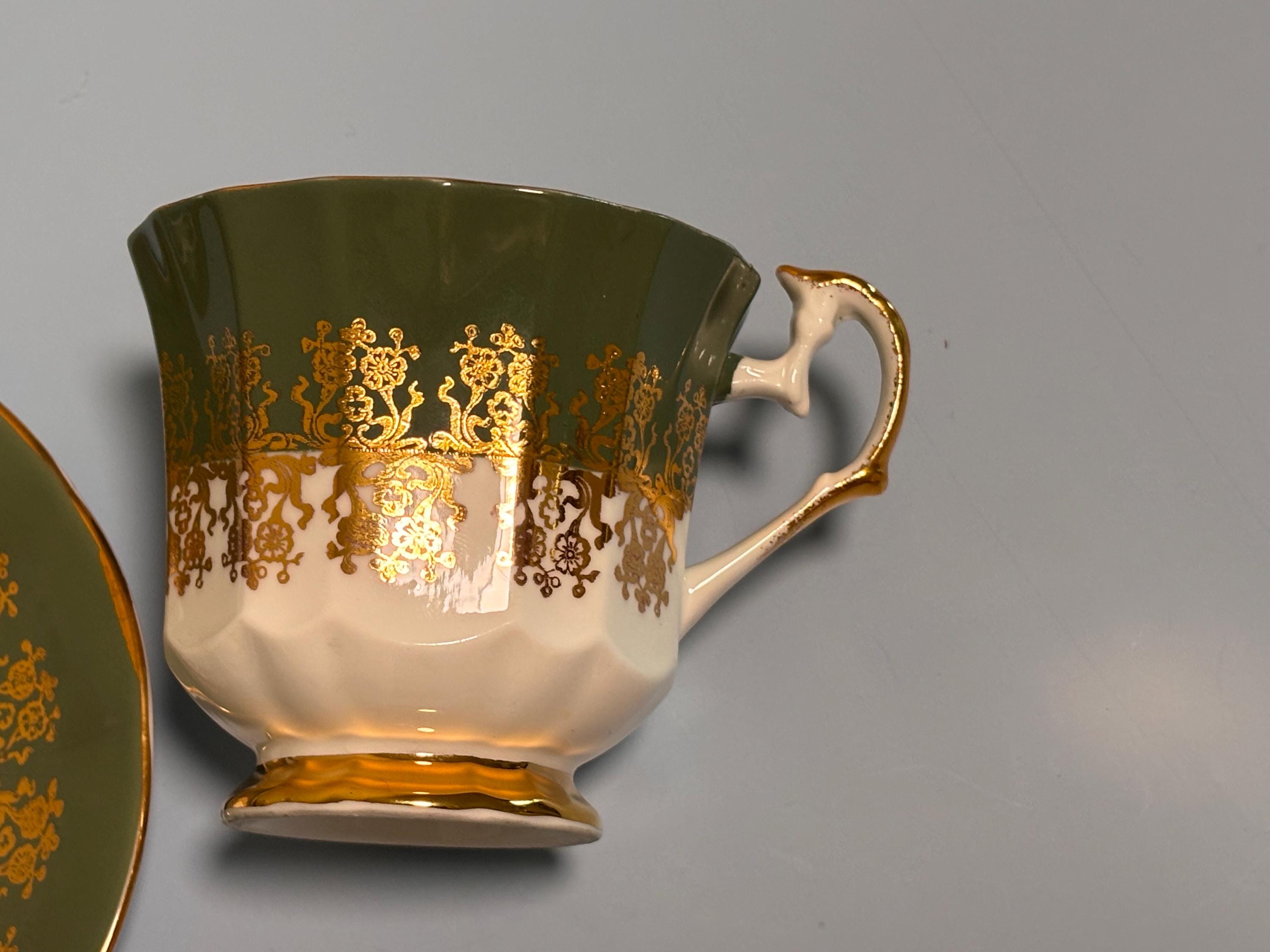 VISIT jaxinabox.com FOR ALL OUR LISTINGS!Vintage Elizabethan bone china footed cup saucer England gold moss green