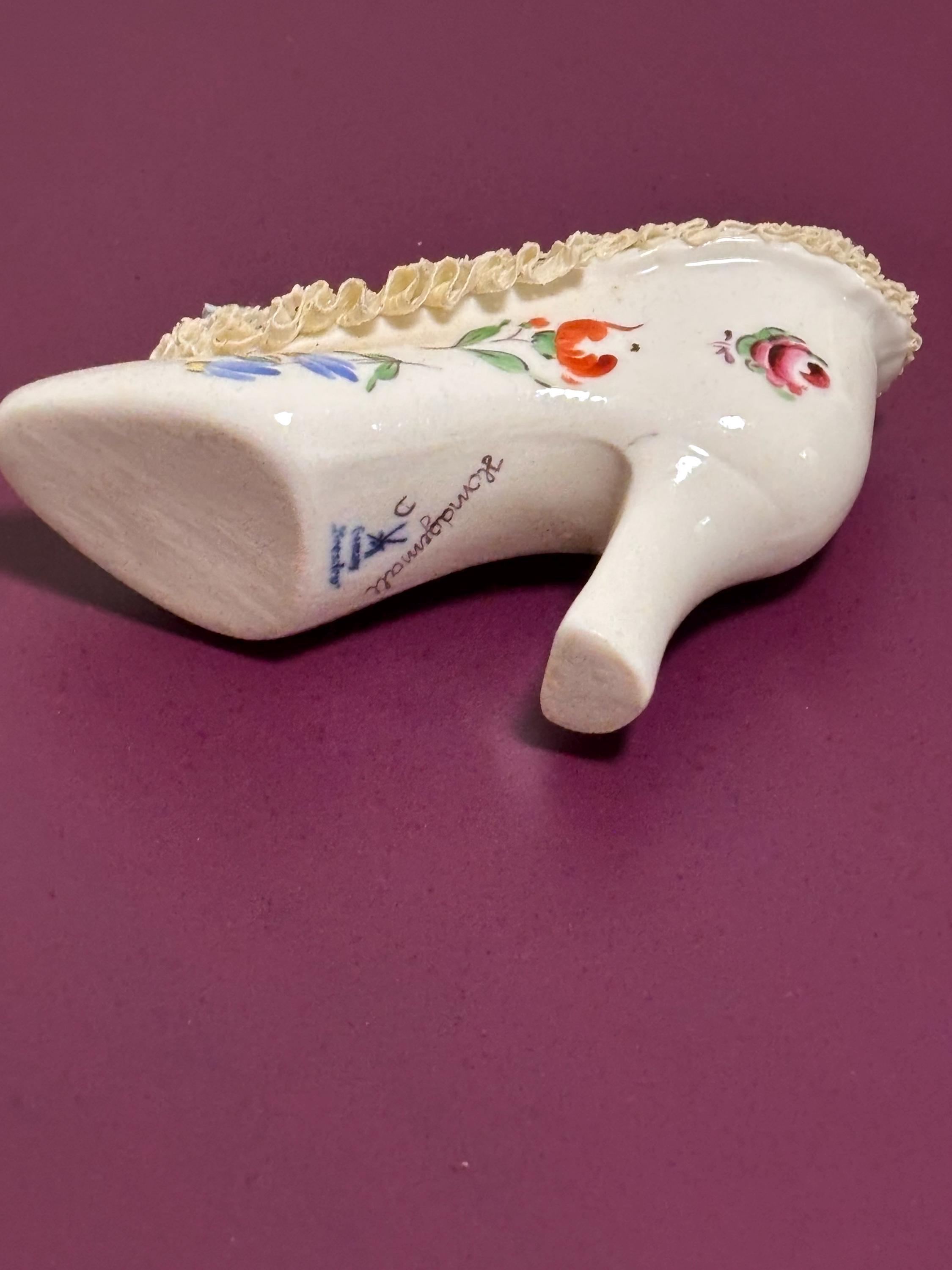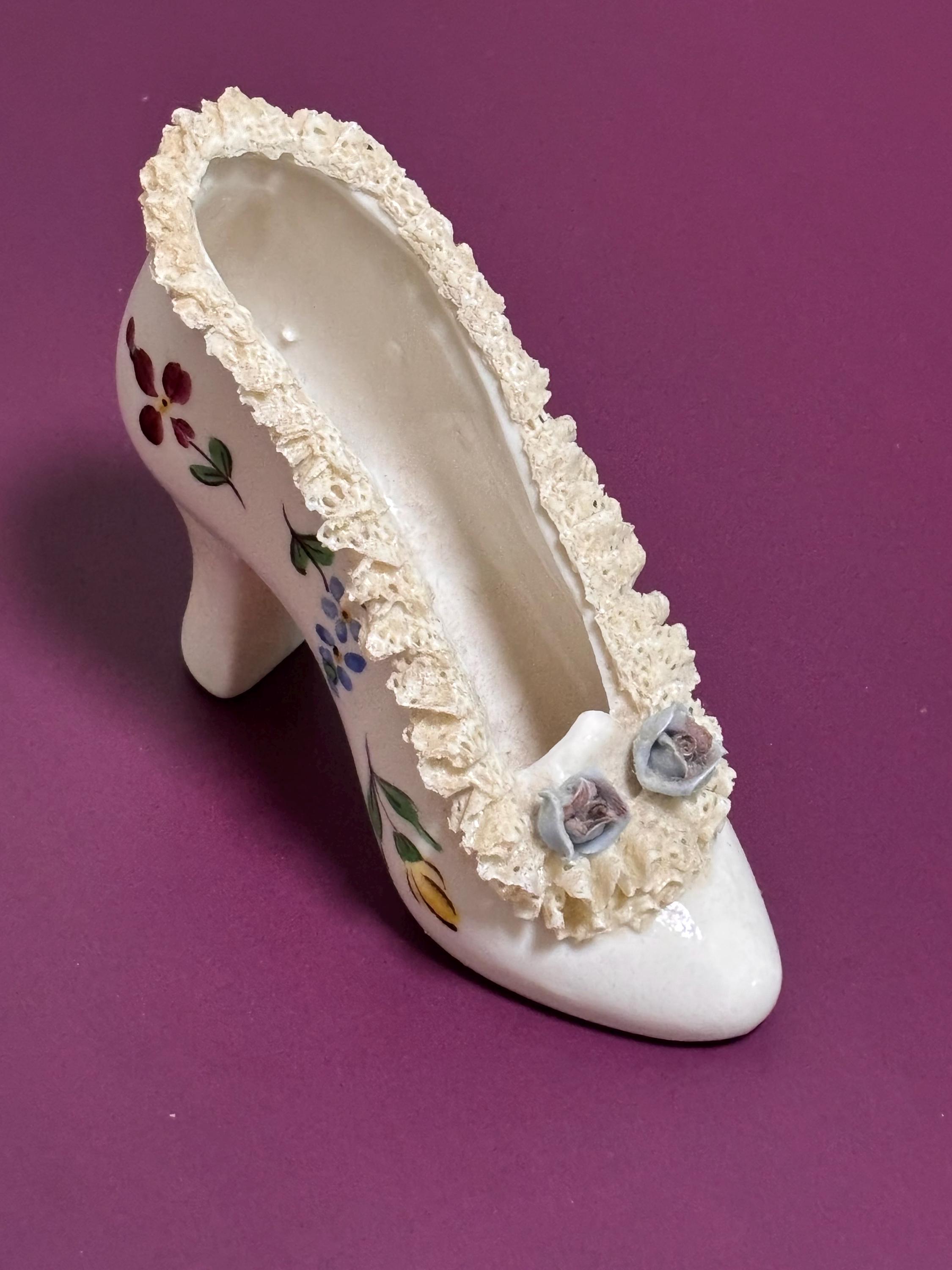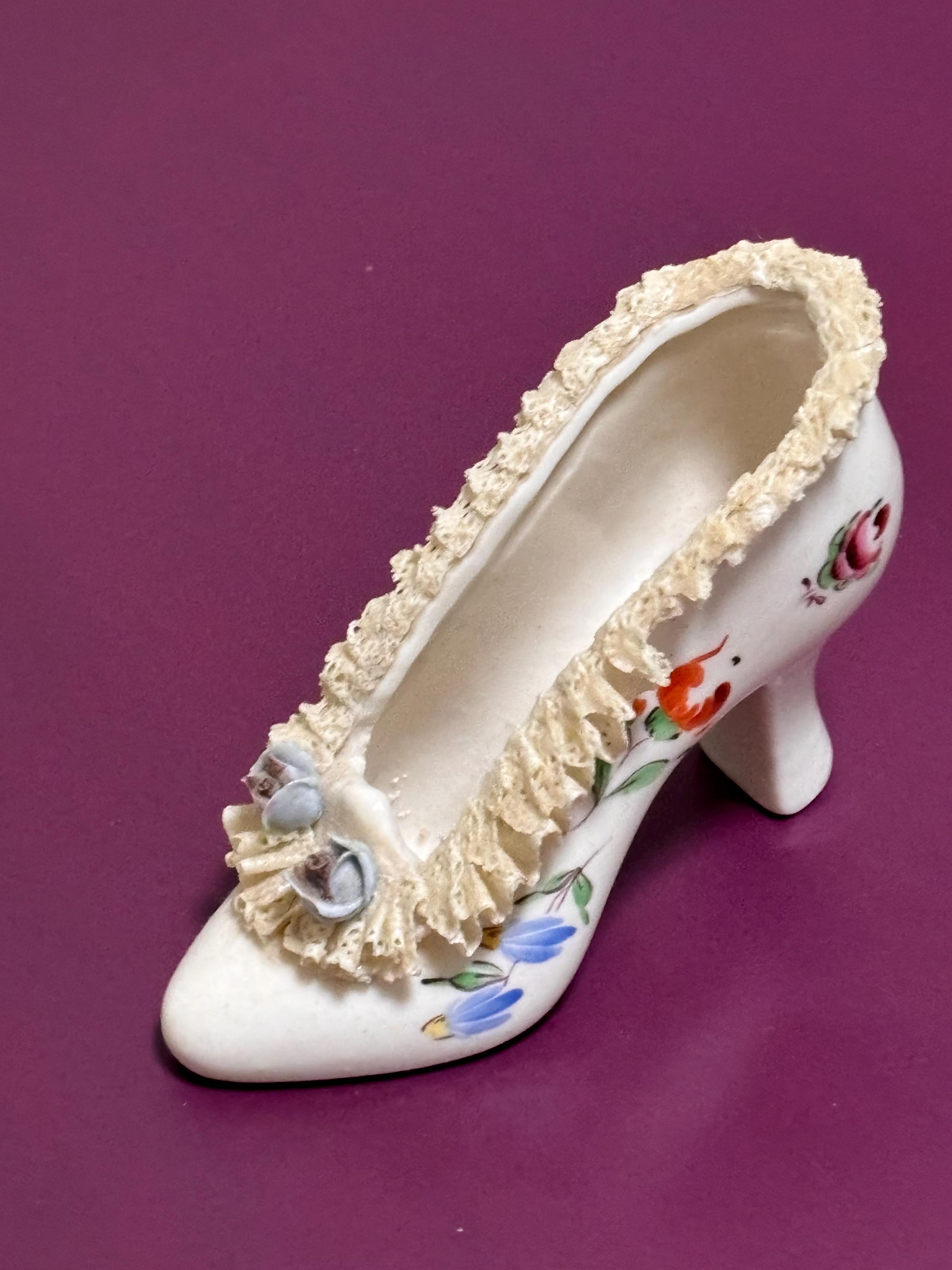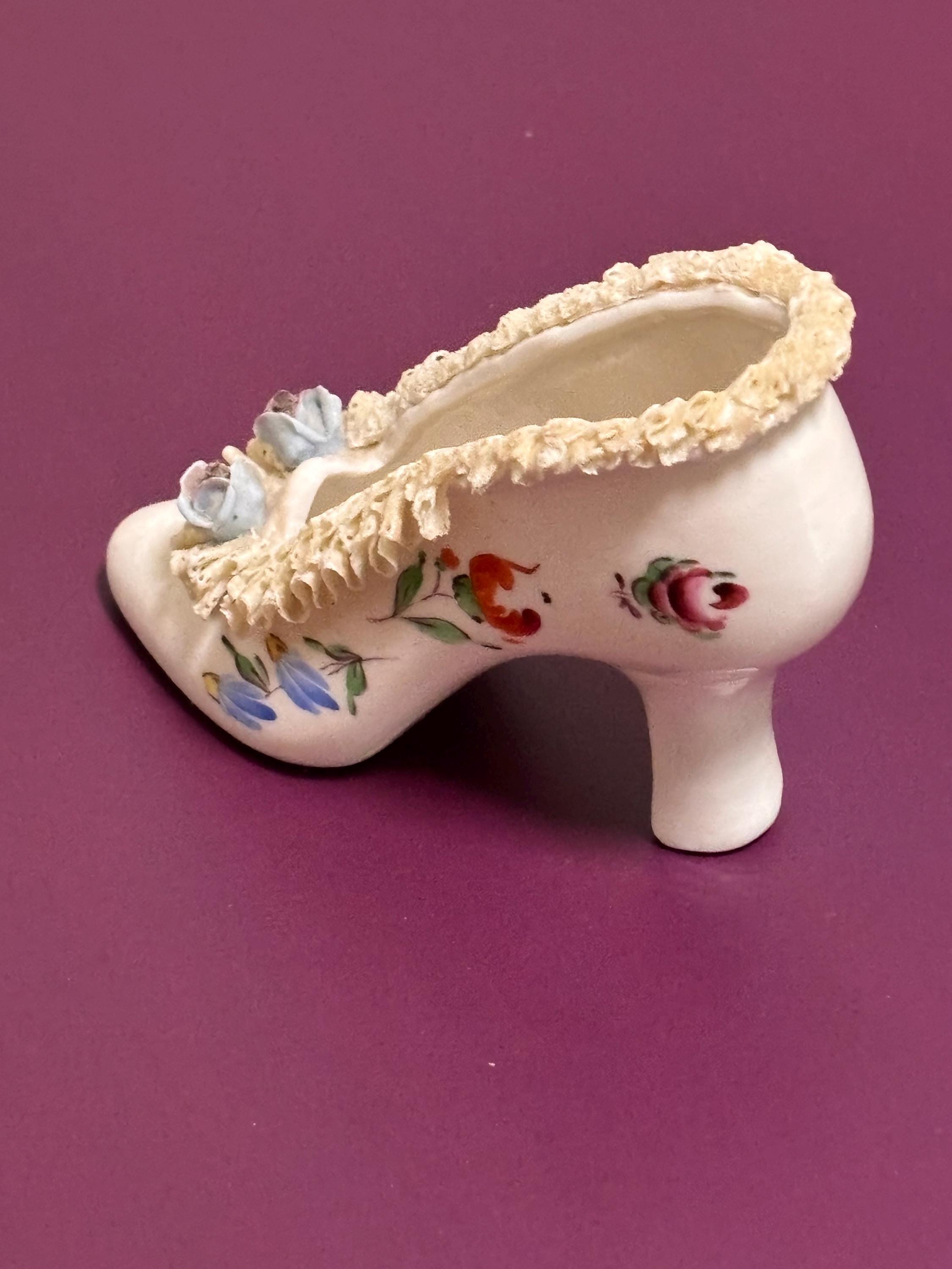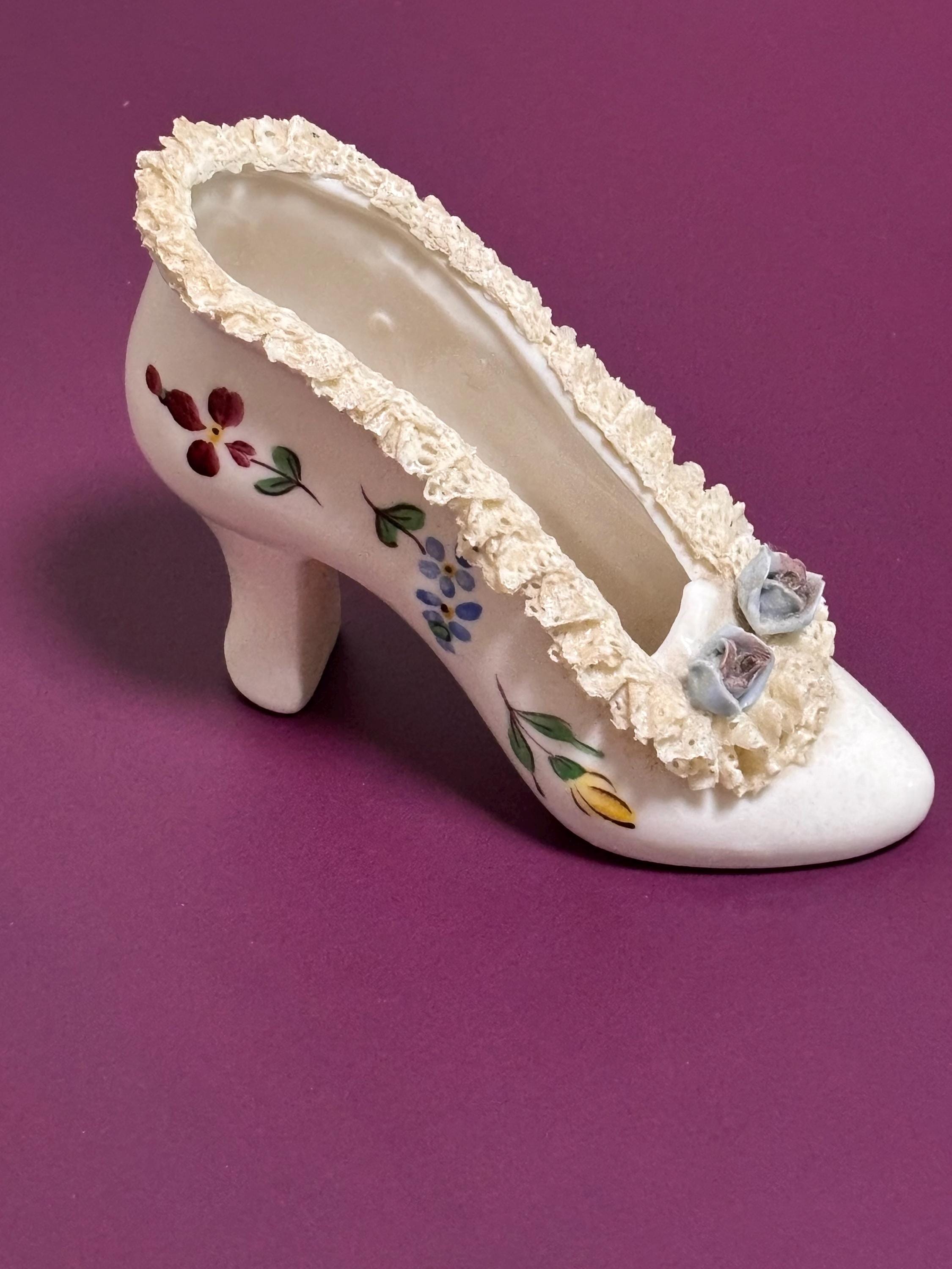 VISIT jaxinabox.com FOR ALL OUR LISTINGS!Dresden vintage applied lace hand painted flowers porcelain high heel shoe