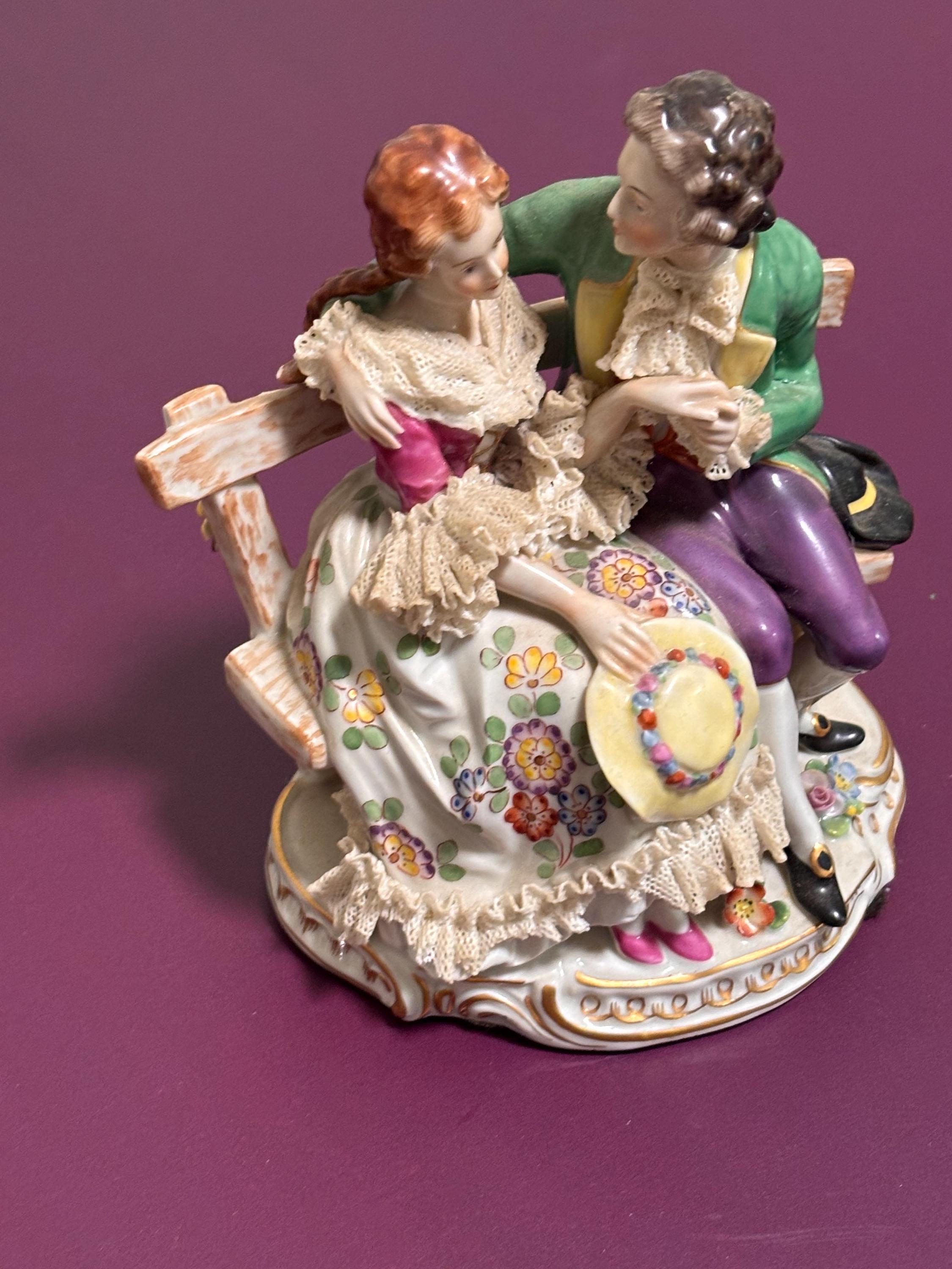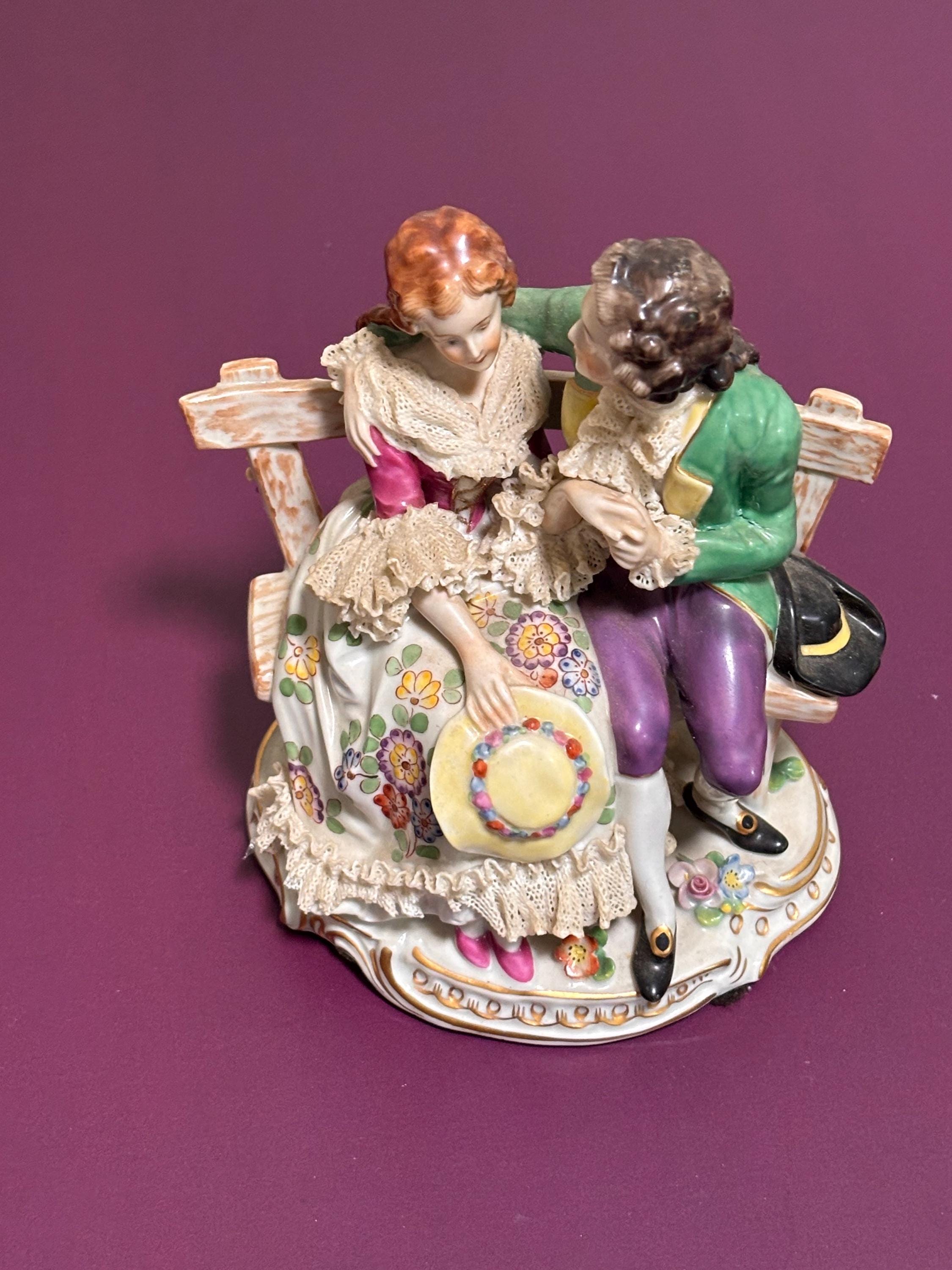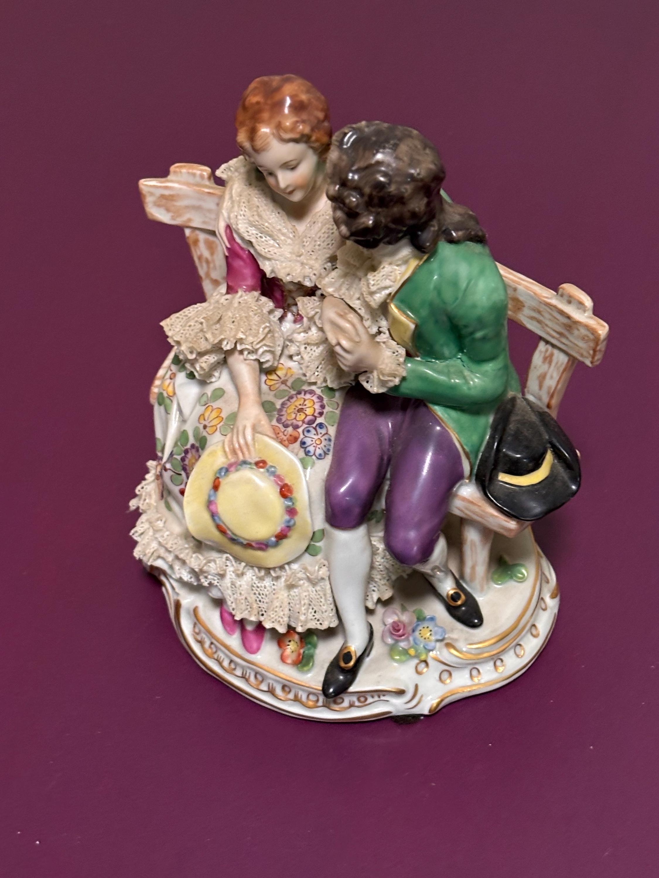 VISIT jaxinabox.com FOR ALL OUR LISTINGS!Antique 1762 Volkstedt Germany Porcelain Victorian Couple Sitting on Bench