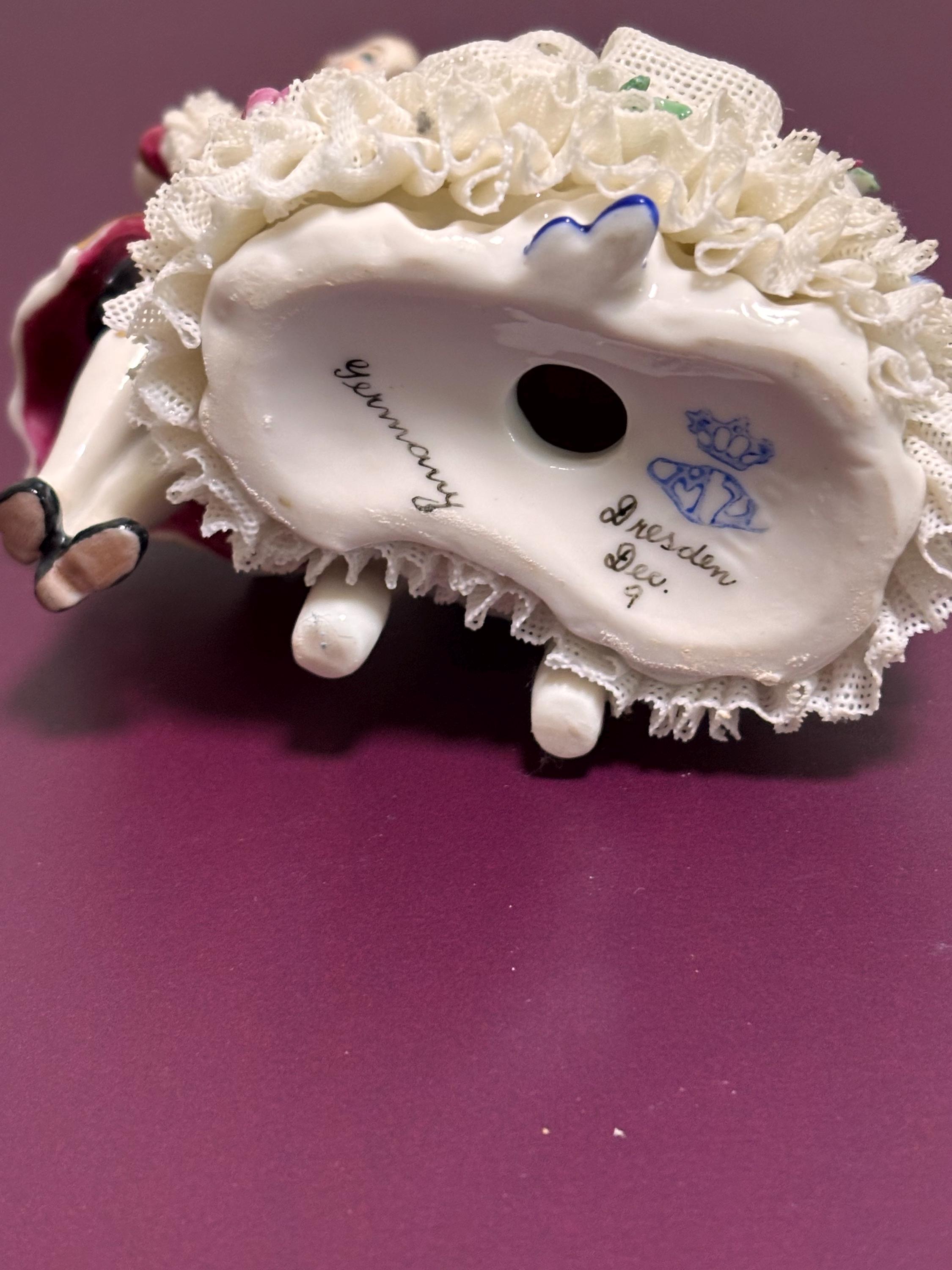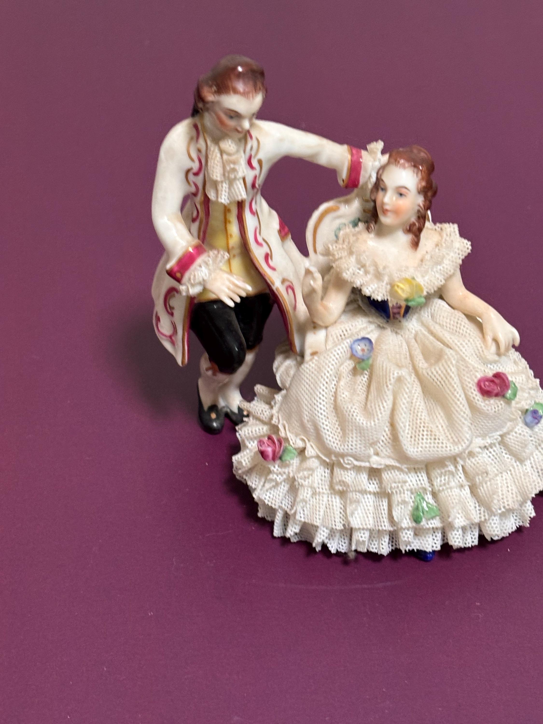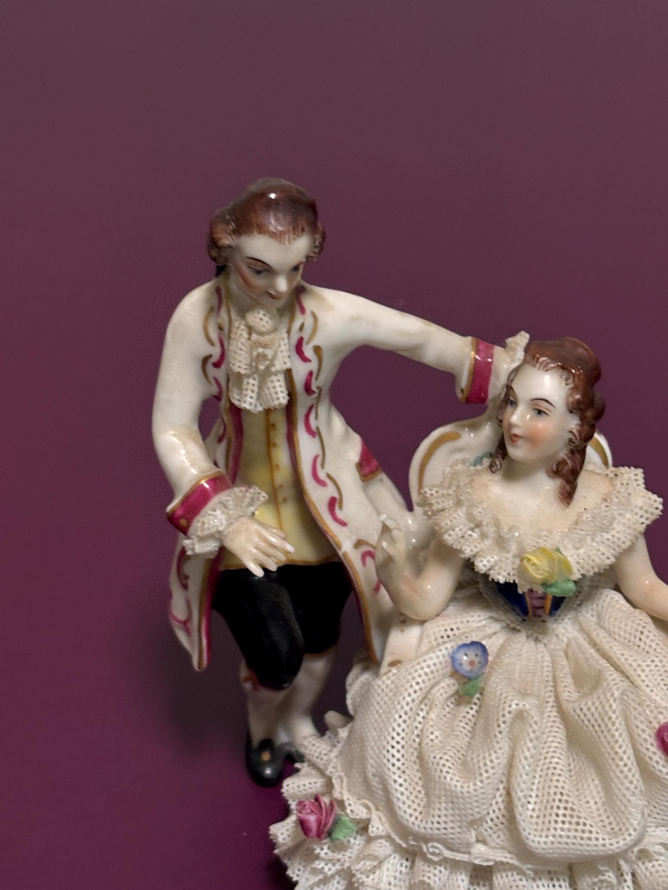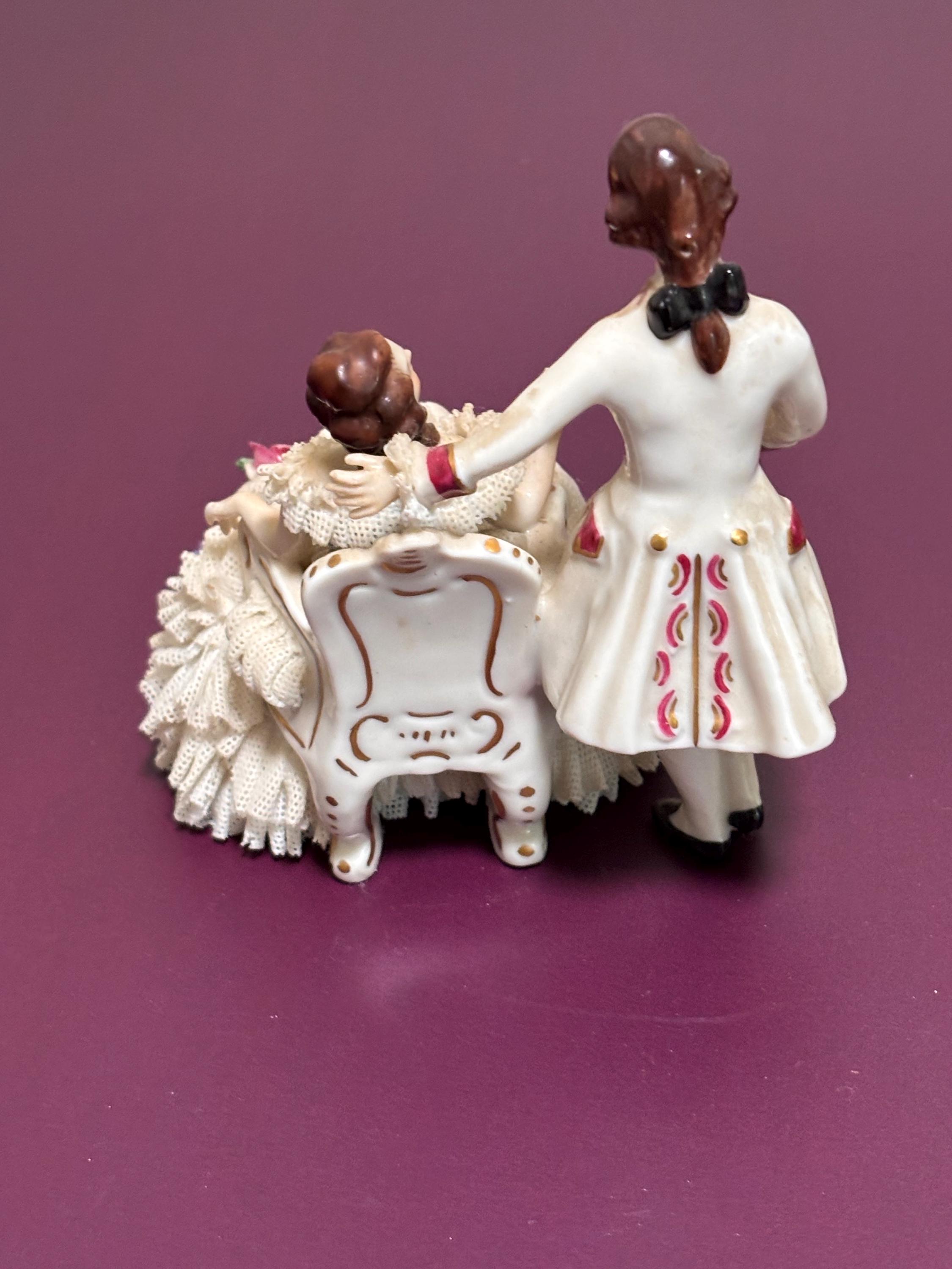 VISIT jaxinabox.com FOR ALL OUR LISTINGS!Vintage Dresden Porcelain Rose Floral Flower Chair Sitting Man Women Couple