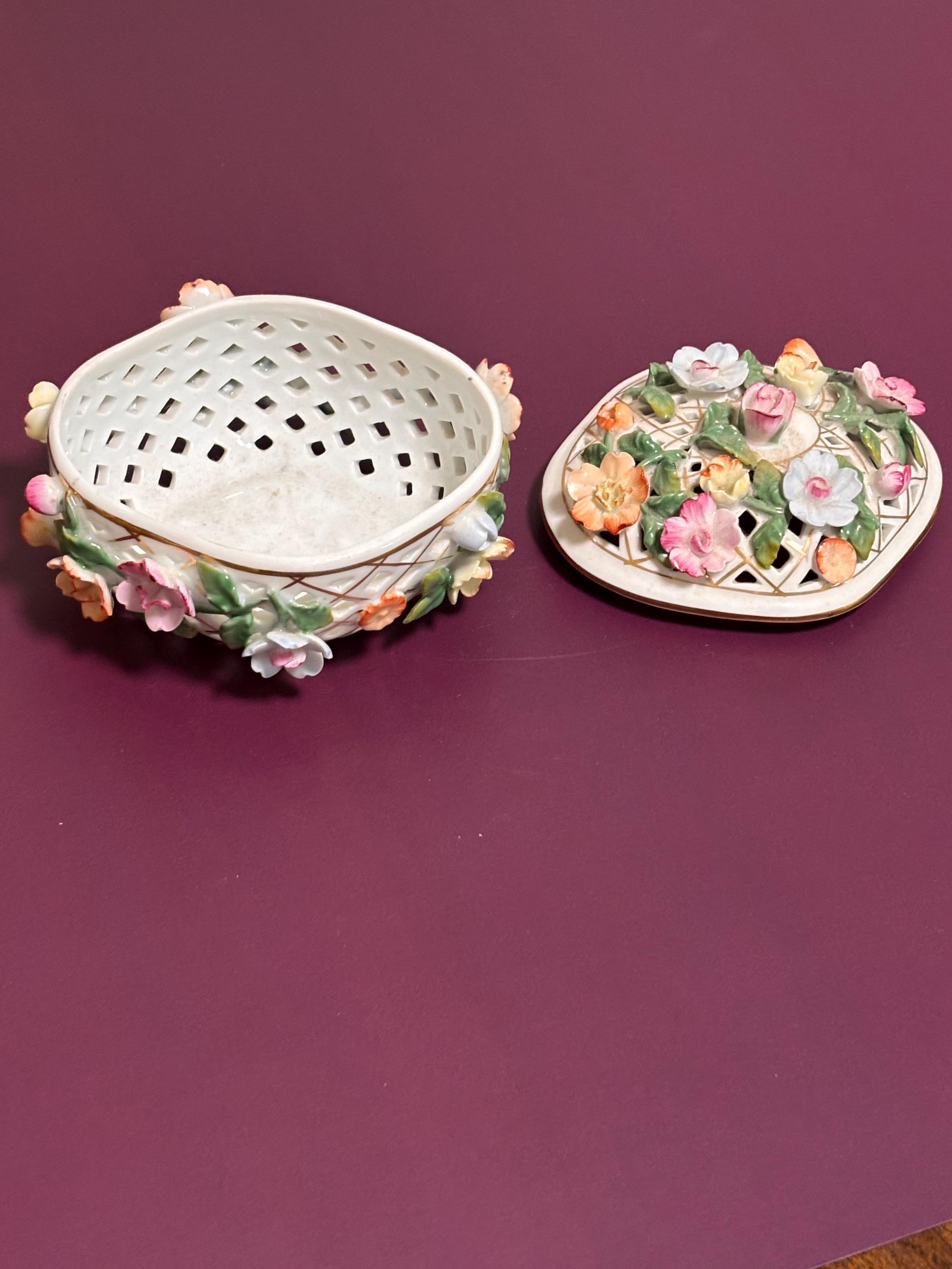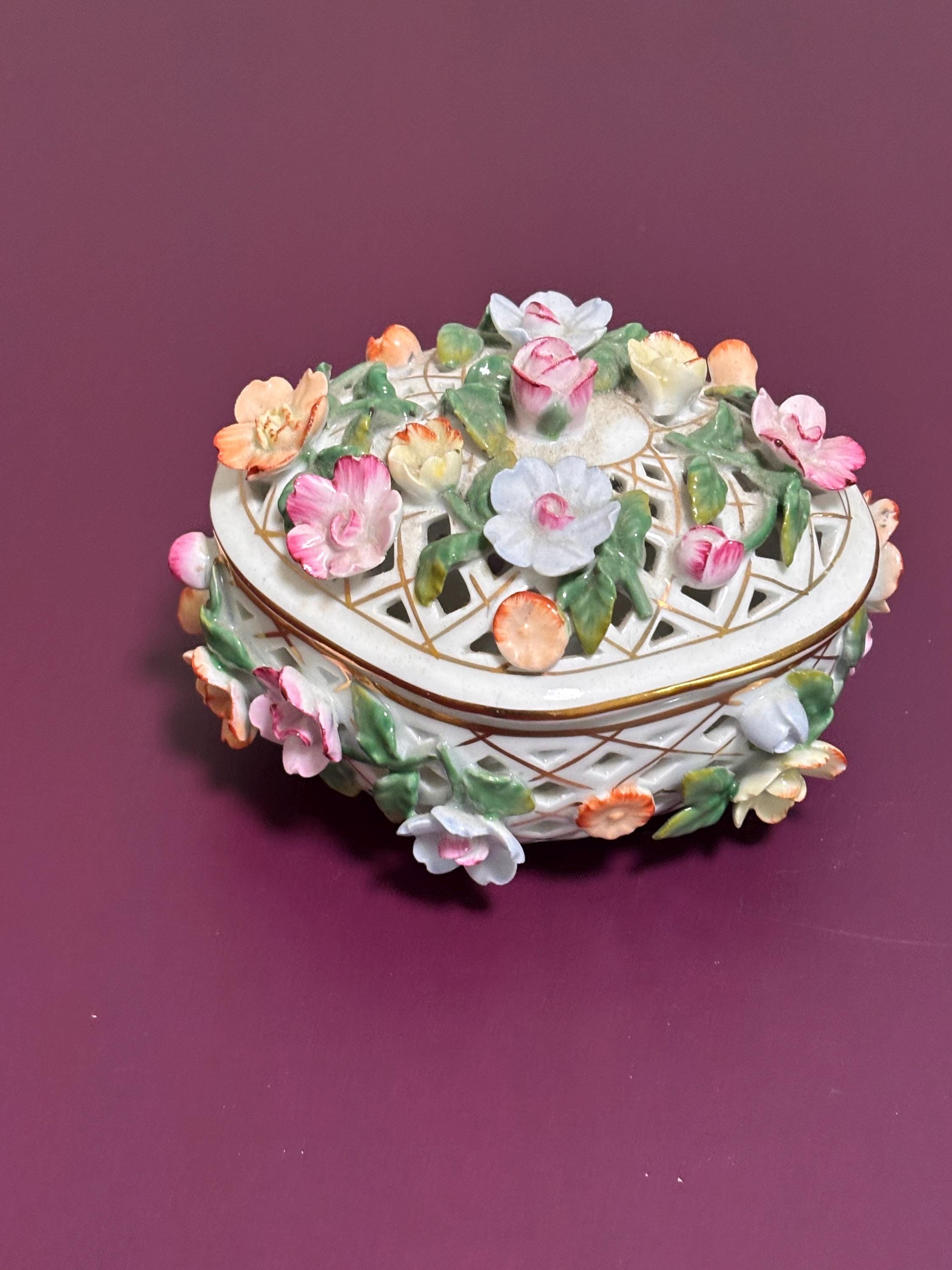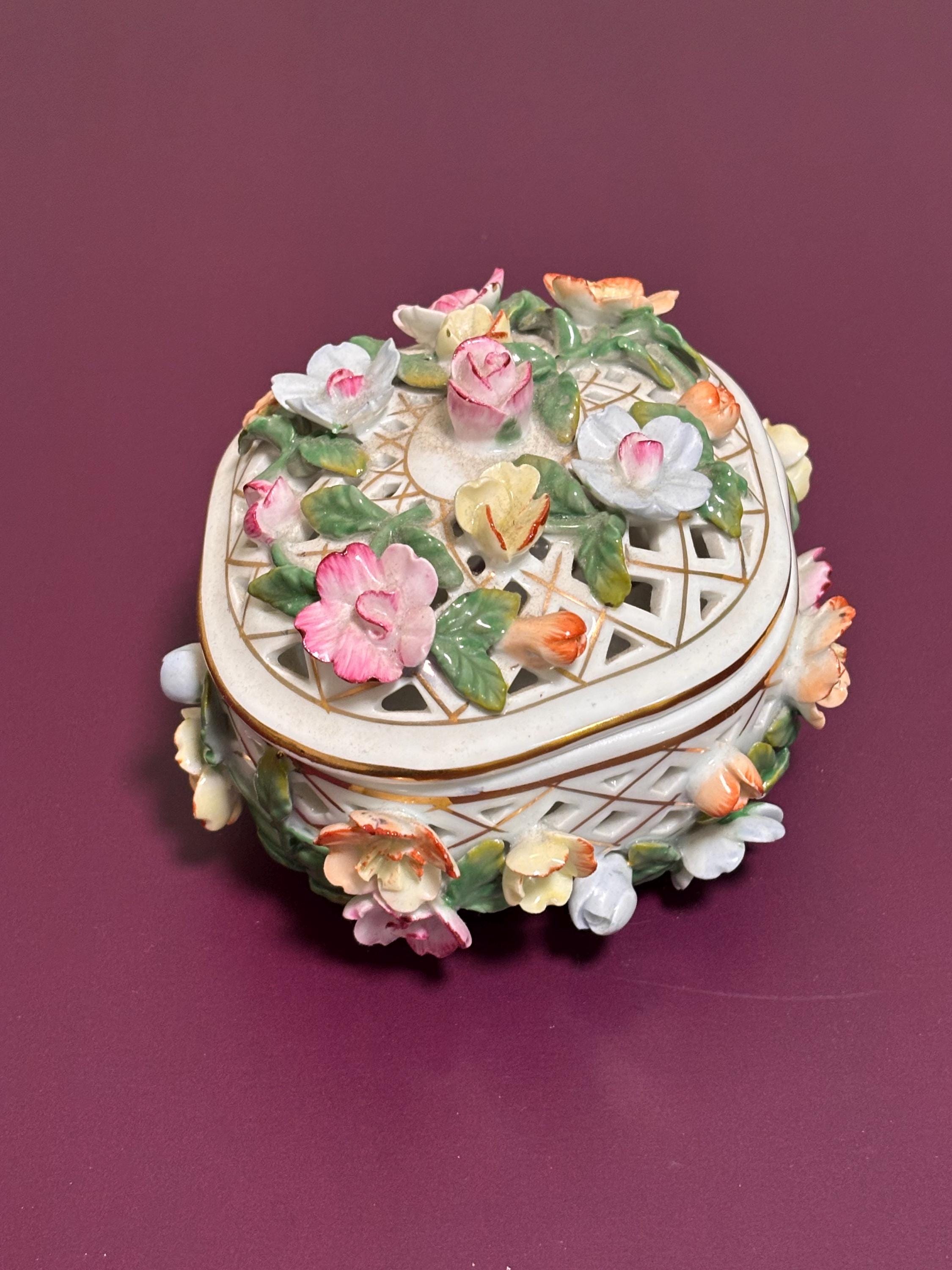 VISIT jaxinabox.com FOR ALL OUR LISTINGS!KPM Style Reticulated Covered Trinket Box With Raised Floral Flower