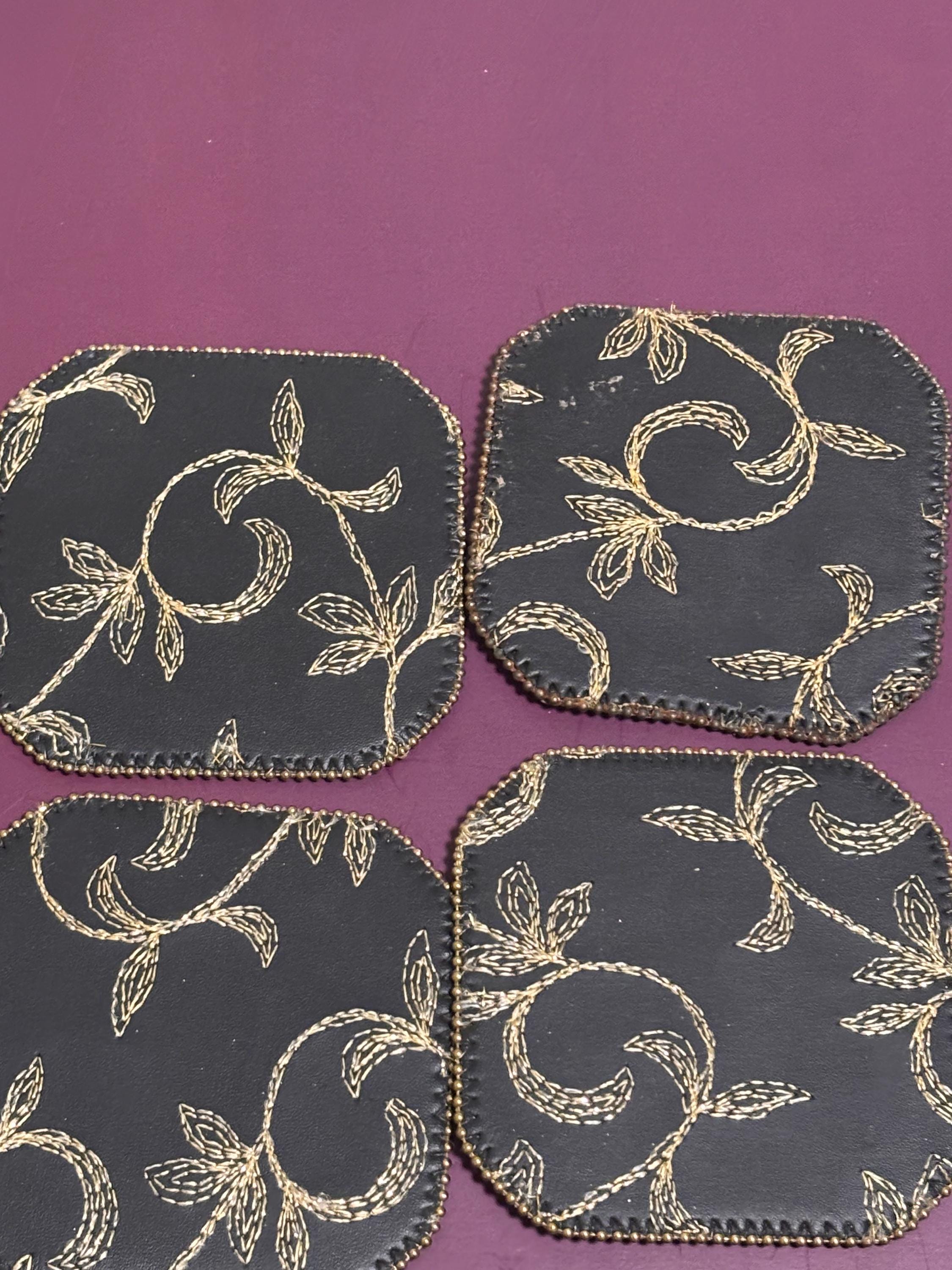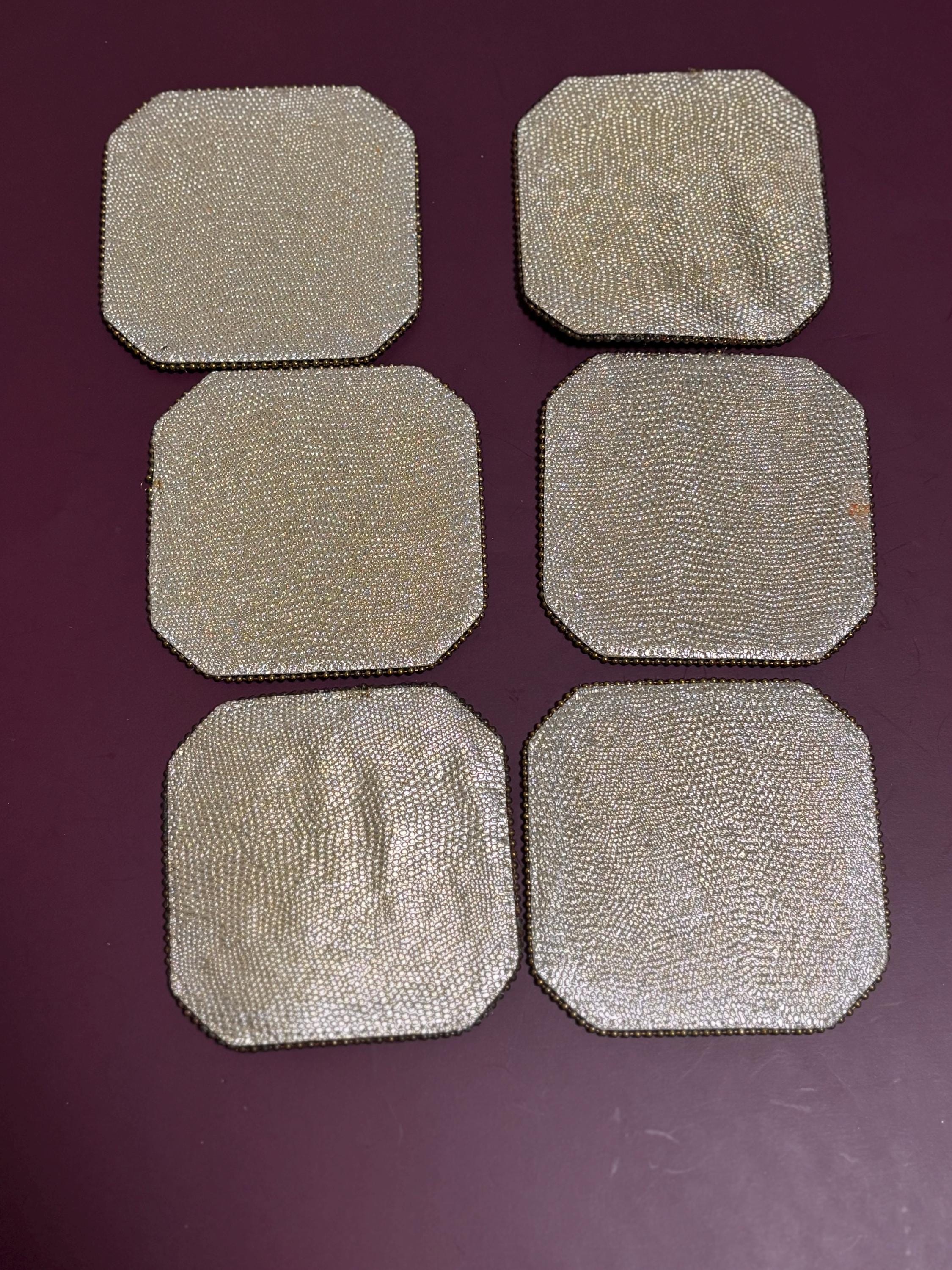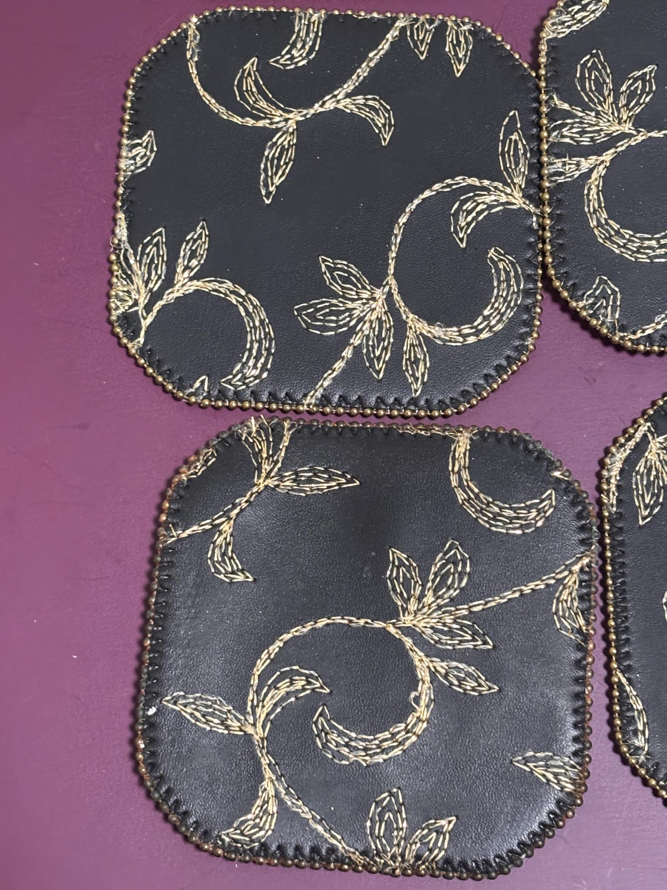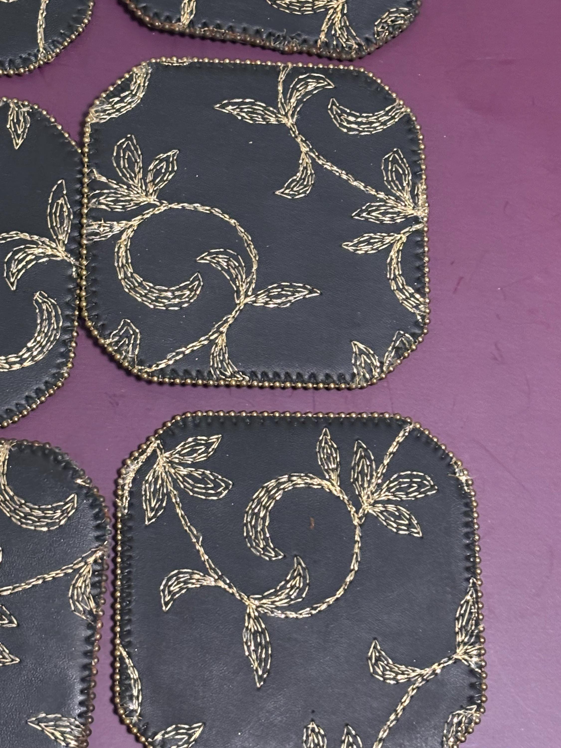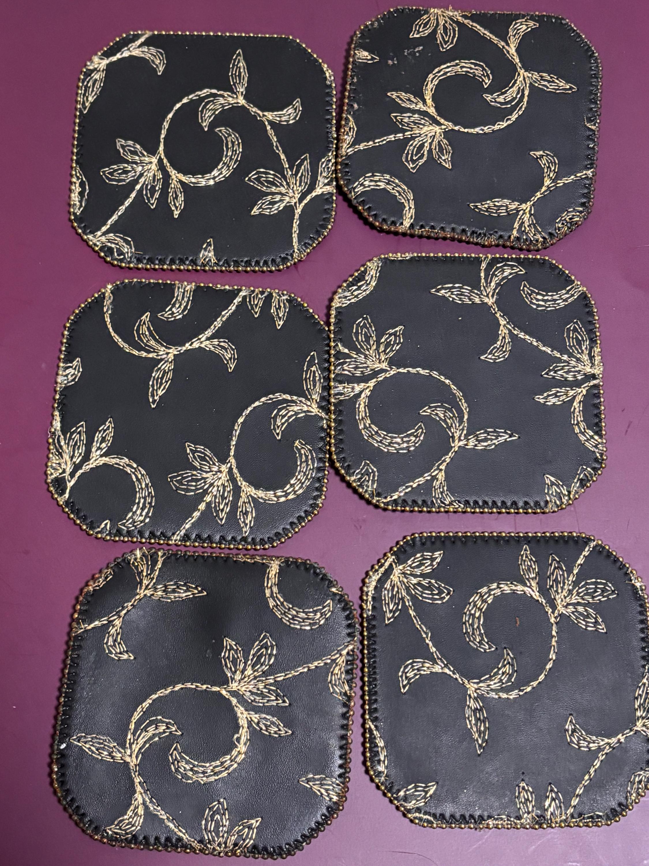 VISIT jaxinabox.com FOR ALL OUR LISTINGS!Lot Set of 6 Black Gold Silver Embroidered Coasters