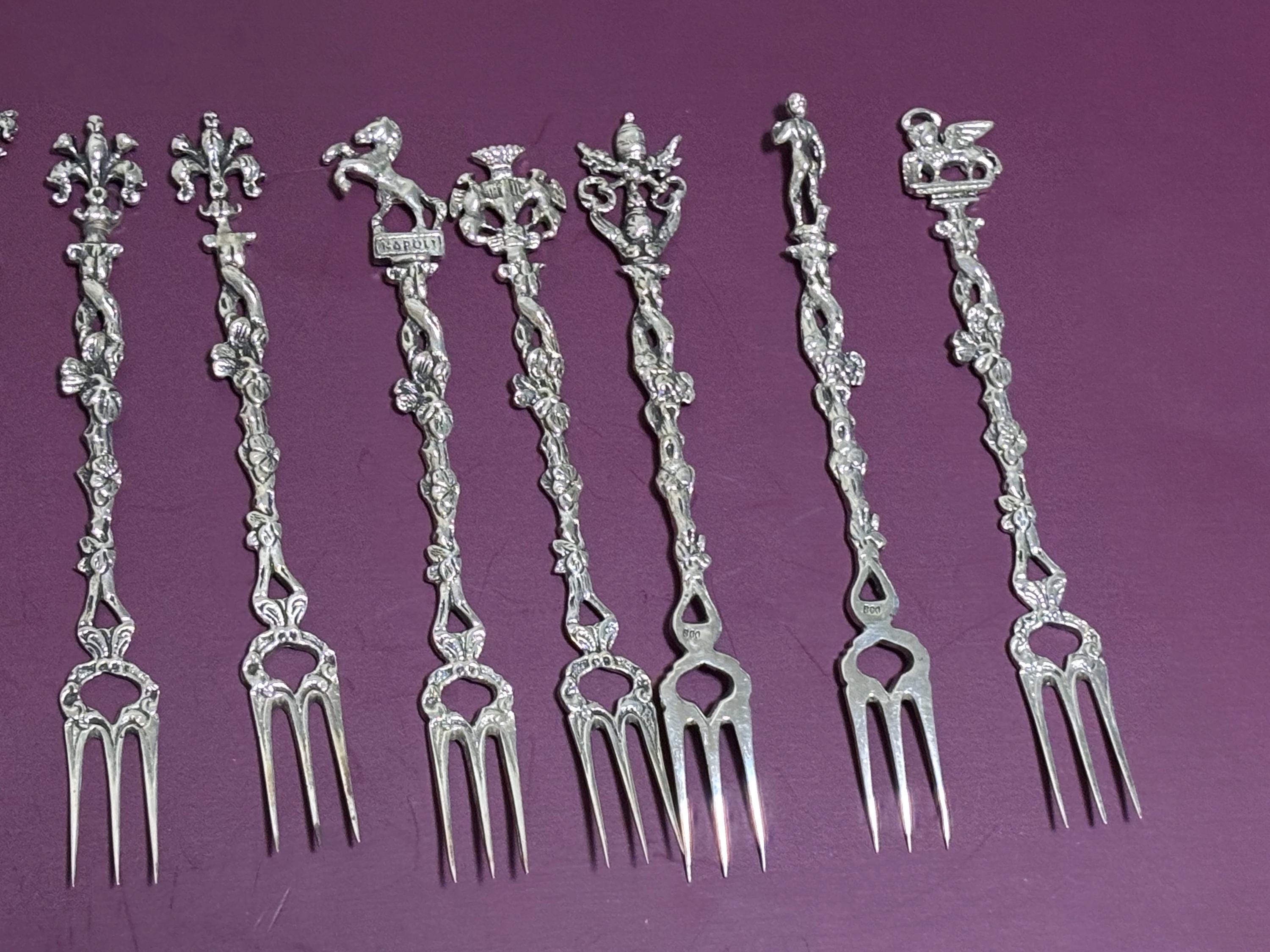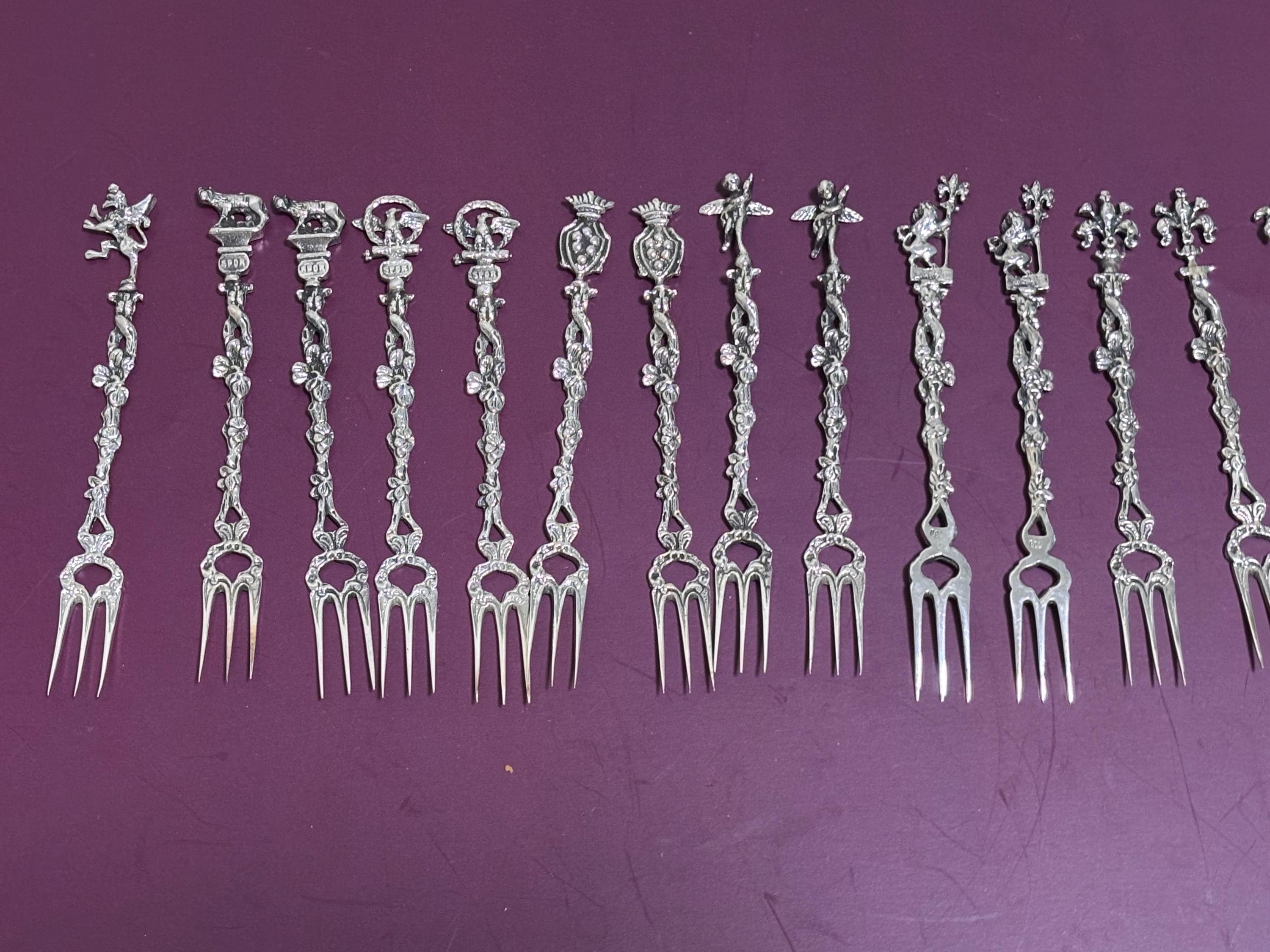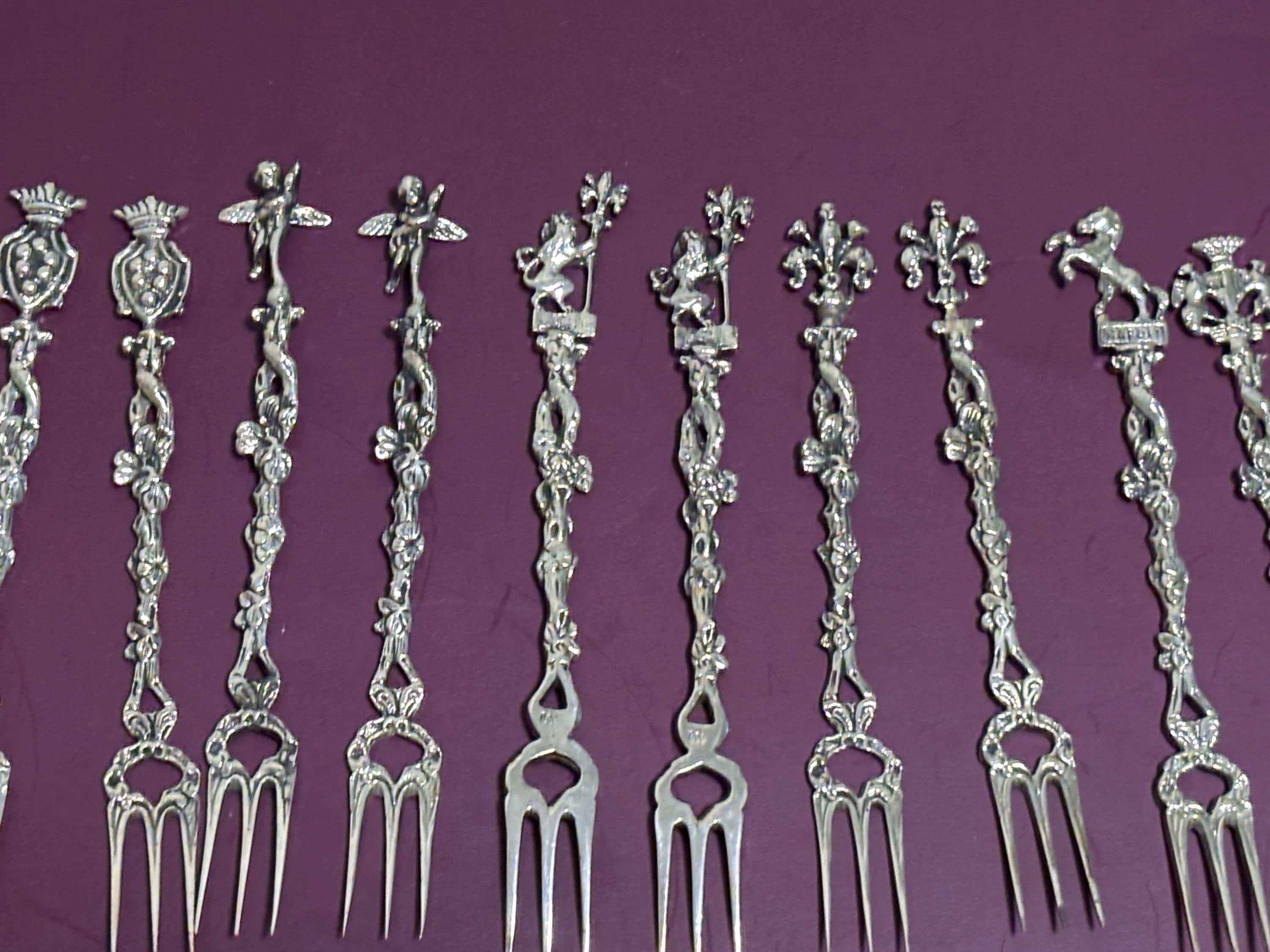VISIT jaxinabox.com FOR ALL OUR LISTINGS!Lot Set of 18 Fancy 3D Figural 800 Silver 3 Tined Serving Fork with Winged Cherub Figures