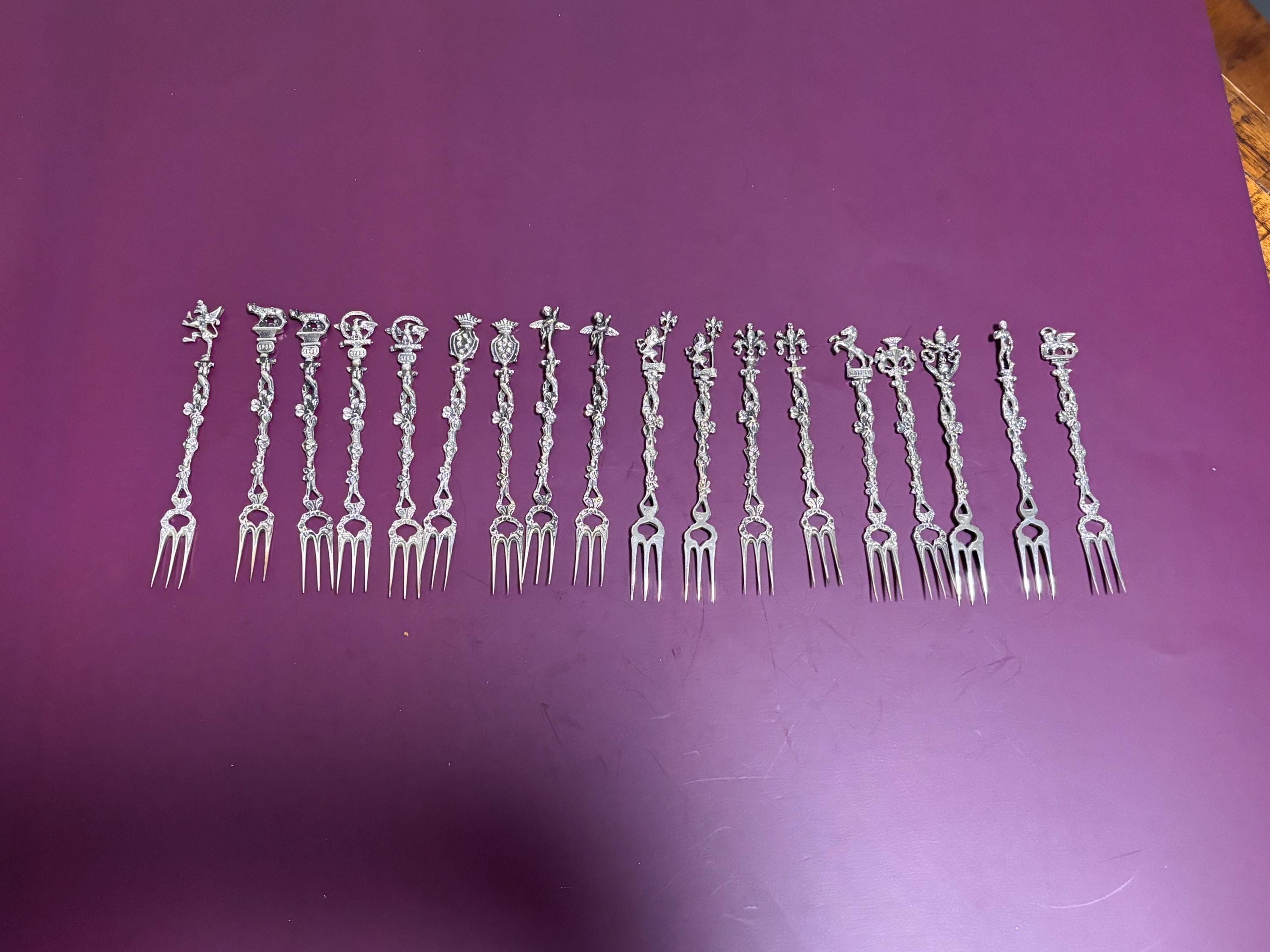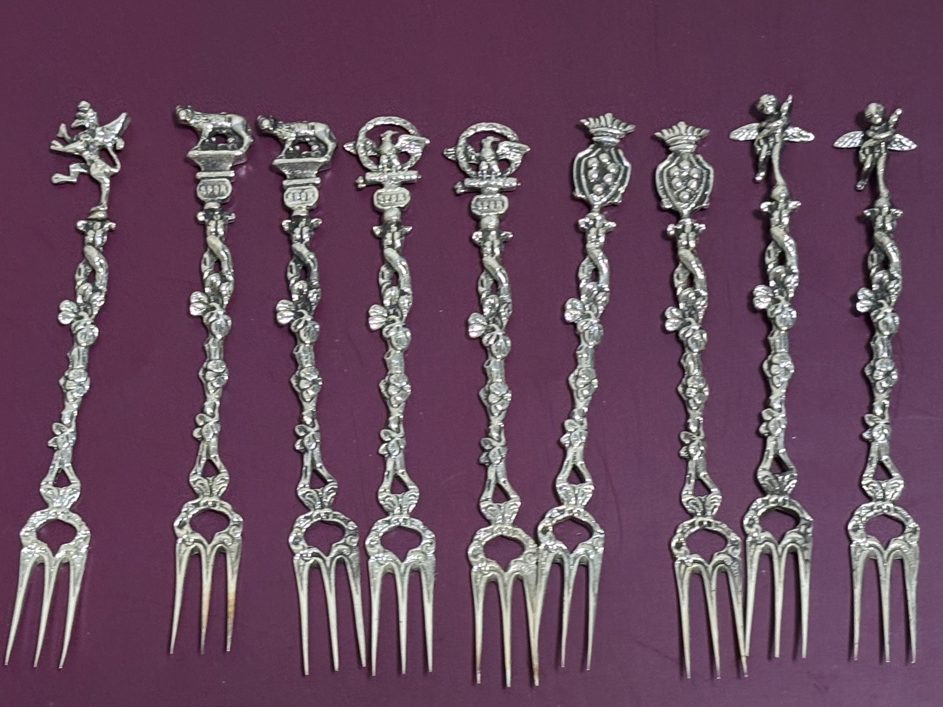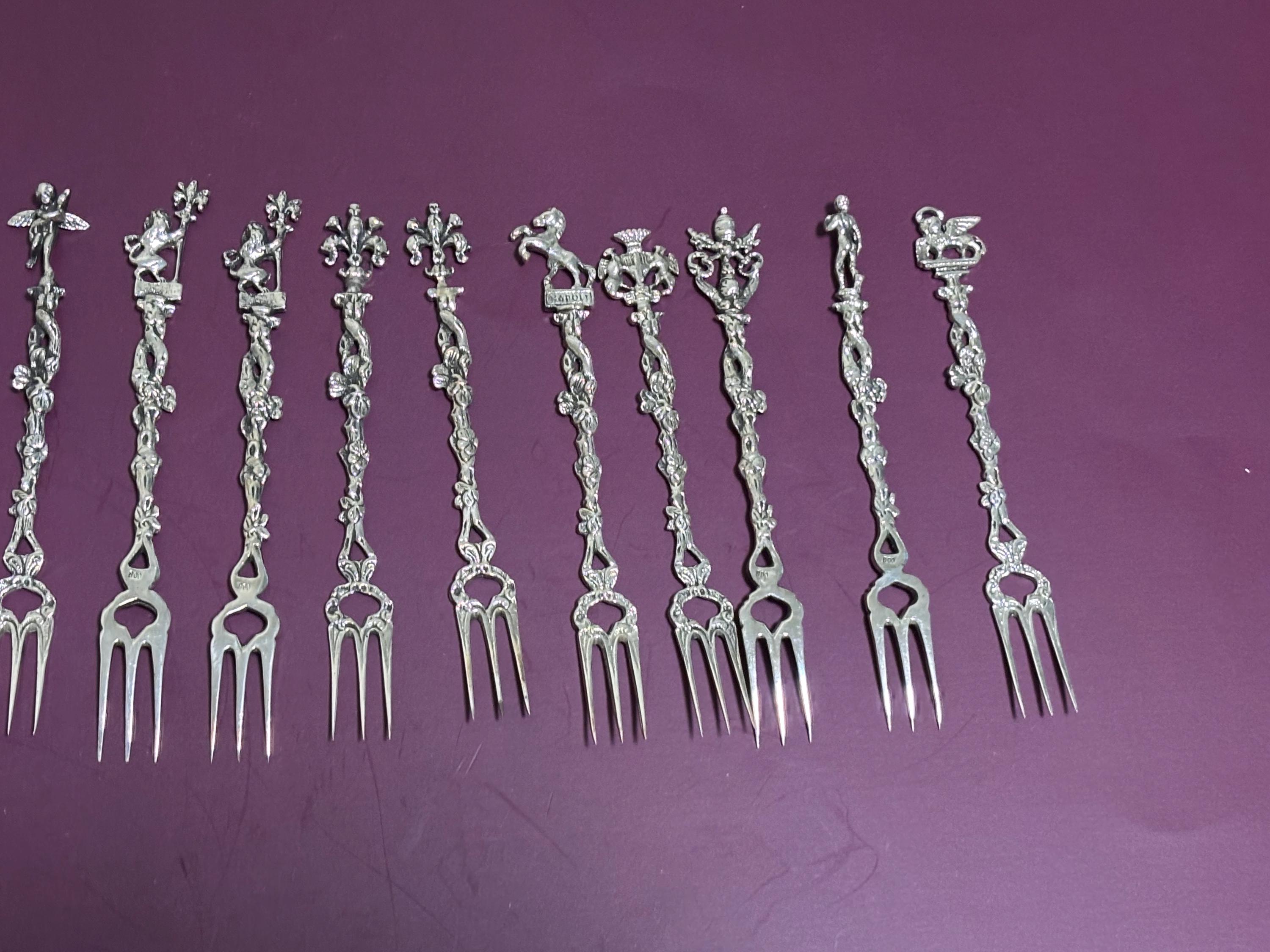 VISIT jaxinabox.com FOR ALL OUR LISTINGS!Lot Set of 18 Fancy 3D Figural 800 Silver 3 Tined Serving Fork with Winged Cherub Figures