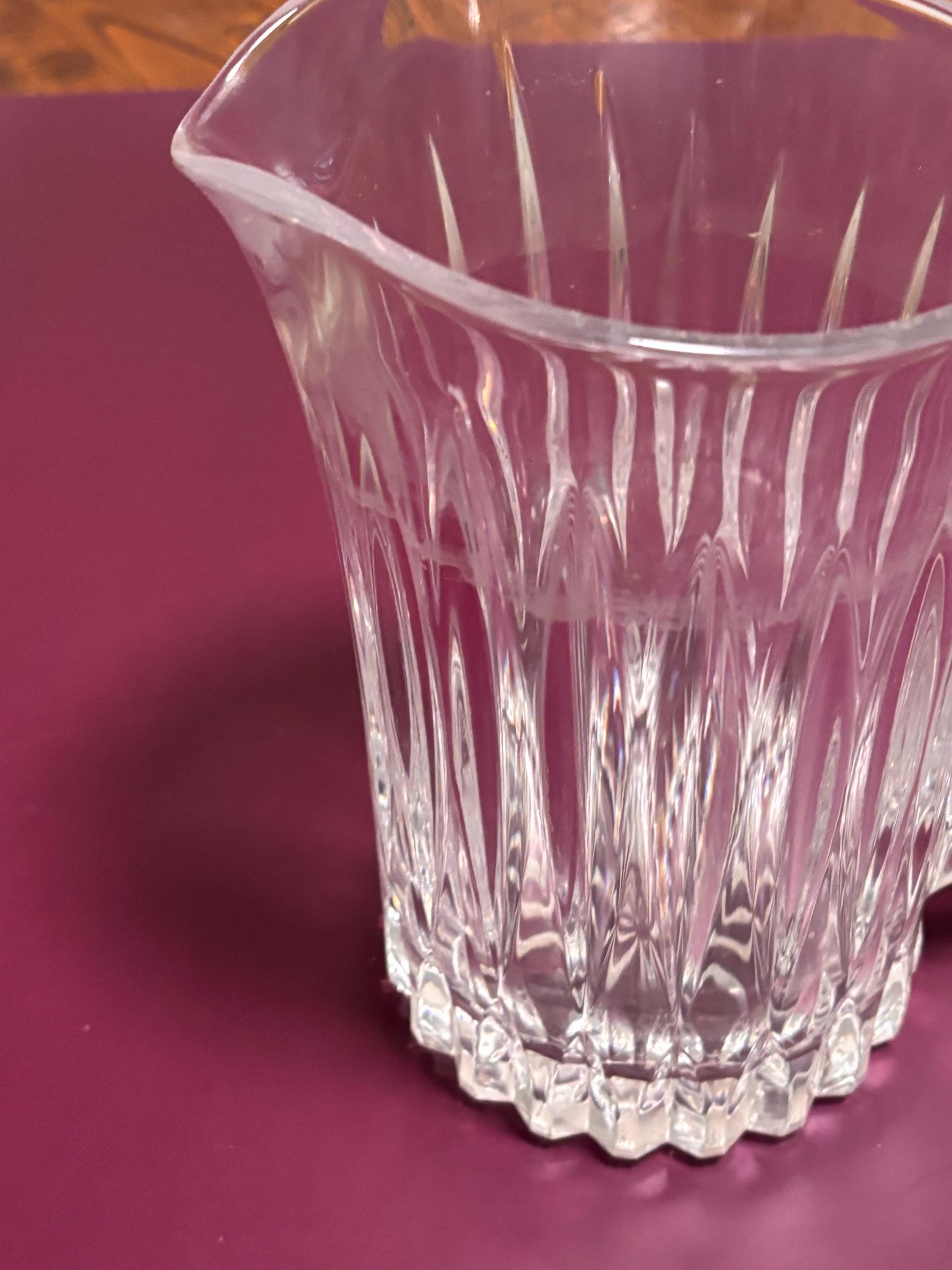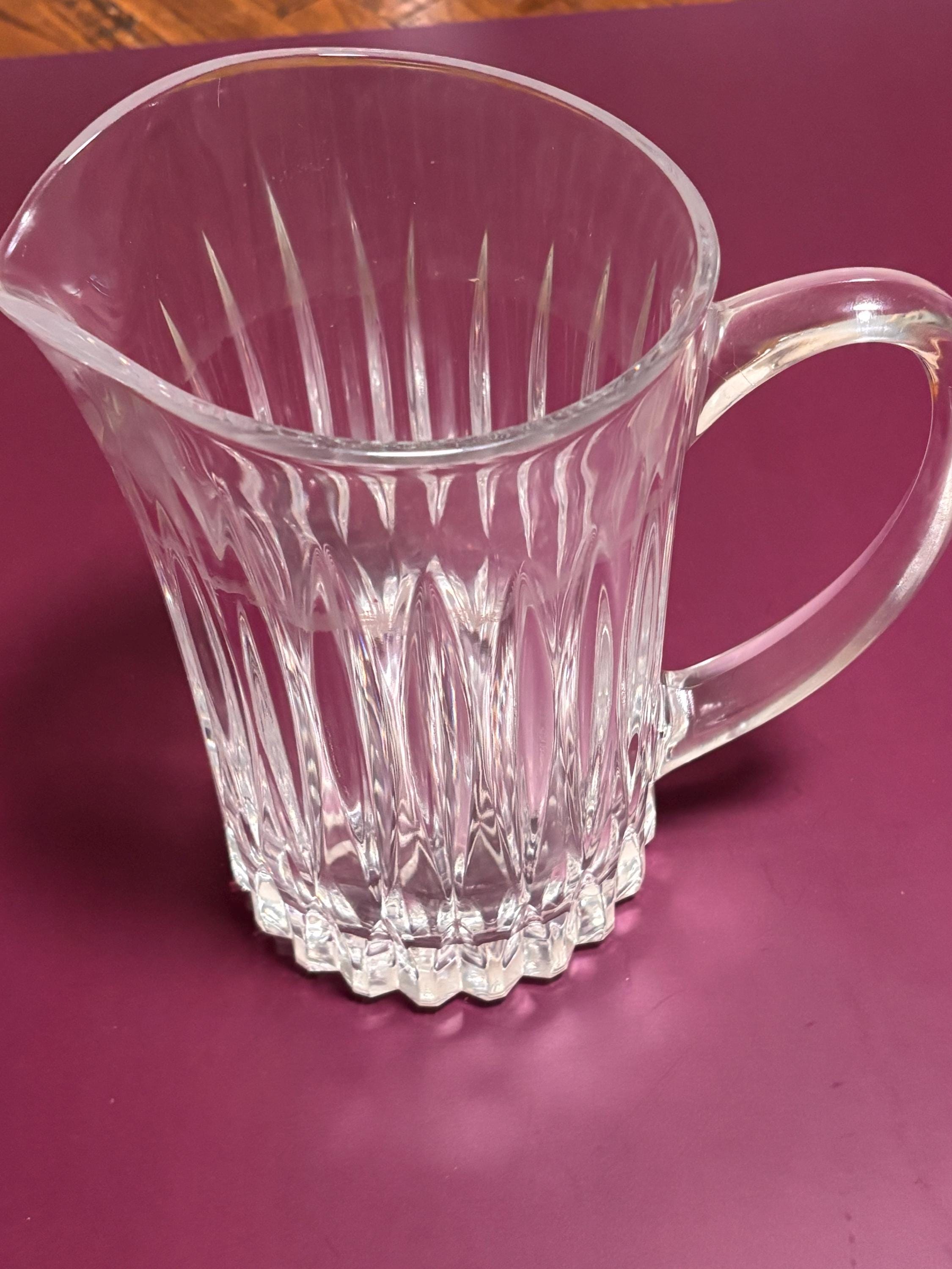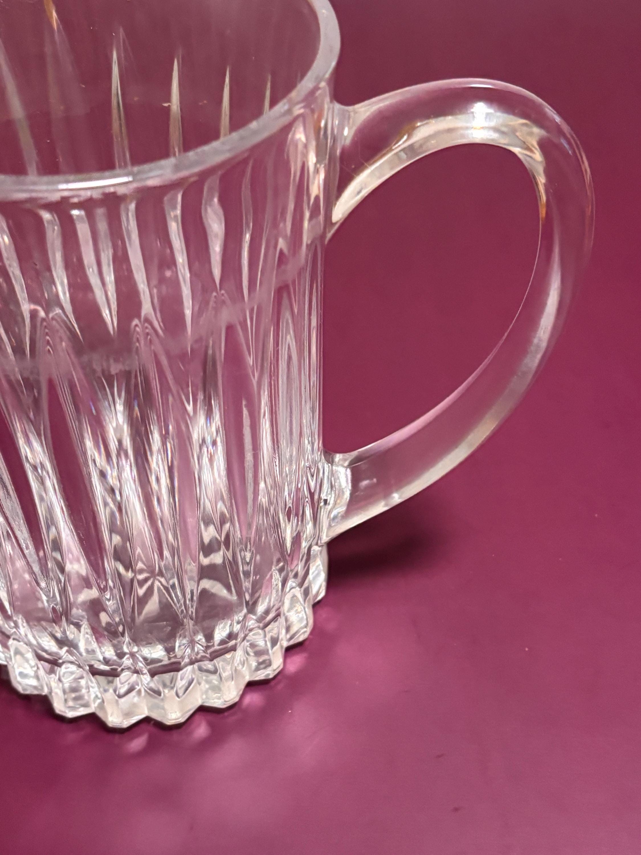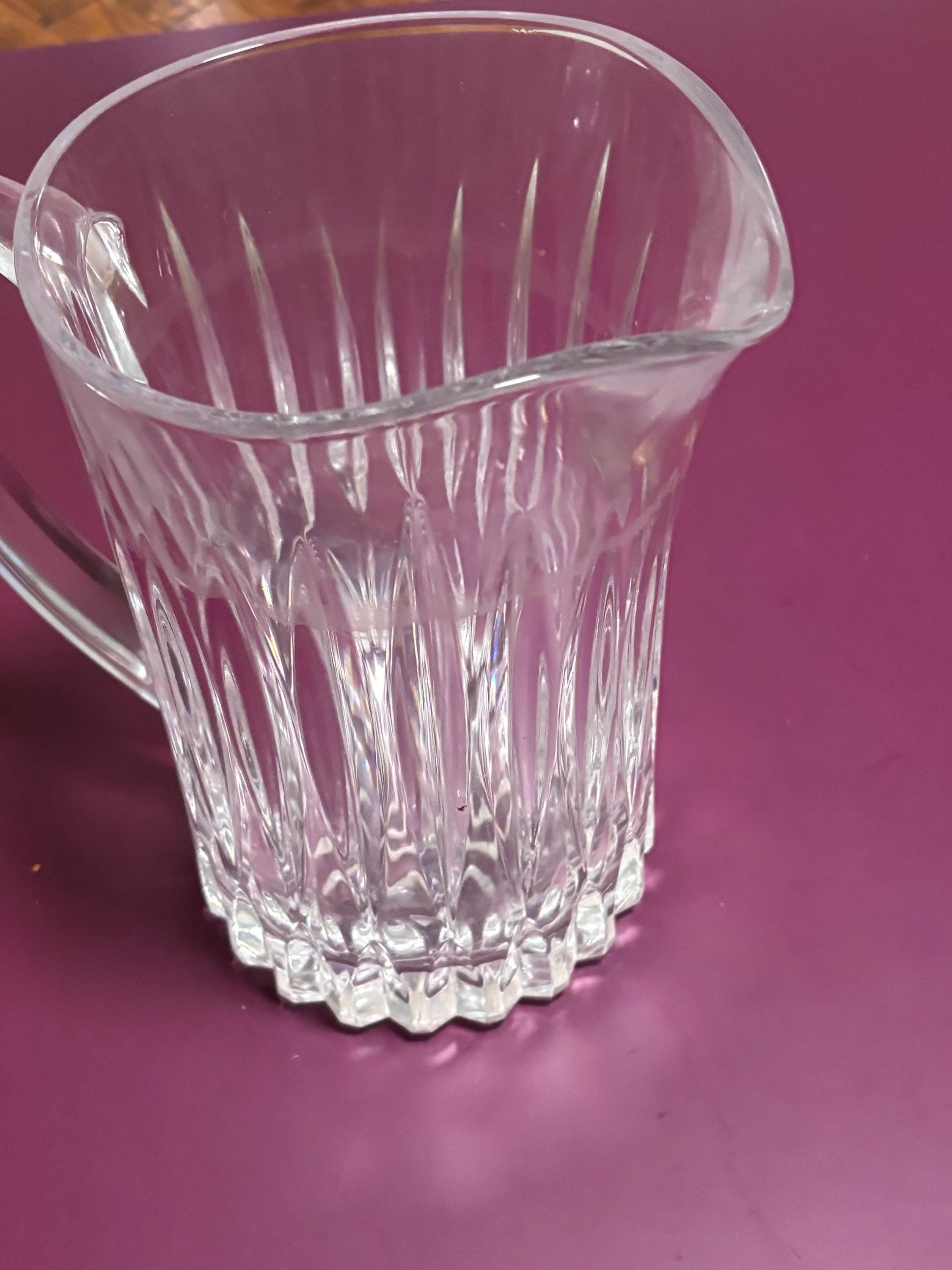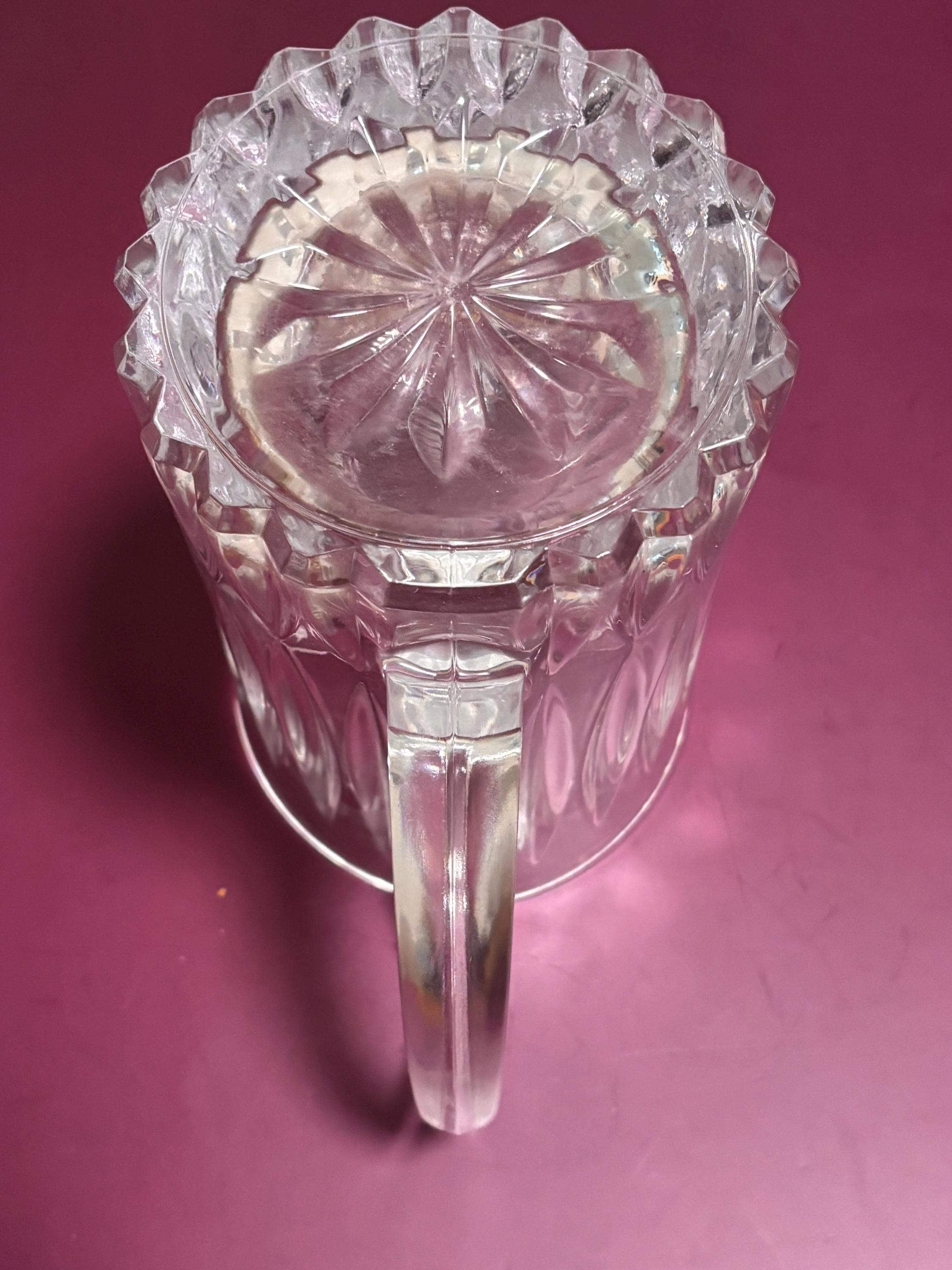 VISIT jaxinabox.com FOR ALL OUR LISTINGS!Vintage Glass Crystal Water Beer Pitcher Jug Handle 8 1/4” x 5 1/2” inch