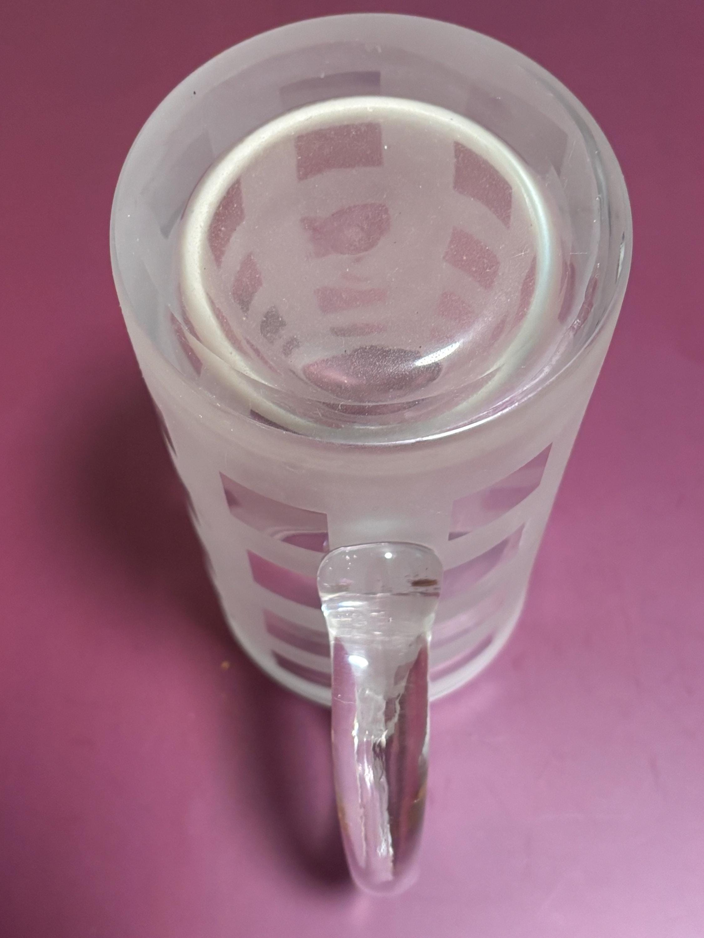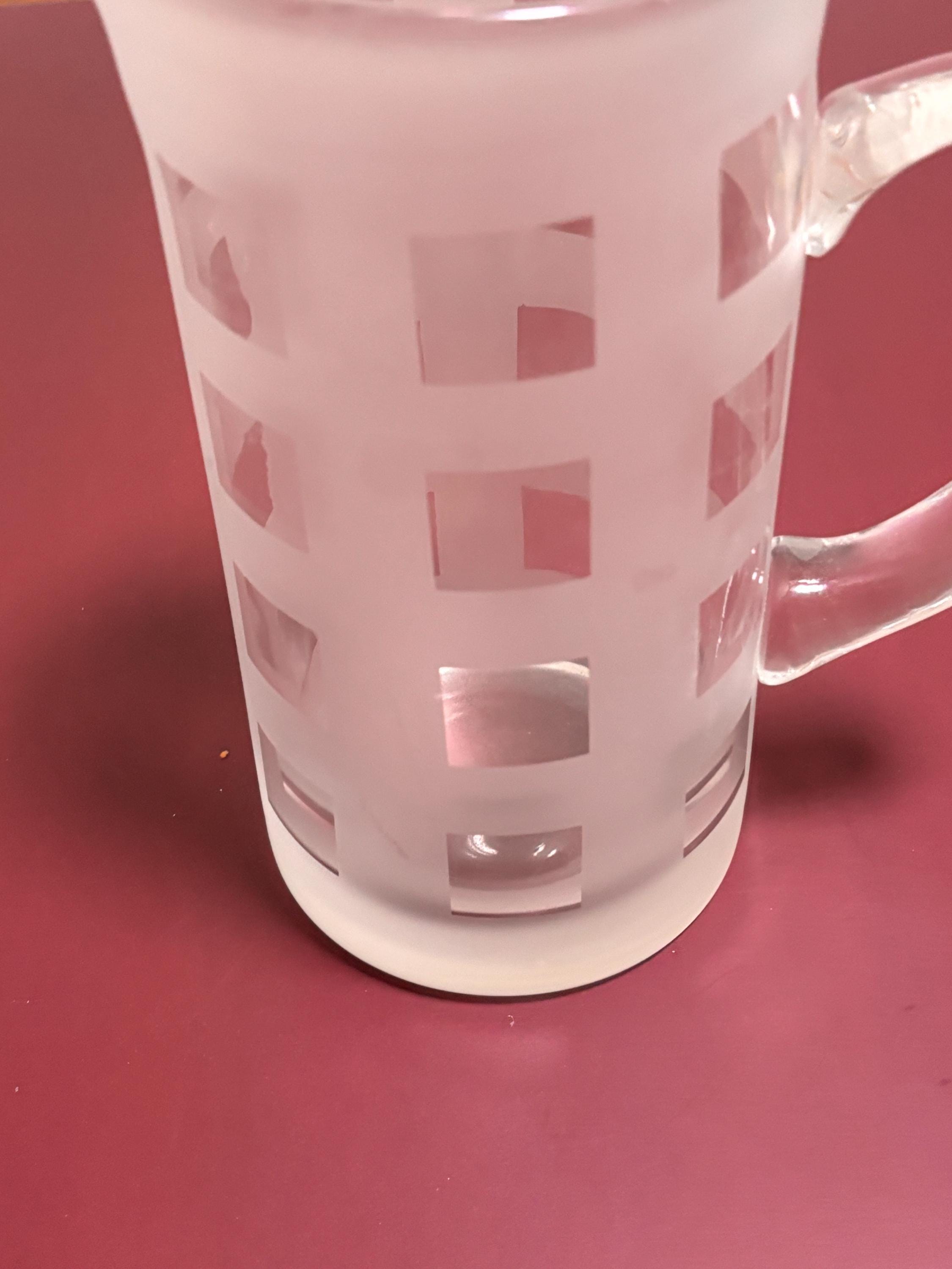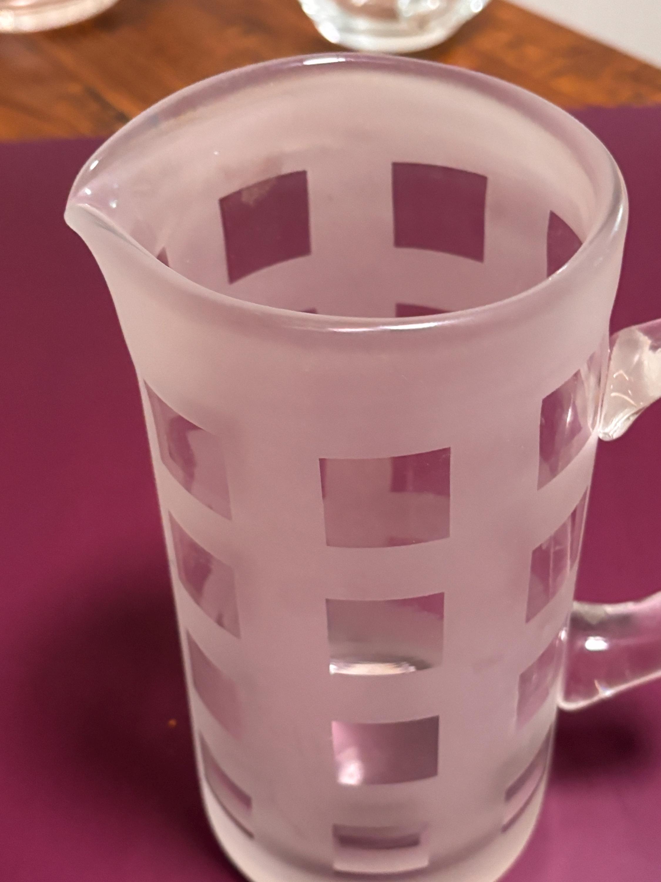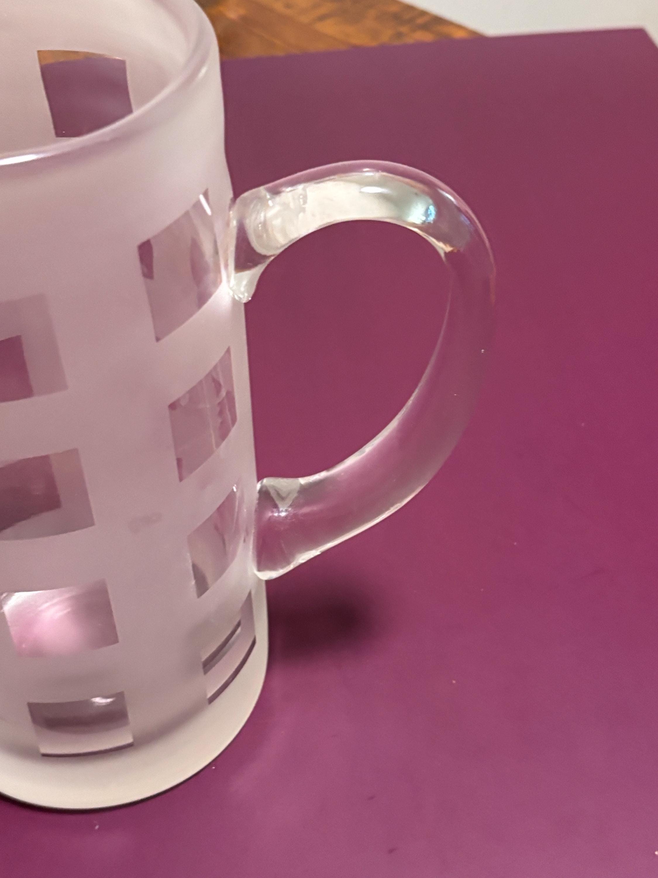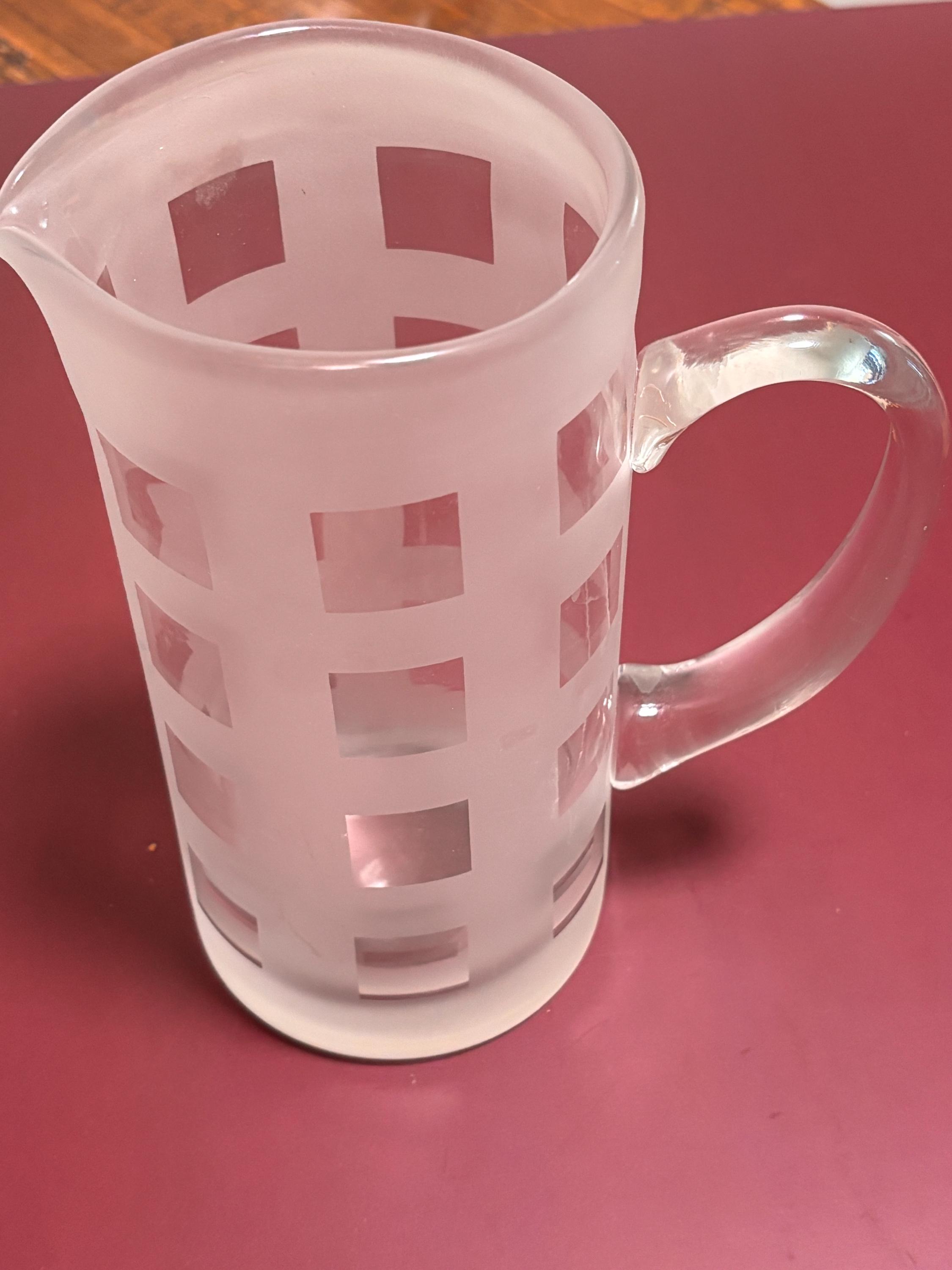 VISIT jaxinabox.com FOR ALL OUR LISTINGS!Vintage Glass Crystal Water Beer Pitcher Jug Handle Frosted 8 1/4” x 4 1/2”inch