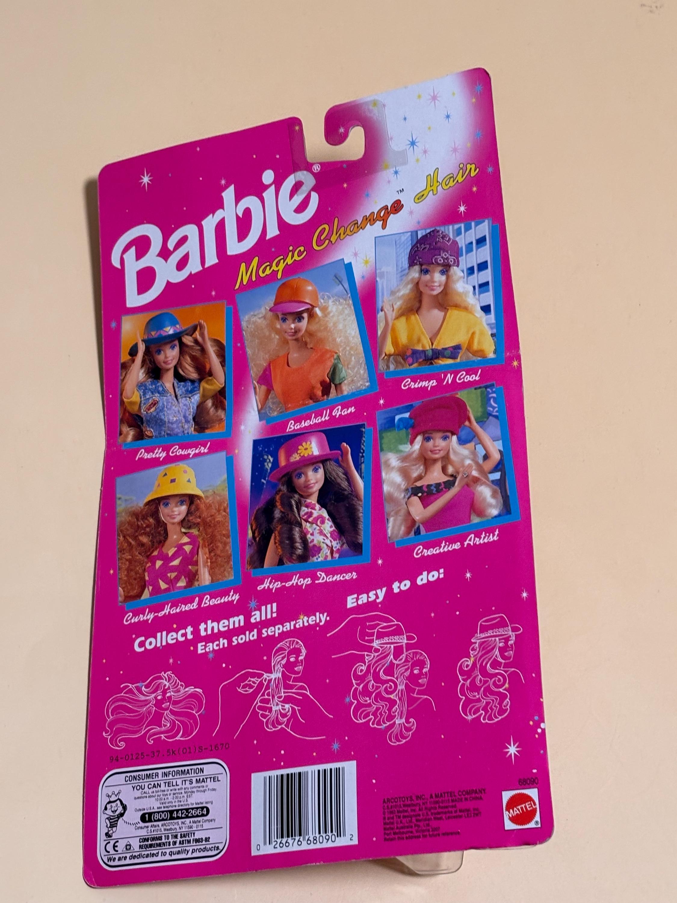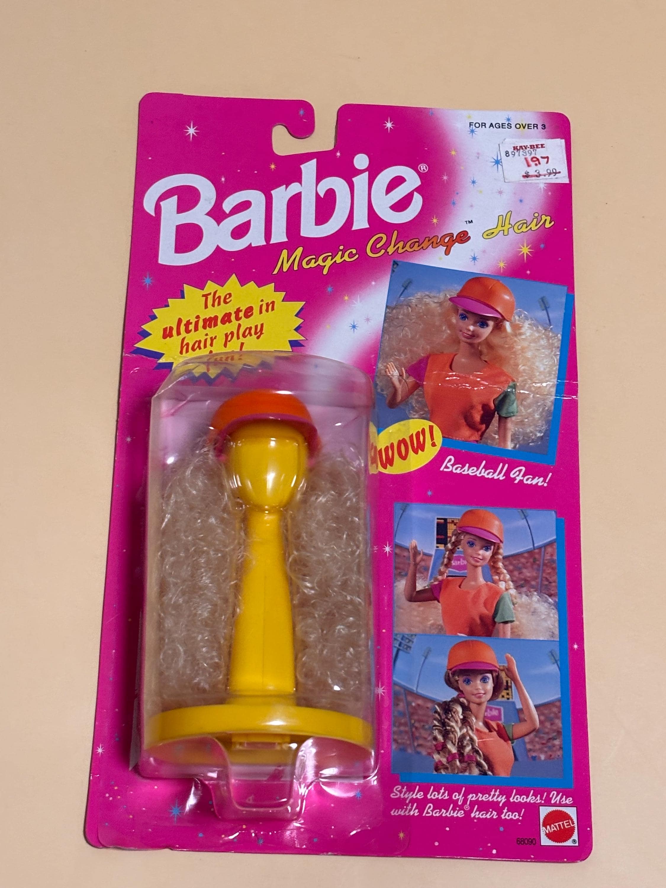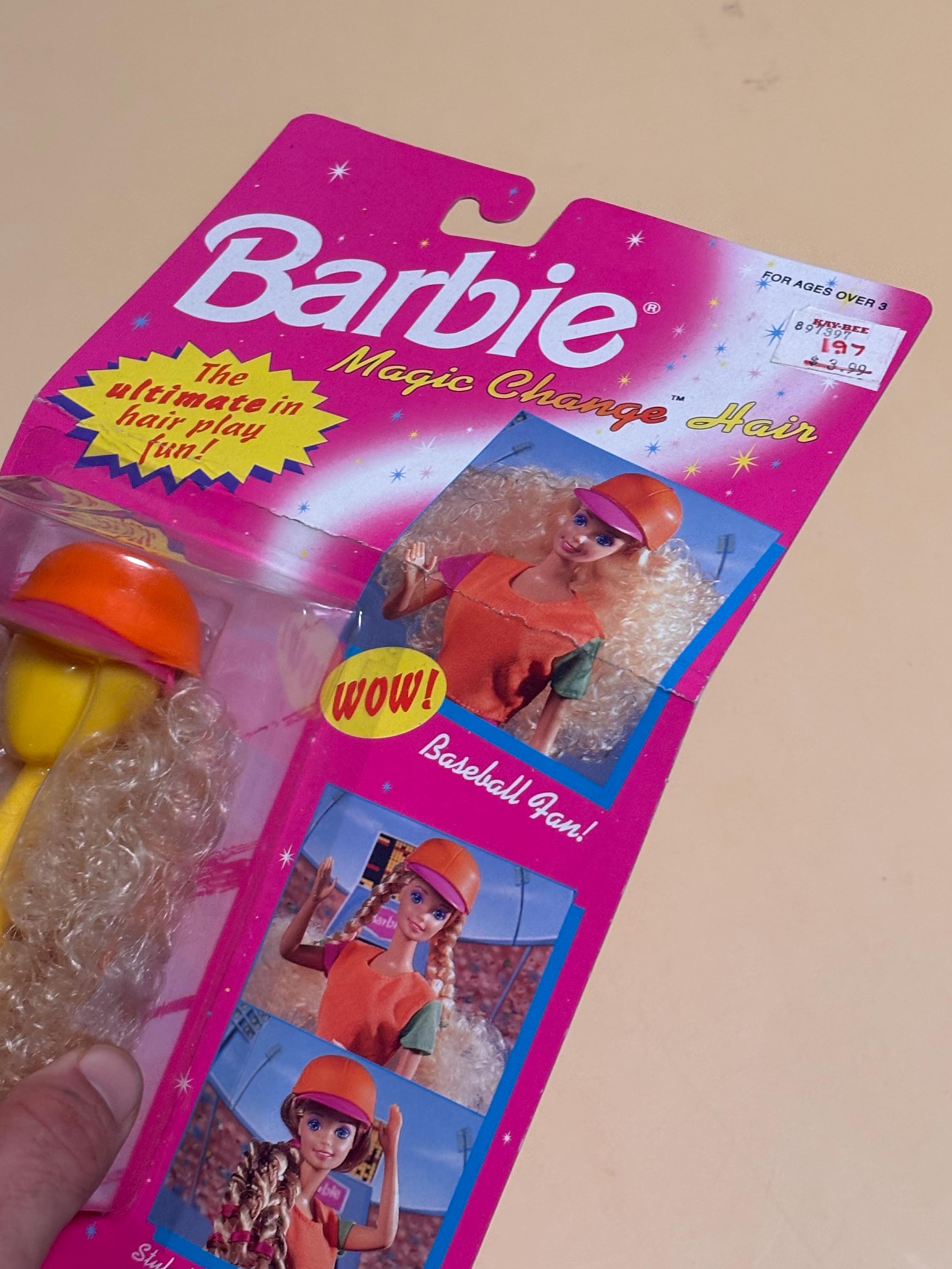 VISIT jaxinabox.com FOR ALL OUR LISTINGS!Vintage Mattel Barbie Magic Change Hair Baseball Fan 68090 Curly Blonde Wig 1993