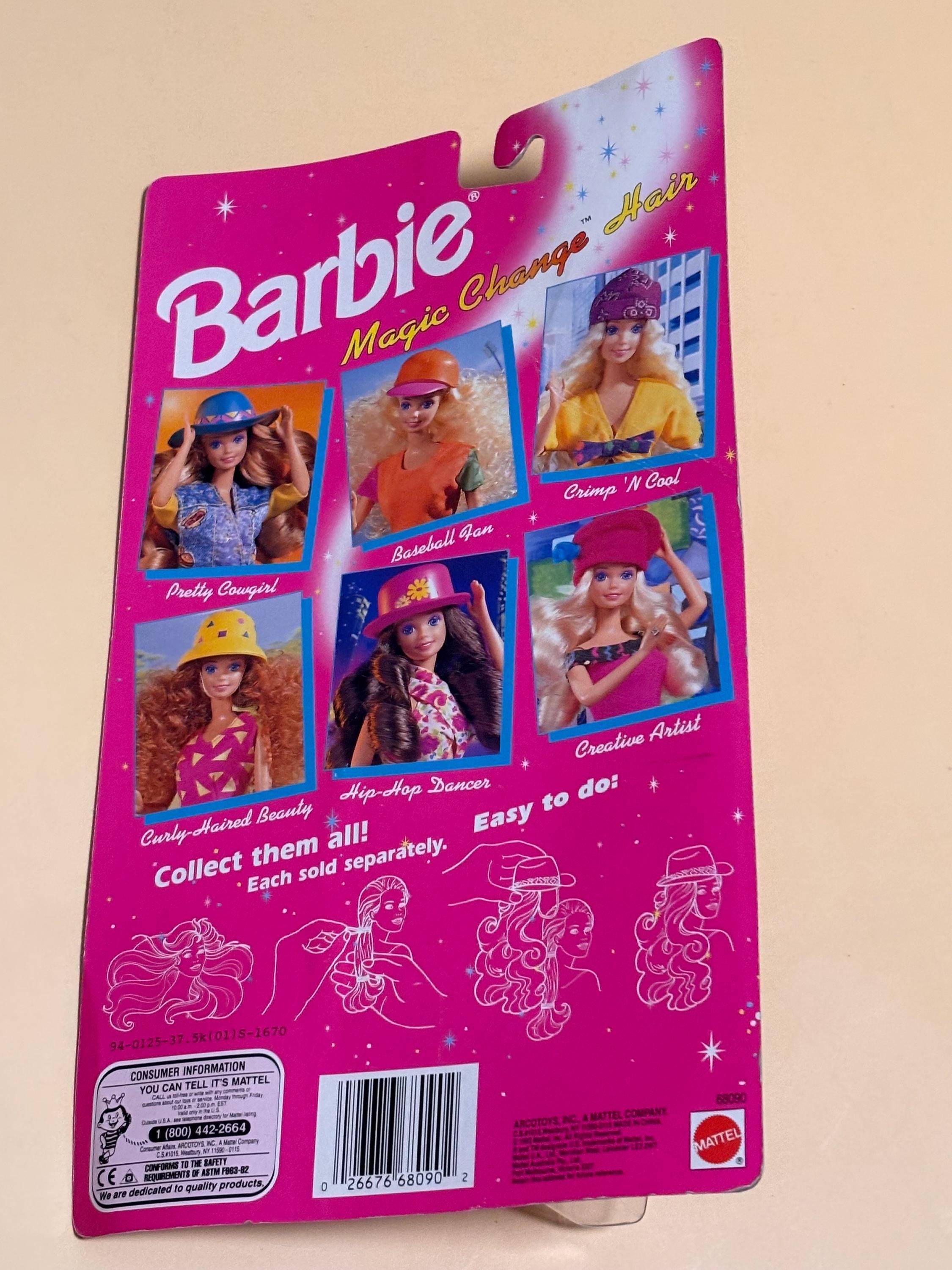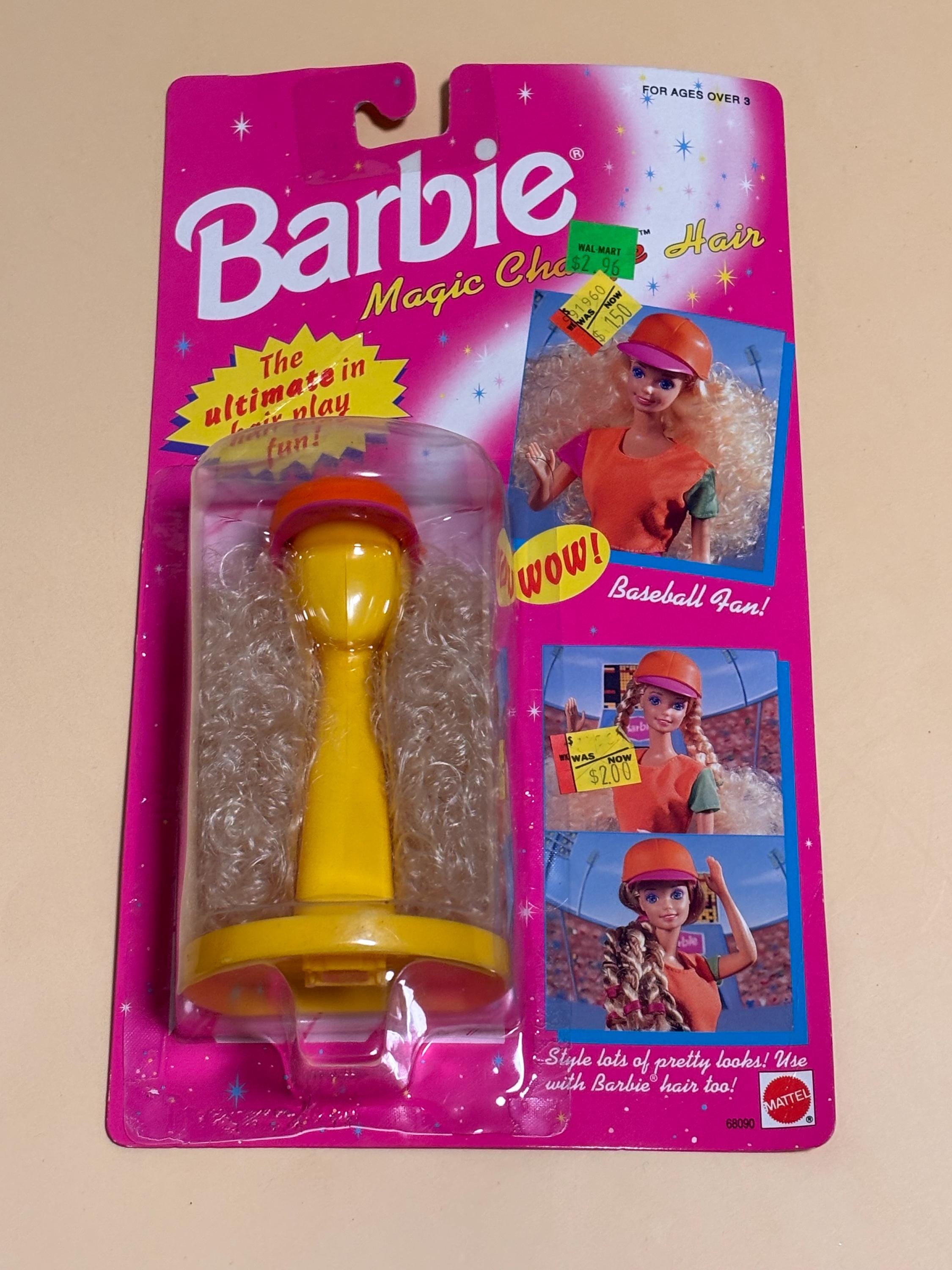 VISIT jaxinabox.com FOR ALL OUR LISTINGS!Vintage Mattel Barbie Magic Change Hair Baseball Fan 68090 Curly Blonde Wig 1993