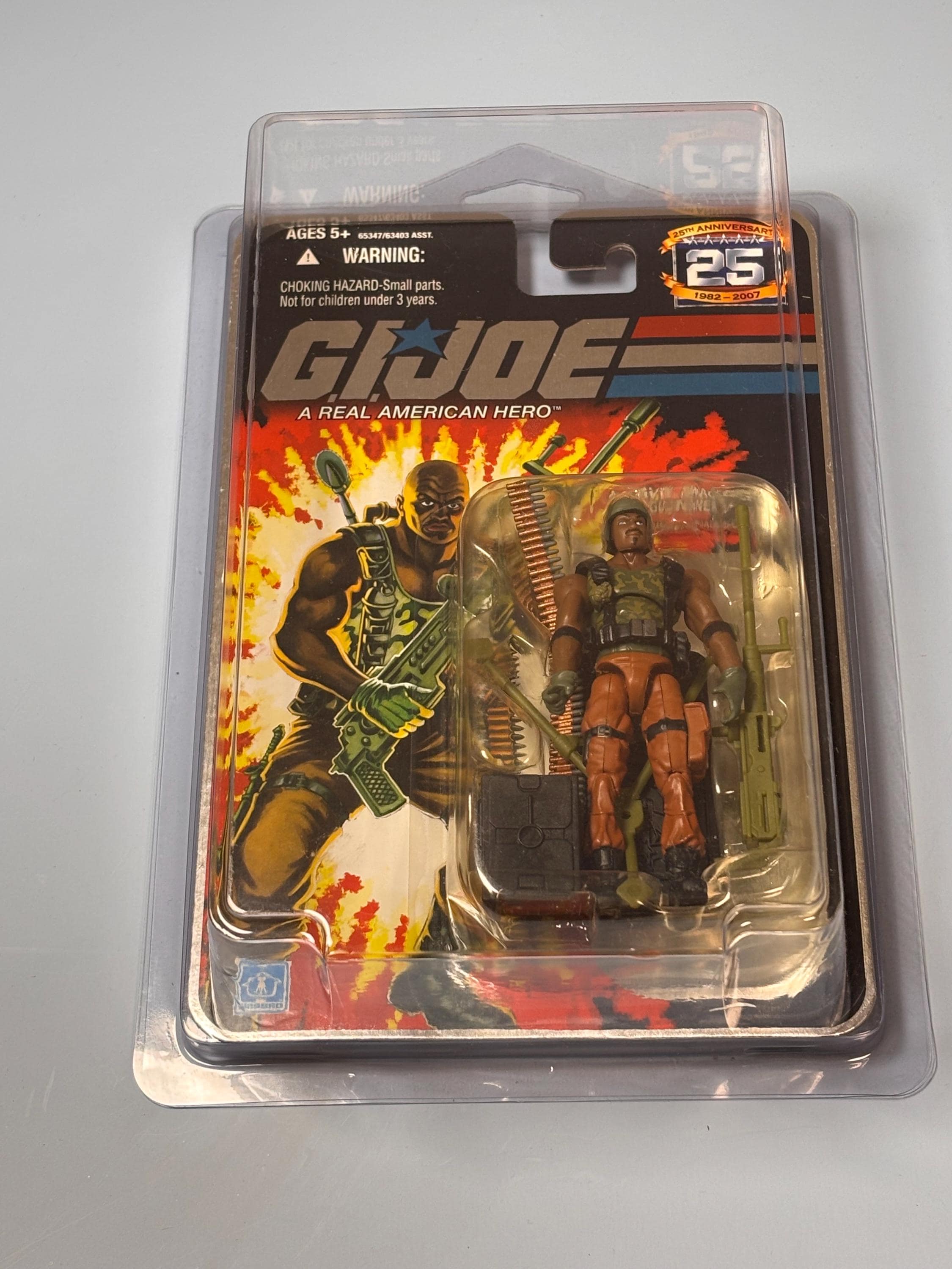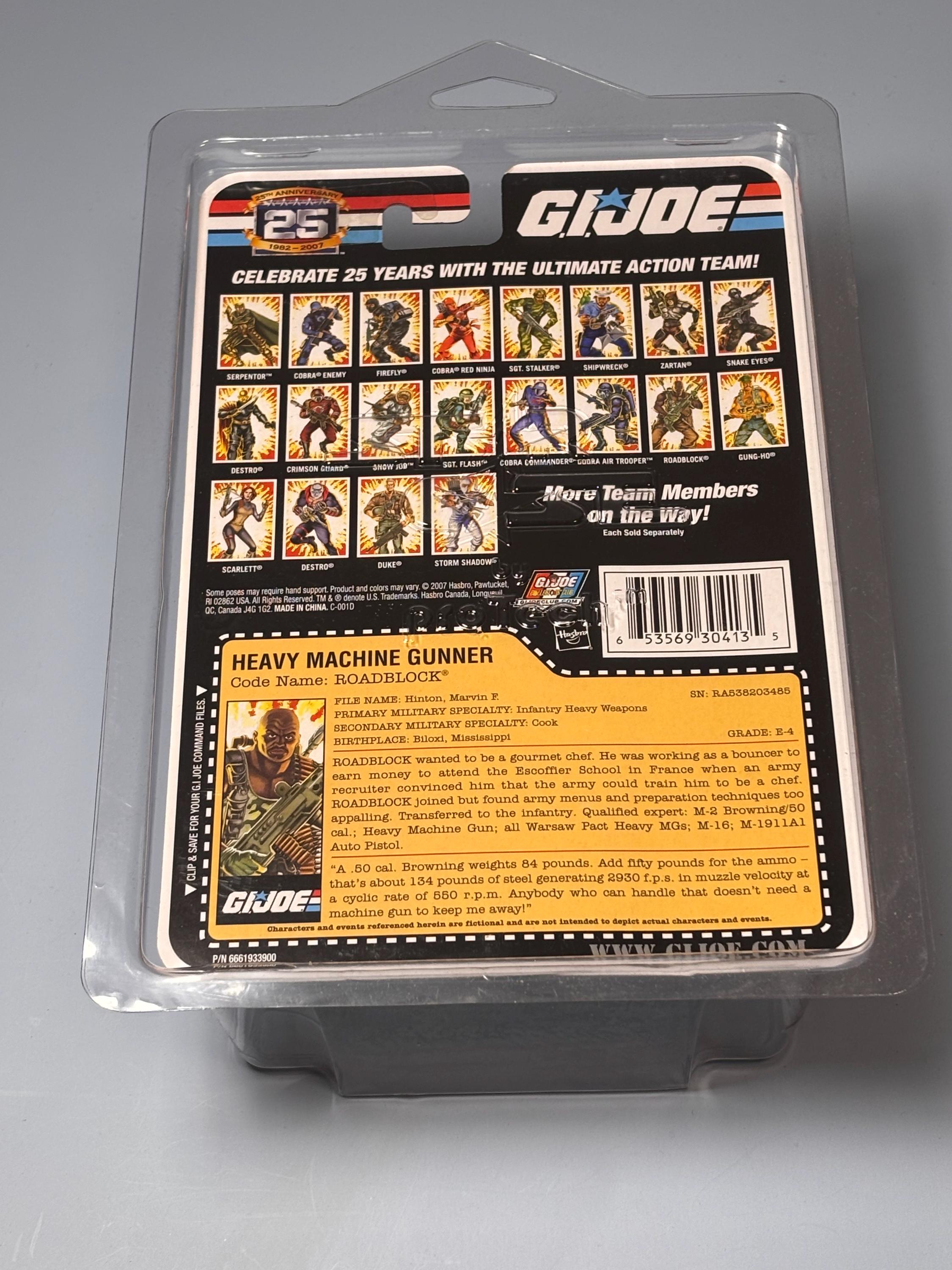 VISIT jaxinabox.com FOR ALL OUR LISTINGS!Roadblock Heavy Machine Gunner G.I. Joe 3.75" HASBRO 25th anniversary Foil Mint with Case