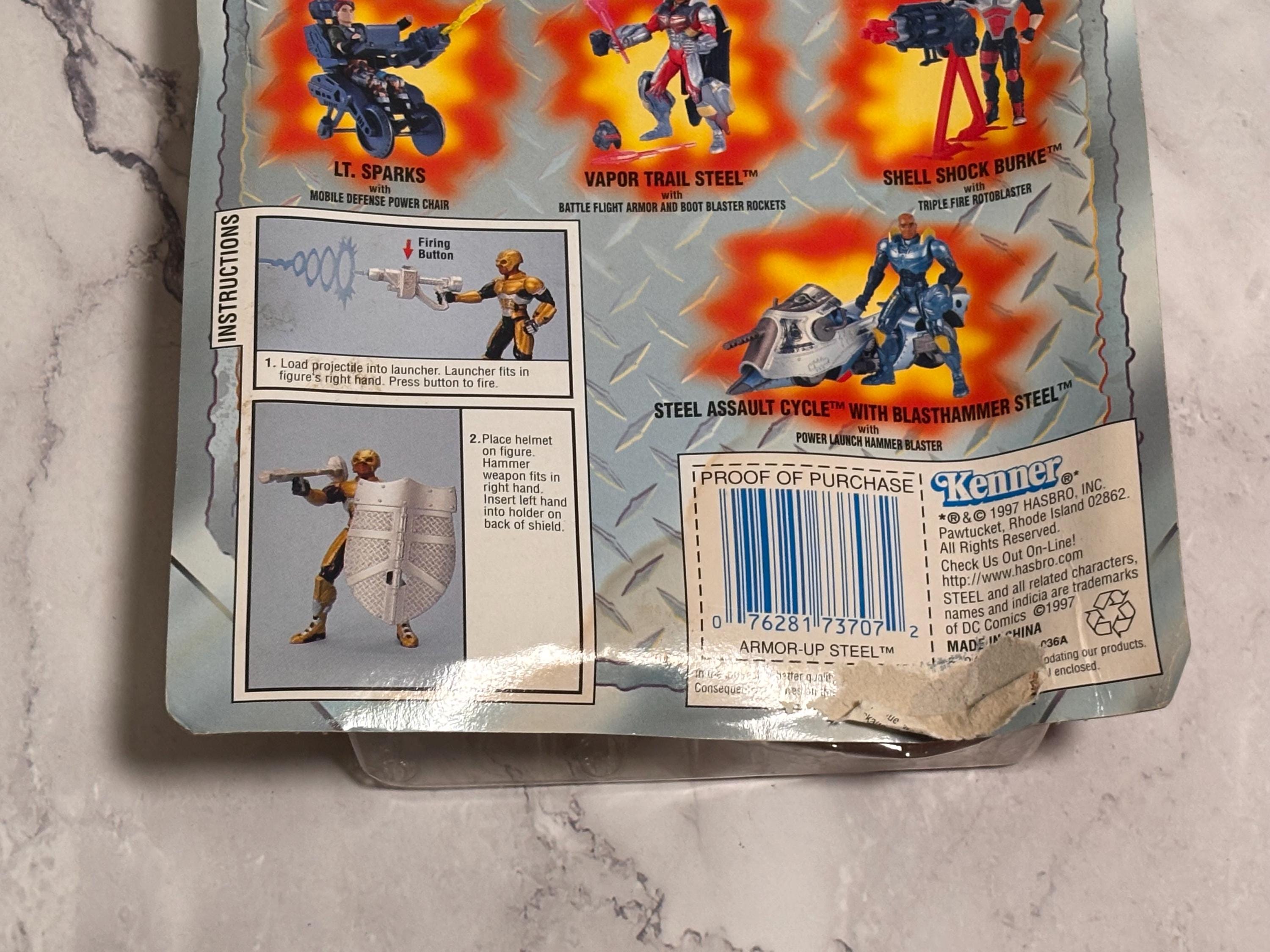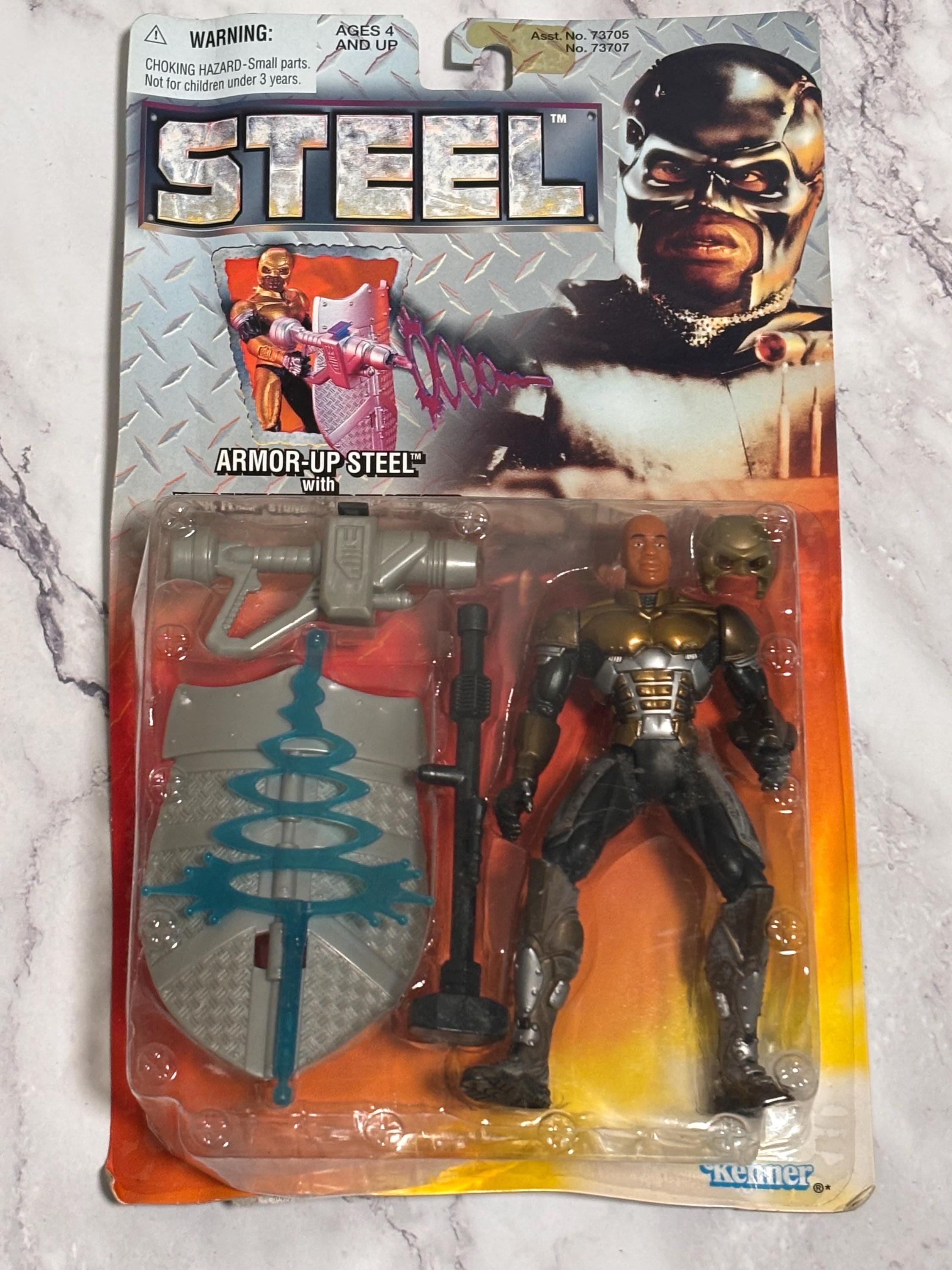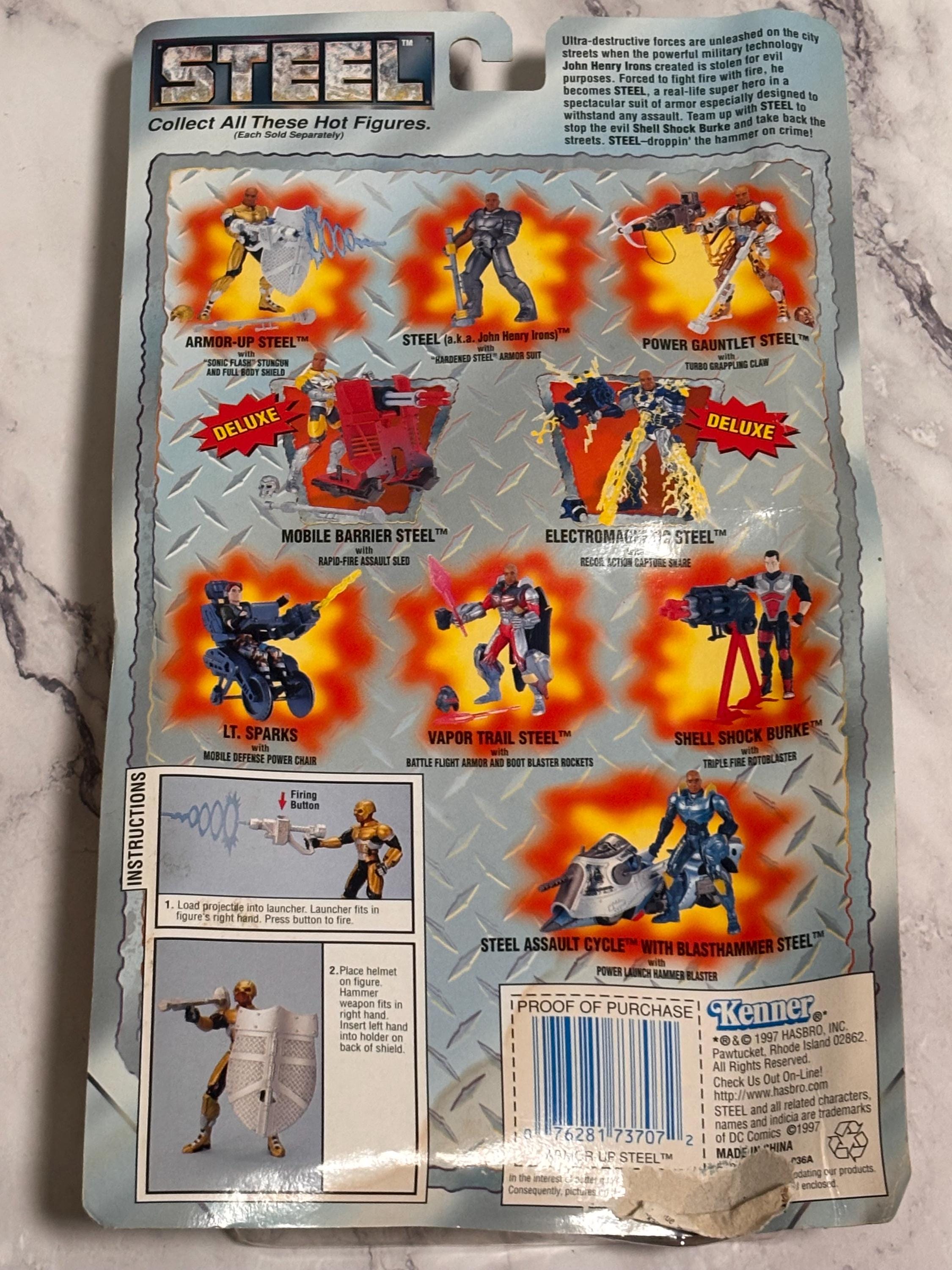 VISIT jaxinabox.com FOR ALL OUR LISTINGS!Kenner Steel 1997 Armor Up Steel w/ Sonic Flash Stungun and Full Body Shield New