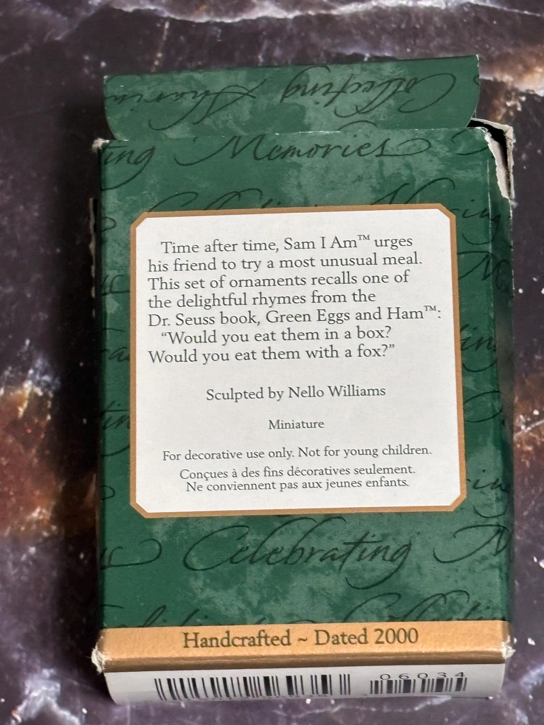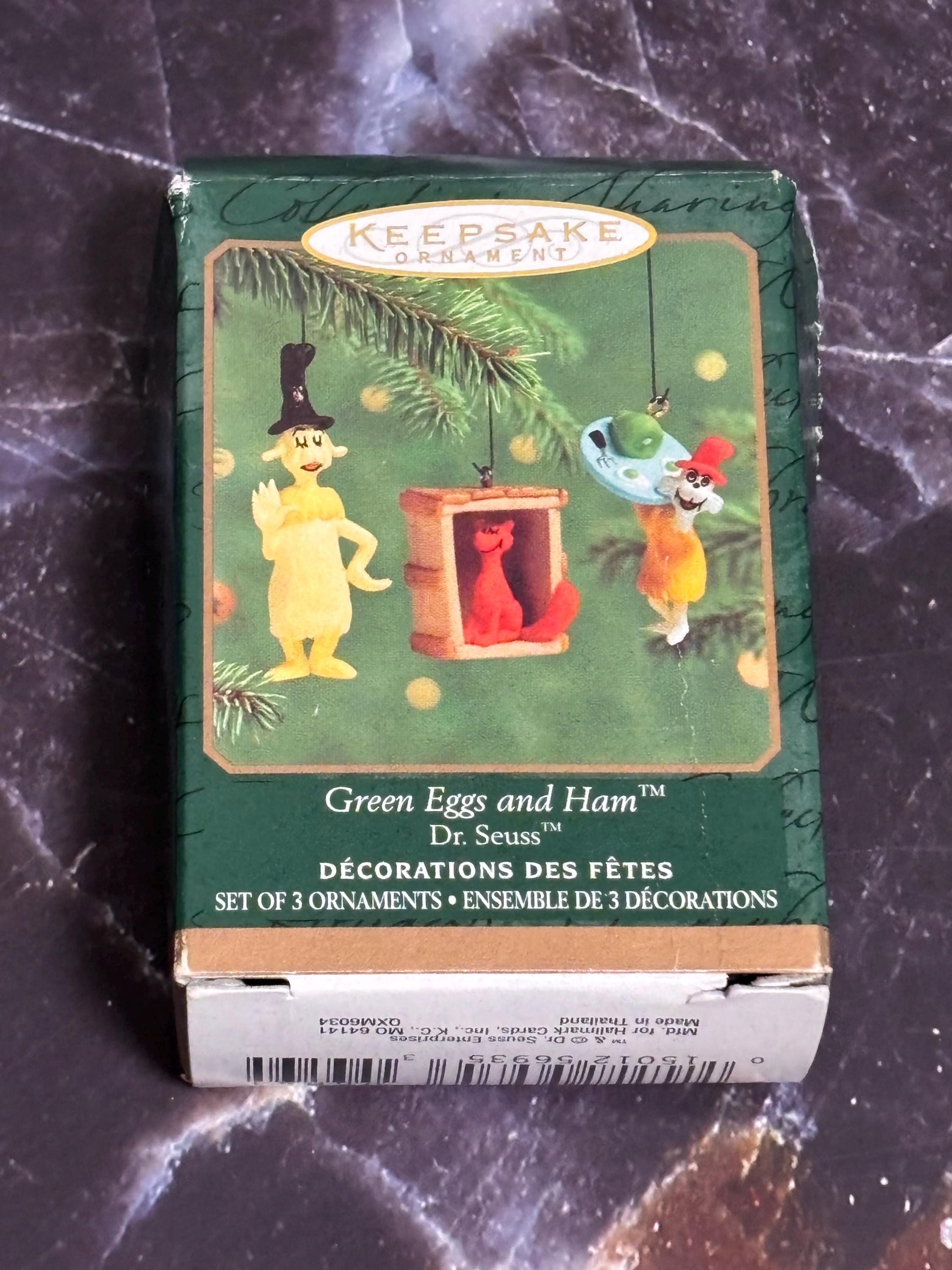 VISIT jaxinabox.com FOR ALL OUR LISTINGS!2000 Hallmark Keepsake Dr Seuss Green Eggs & Ham Miniature 3 Piece Ornament Set