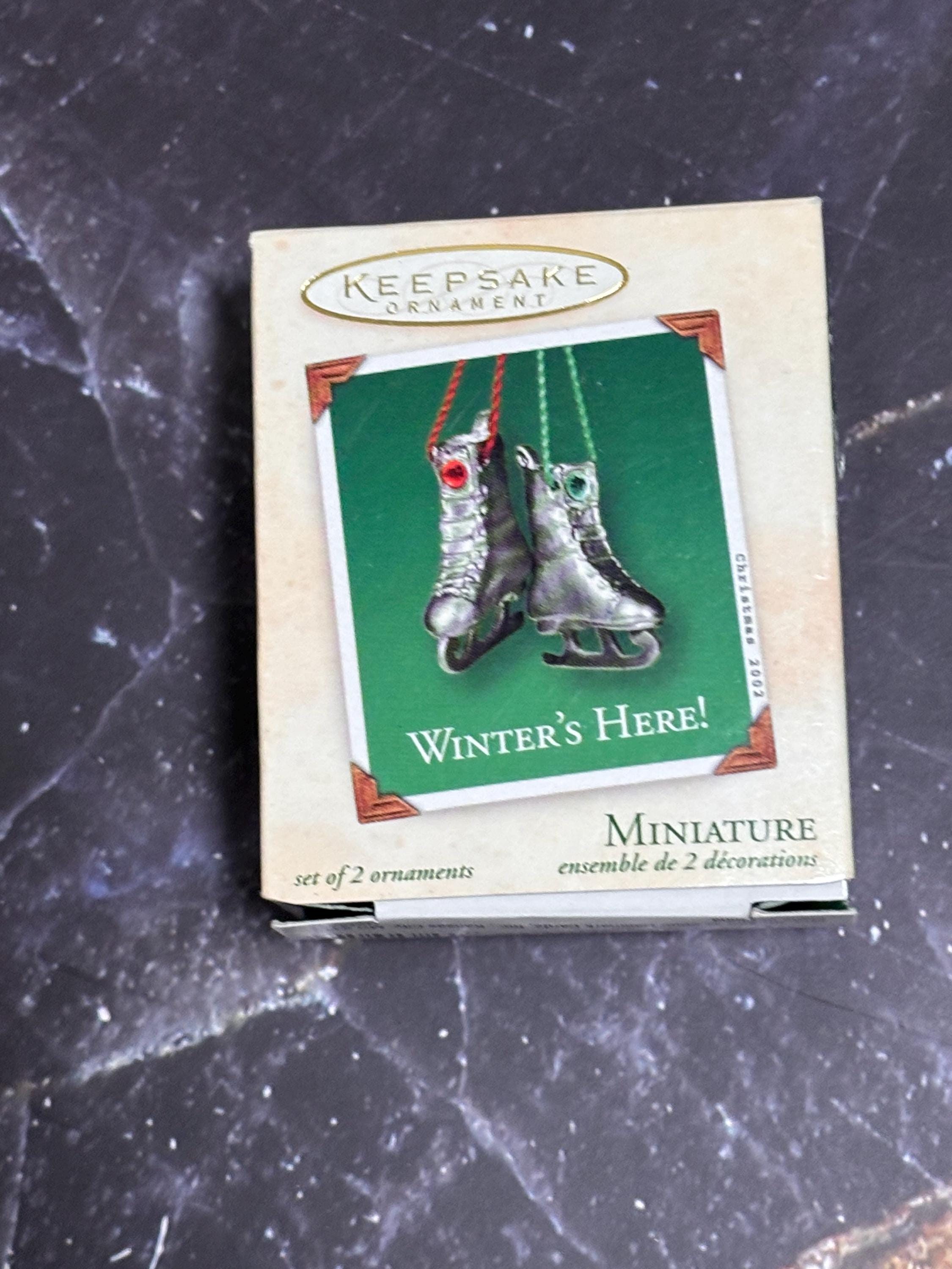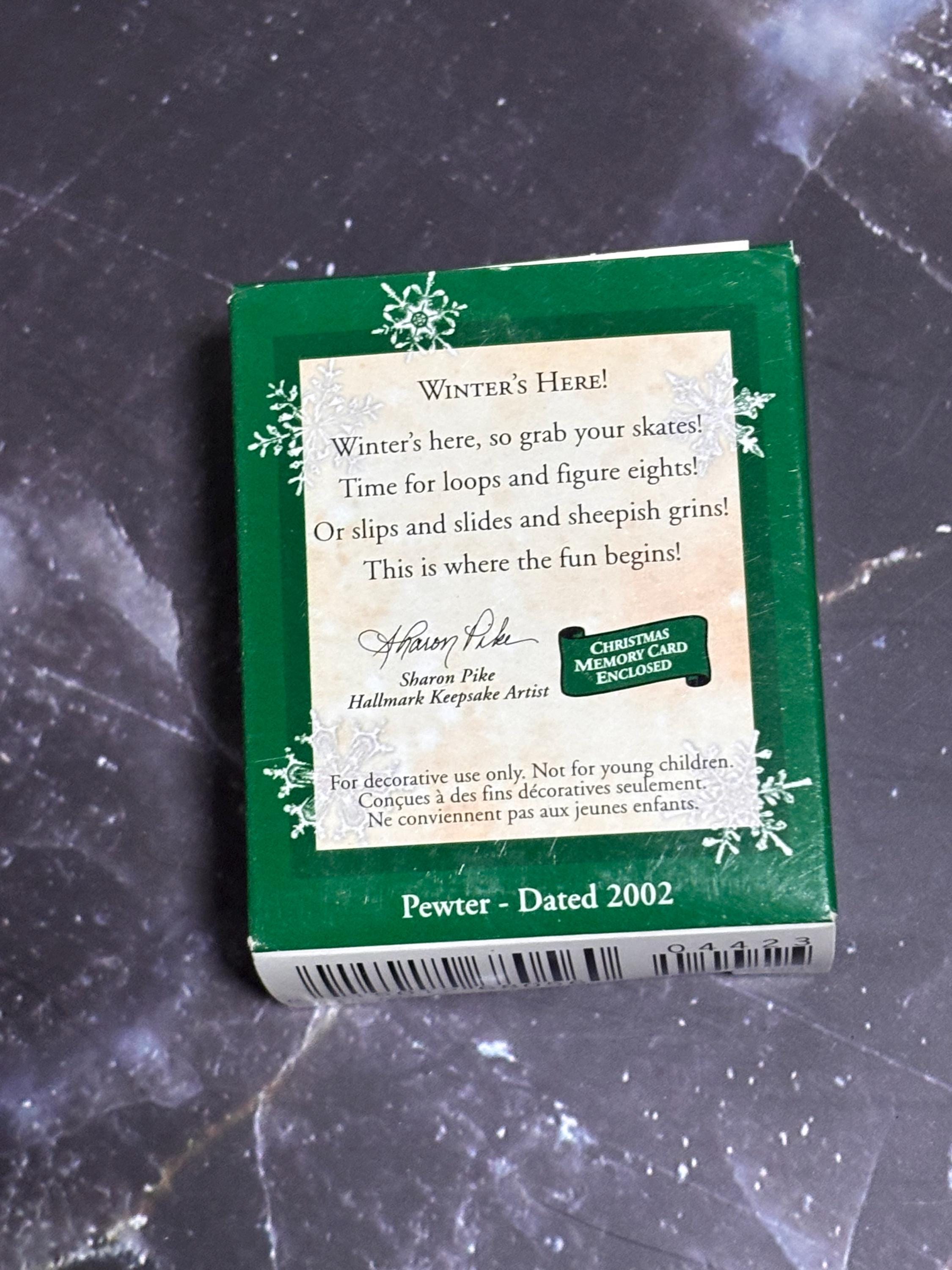 VISIT jaxinabox.com FOR ALL OUR LISTINGS!Hallmark Keepsake Winter's Here! Set of 2 Miniature Skate Ornaments 2002 Pewter
