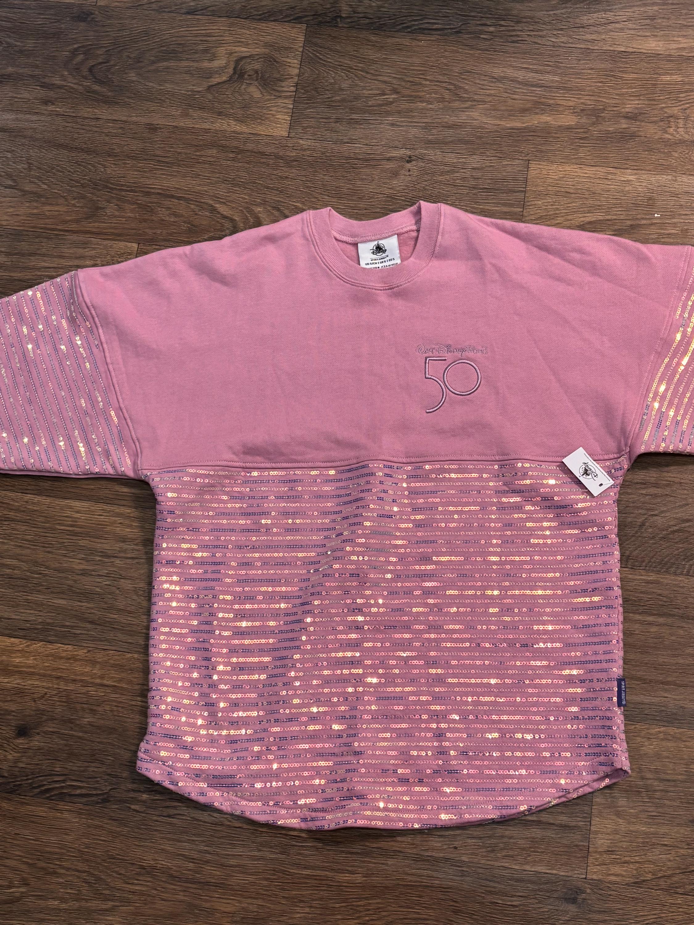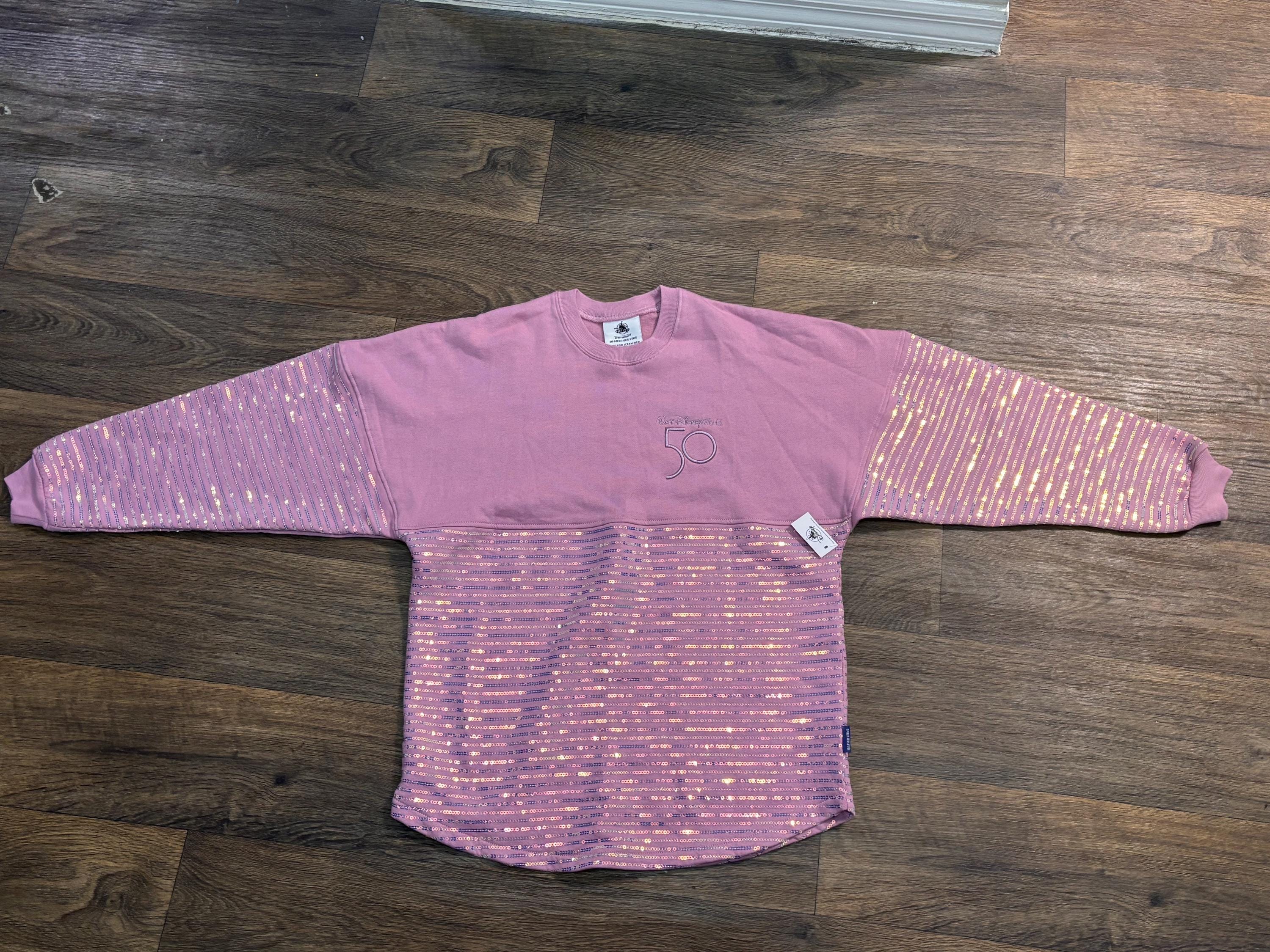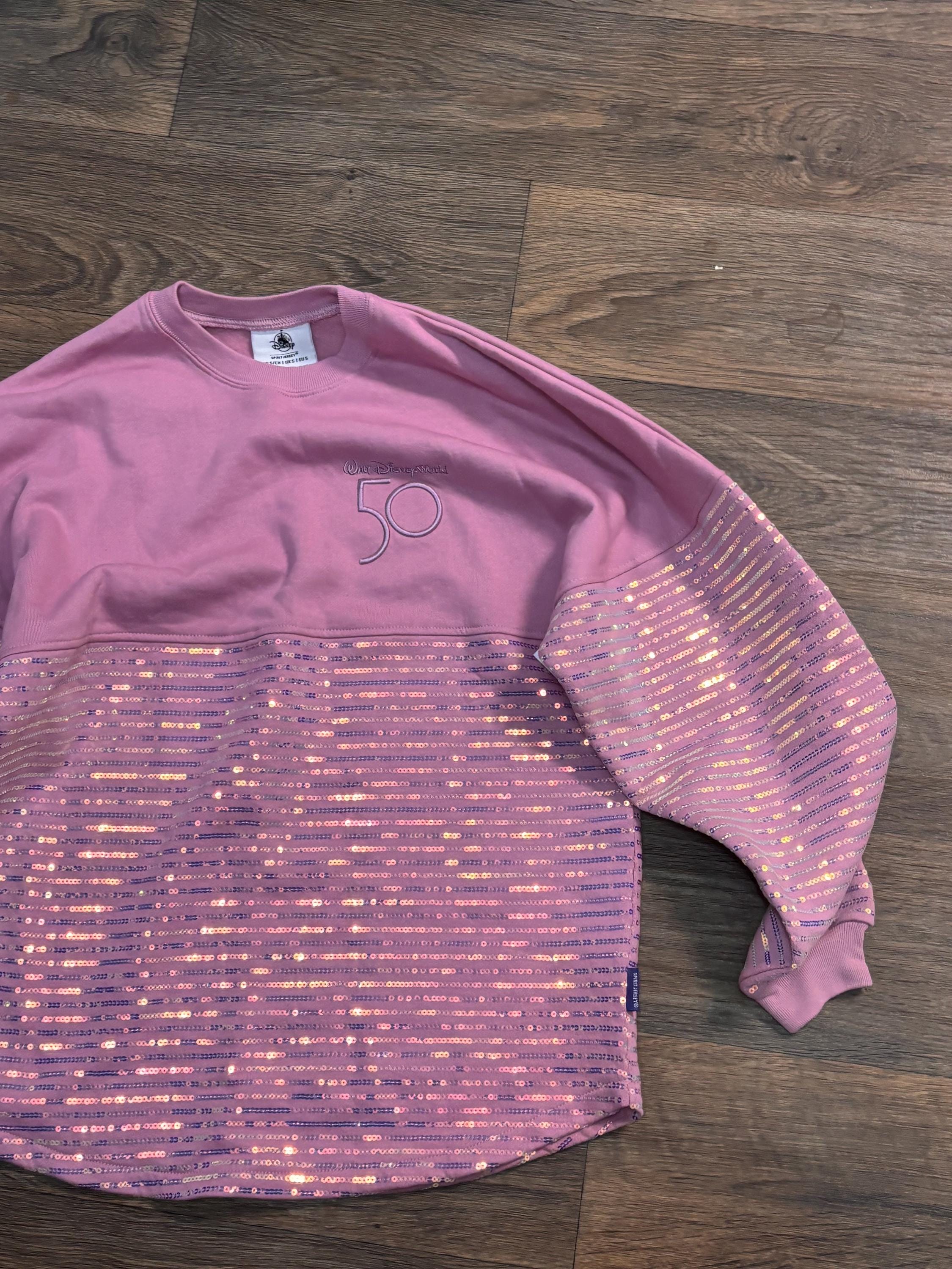 VISIT jaxinabox.com FOR ALL OUR LISTINGS!Disney Parks WDW 50th Anniversary Pink Iridescent Sequin Spirit Jersey XL Extra Large Adult Sweatshirt Seeater Shirt Pullover