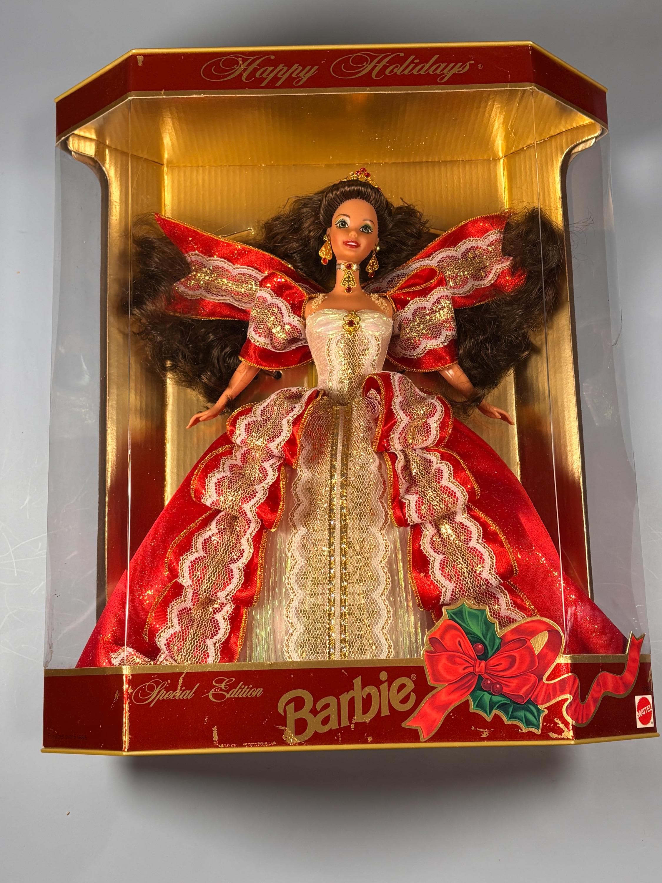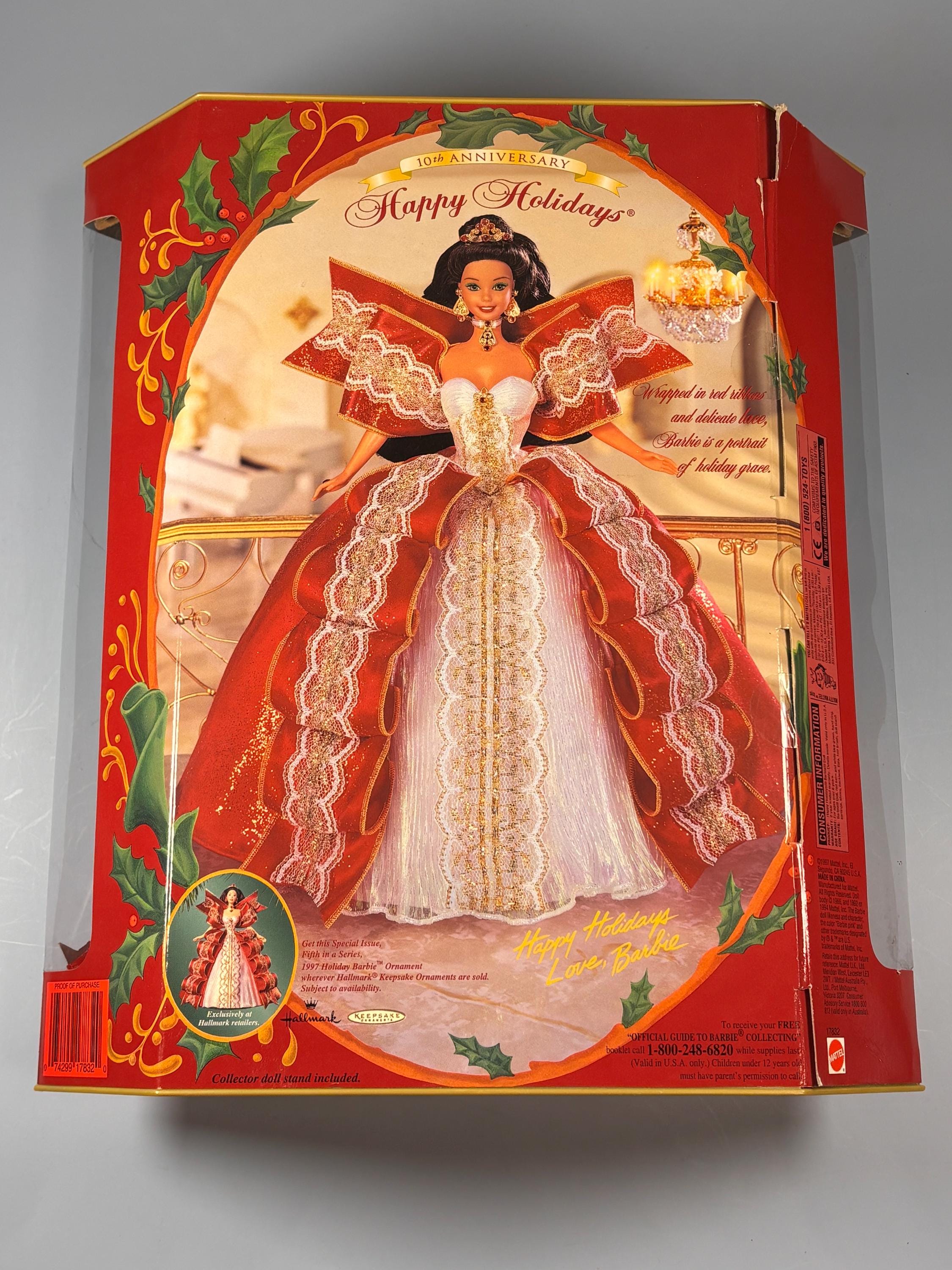 VISIT jaxinabox.com FOR ALL OUR LISTINGS!1997 Happy Holidays Special Edition Barbie Doll Mattel No. 17832 Christmas Rare Gold Background