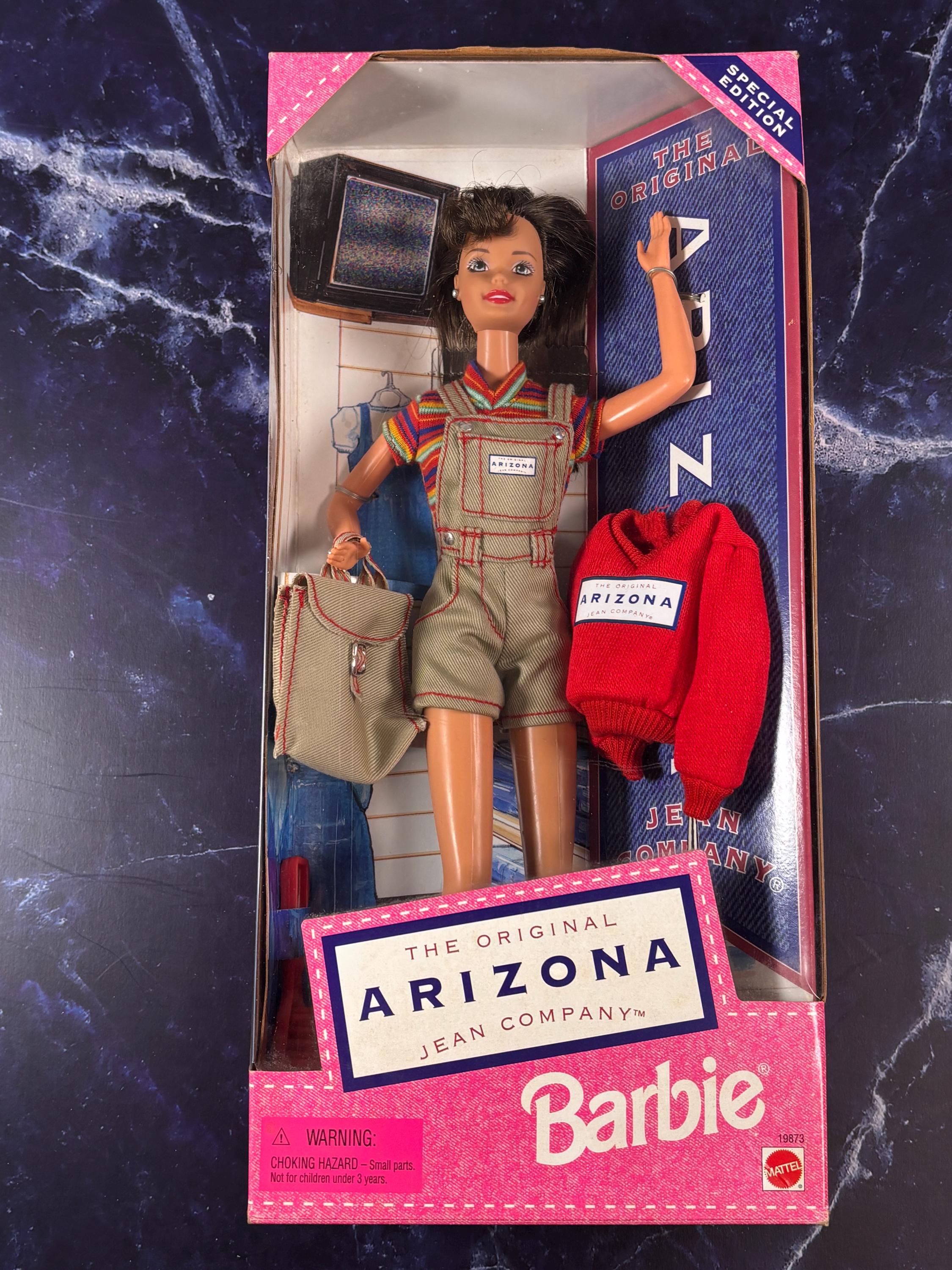 VISIT jaxinabox.com FOR ALL OUR LISTINGS!1997 The Original Arizona Jean Company Barbie Tan Overalls Brunette #19873 New